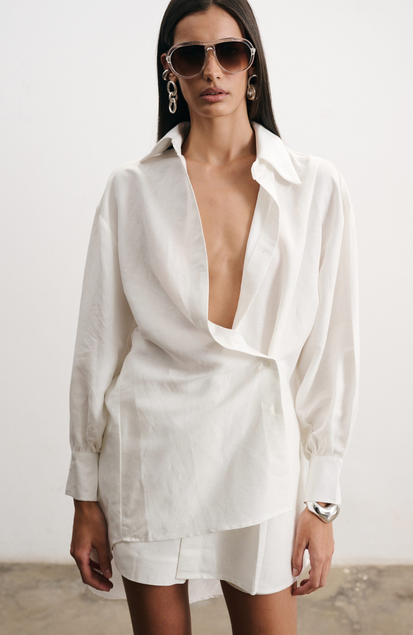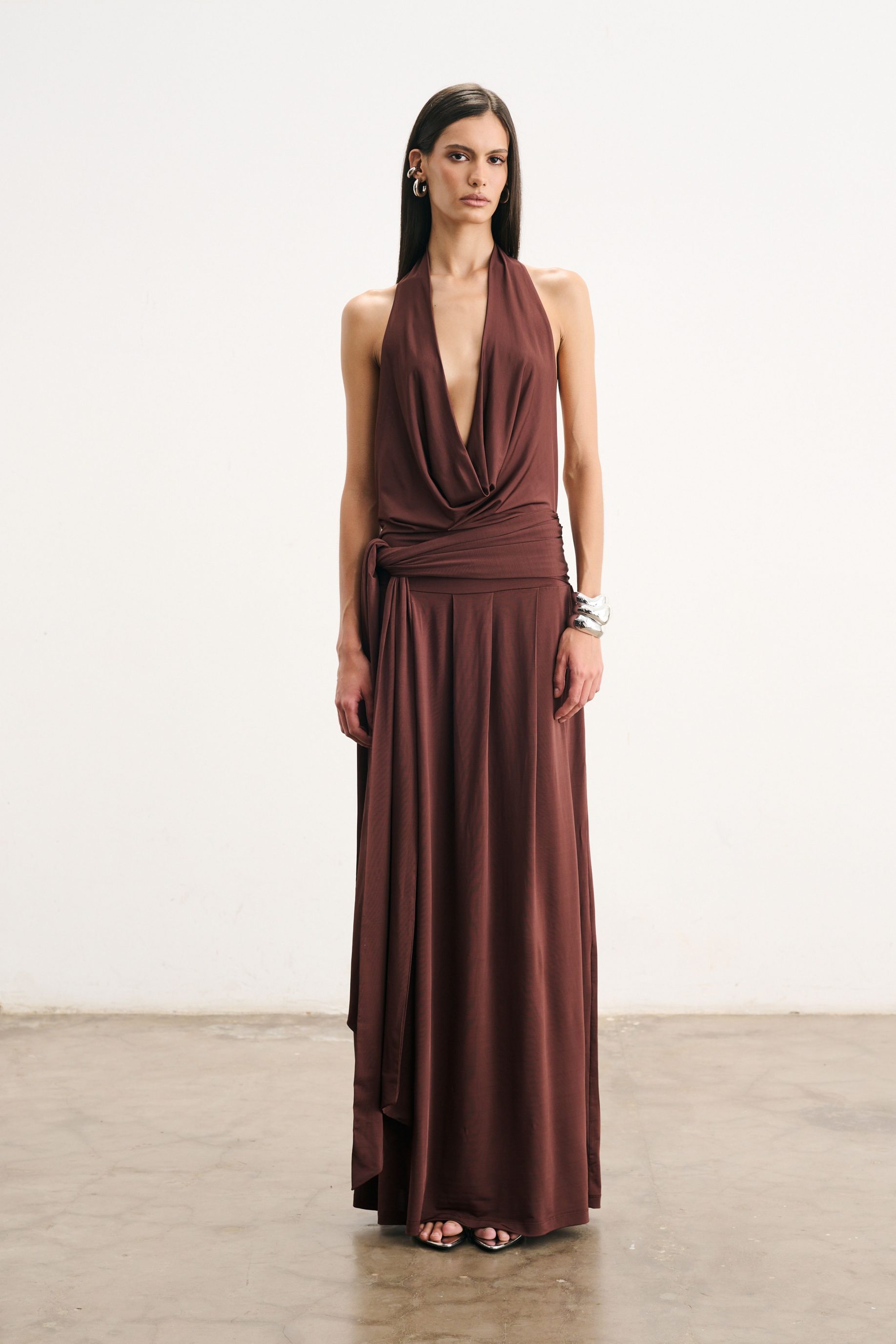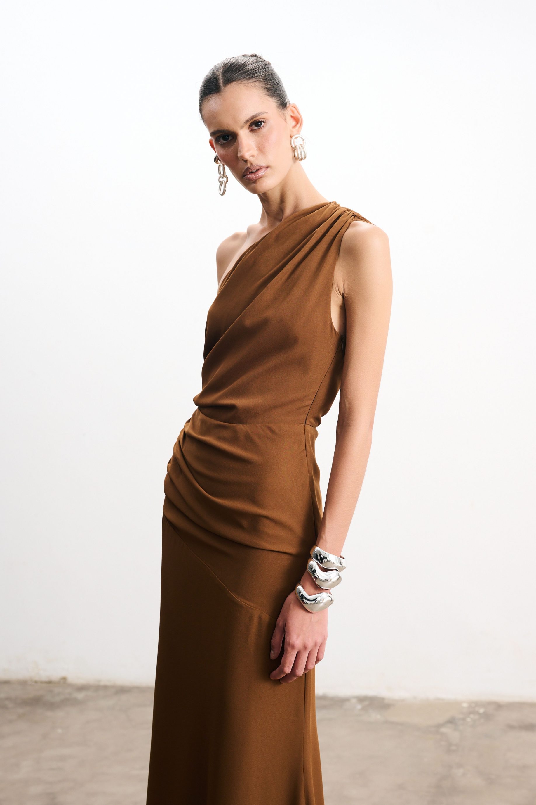 Vestido em musseline marrom, com alça única e decote de um ombro só. O detalhe drapeado na lateral valoriza a silhueta e adiciona movimento ao caimento, enquanto as costas abertas trazem sensualidade com sofisticação. Amarração lateral que cria uma cauda fluida e traz ainda mais presença à peça.