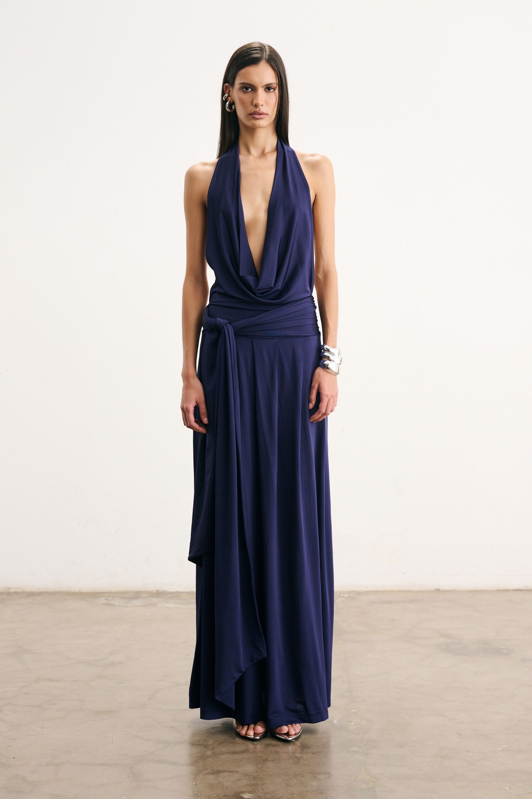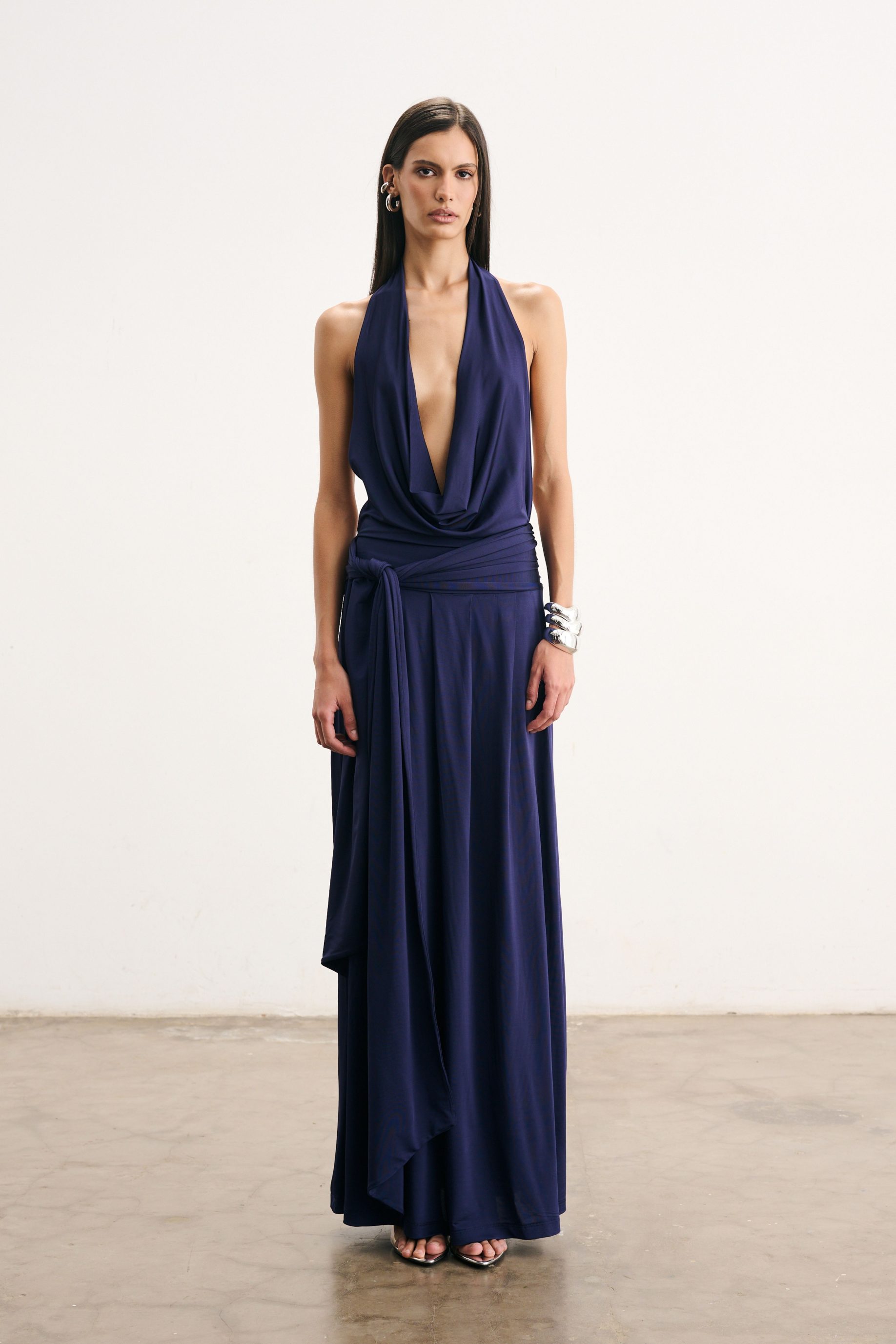 Vestido em Jersey de viscose, marinho, com decote profundo em “V” e amarração frontal que realça a cintura com elegância. A modelagem soltinha e o tecido leve proporcionam movimento, enquanto as costas abertas e o caimento suave trazem um toque de sensualidade sofisticada. Ideal para eventos noturnos ou ocasiões especiais que pedem um visual marcante e moderno.