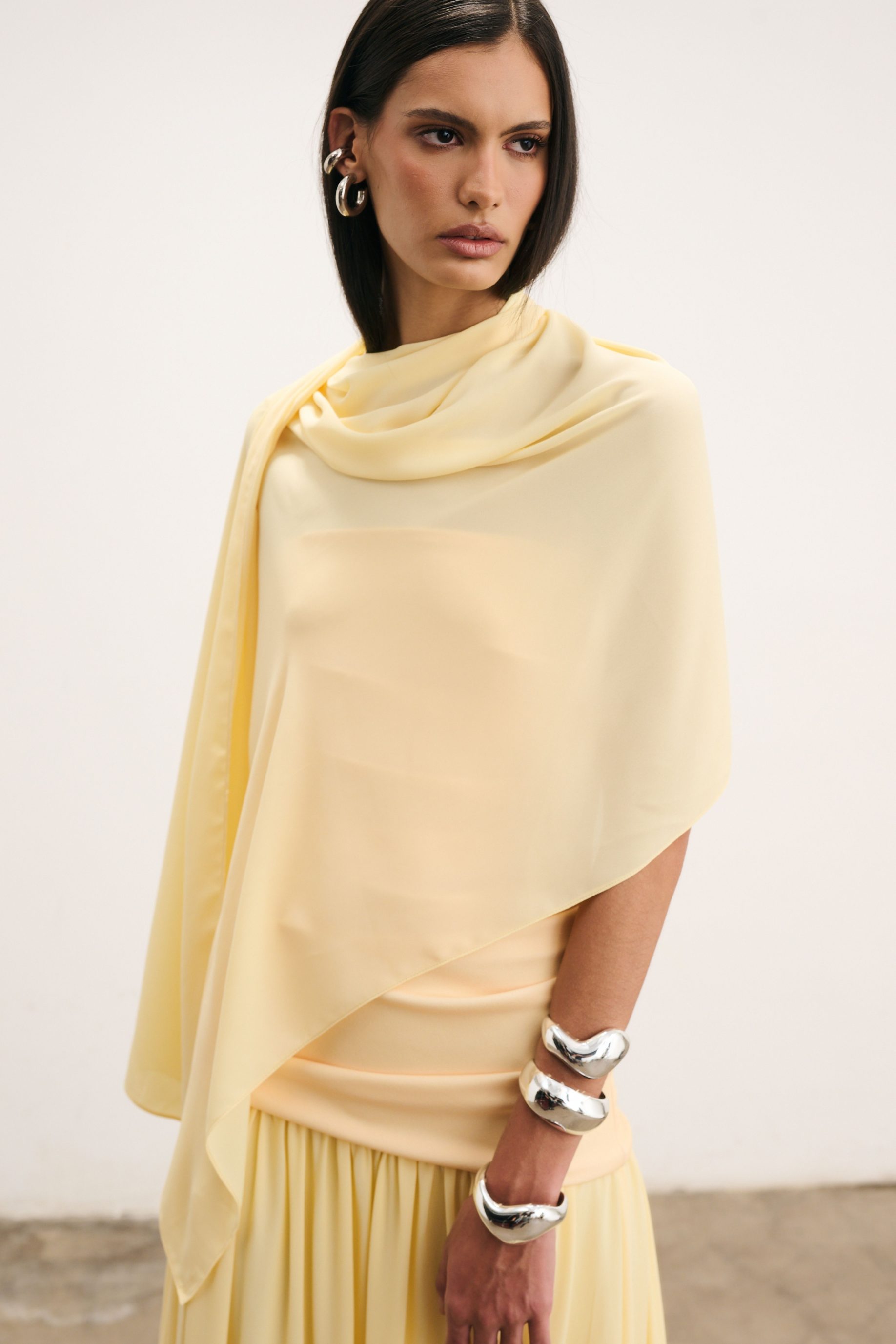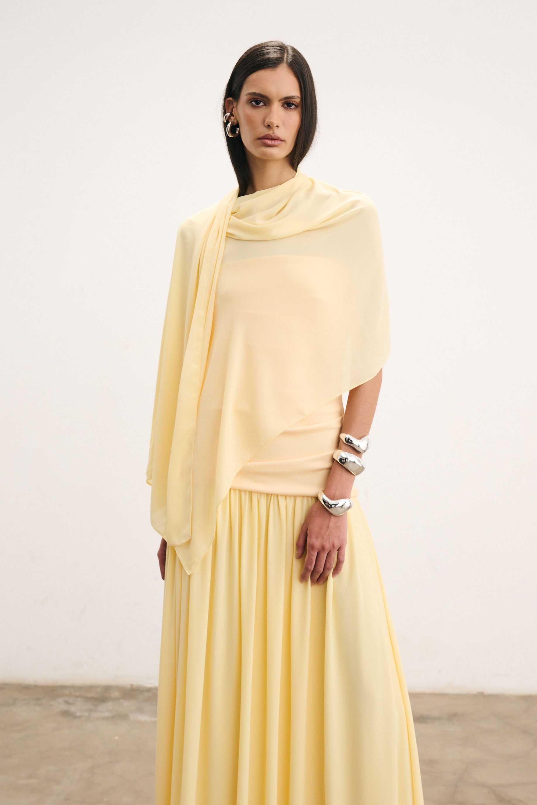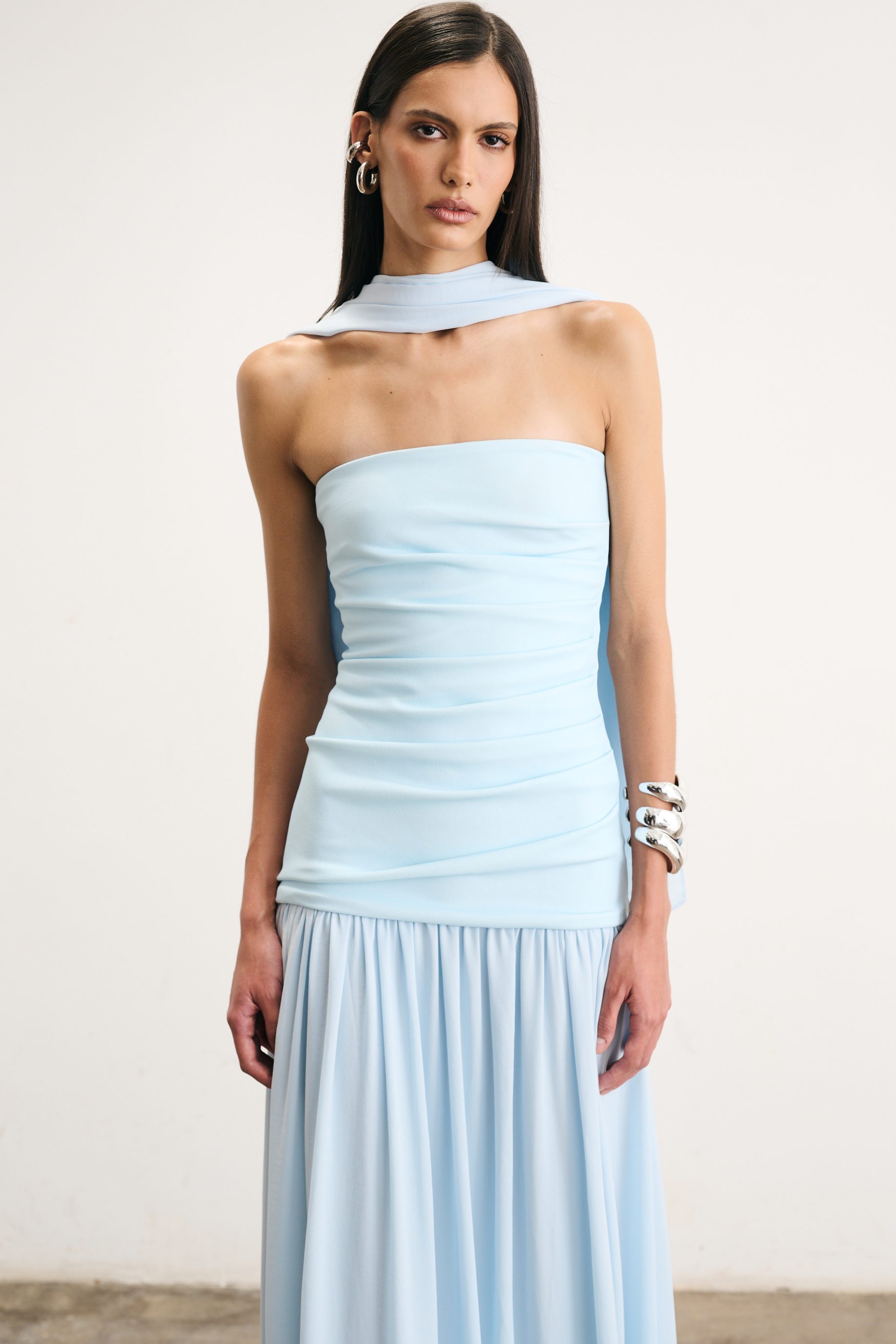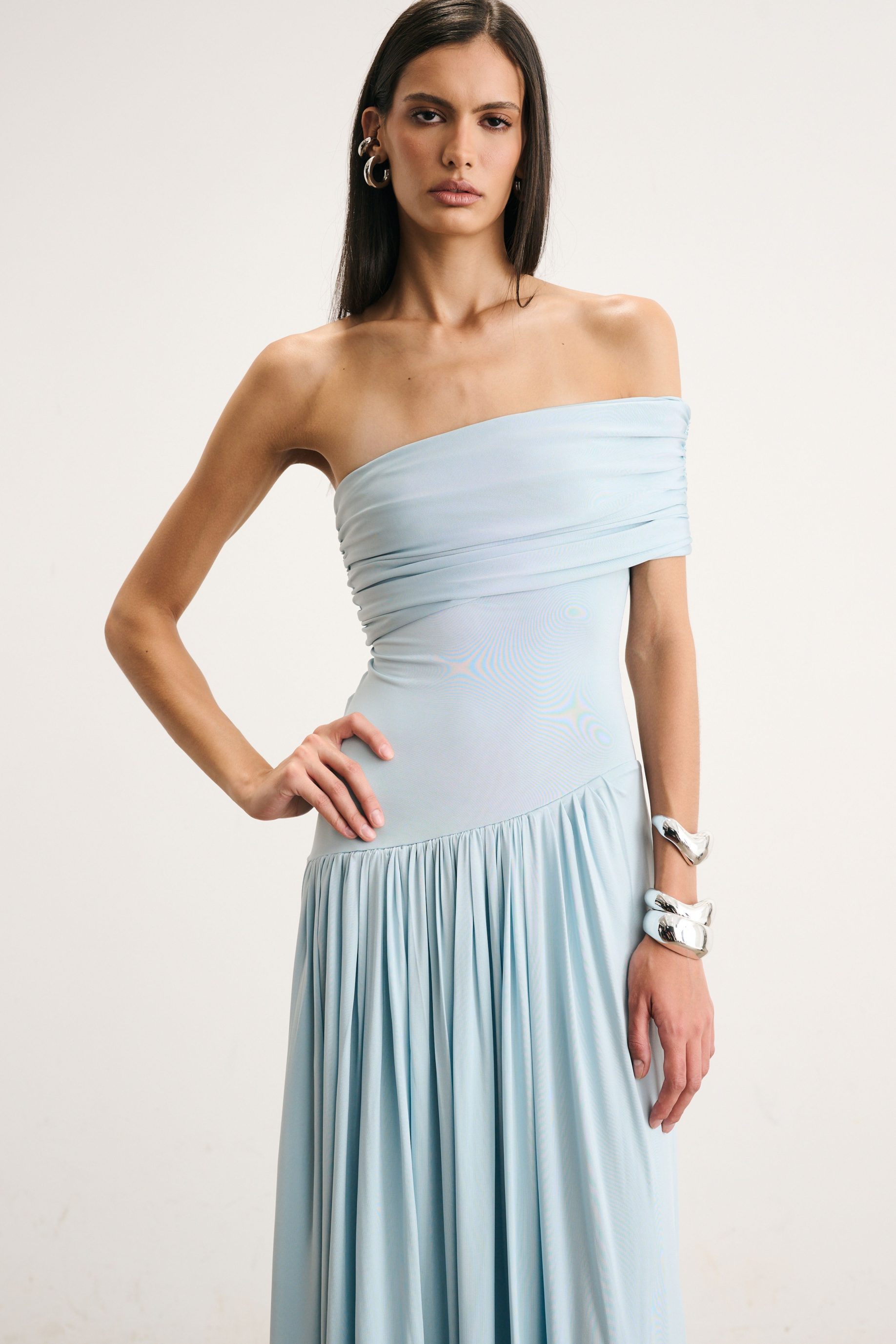 Vestido confeccionado em Jersey de viscose, na cor azul claro. O modelo ombro a ombro possui drapeado na região do busto, criando um visual delicado e sofisticado. A saia ampla com franzido traz movimento e elegância, equilibrando conforto e feminilidade. Uma peça atemporal, perfeita para ocasiões especiais.