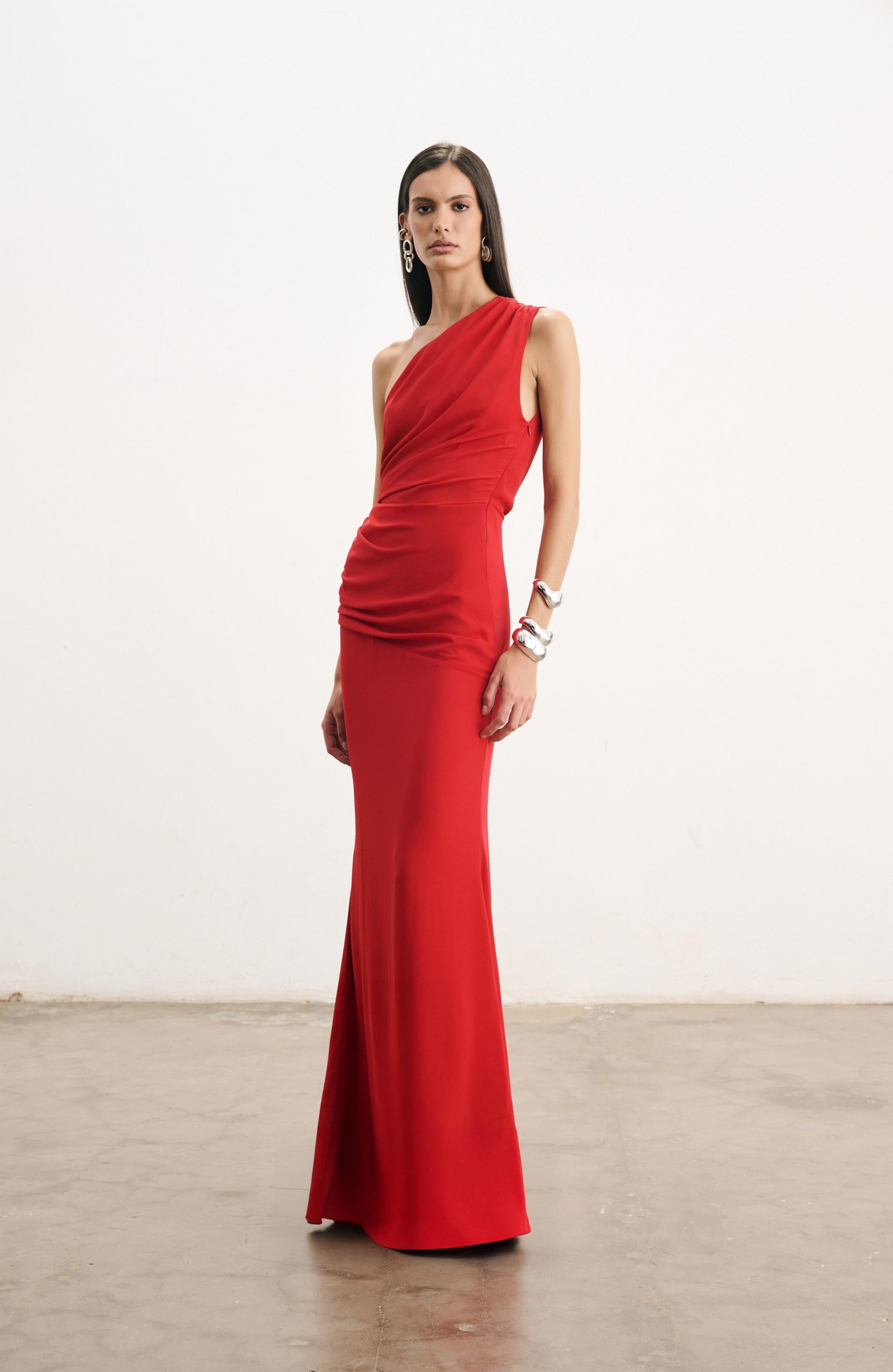 Vestido em musseline vermelho, com alça única e decote de um ombro só. O detalhe drapeado na lateral valoriza a silhueta e adiciona movimento ao caimento, enquanto as costas abertas trazem sensualidade com sofisticação. Amarração lateral que cria uma cauda fluida e traz ainda mais presença à peça.