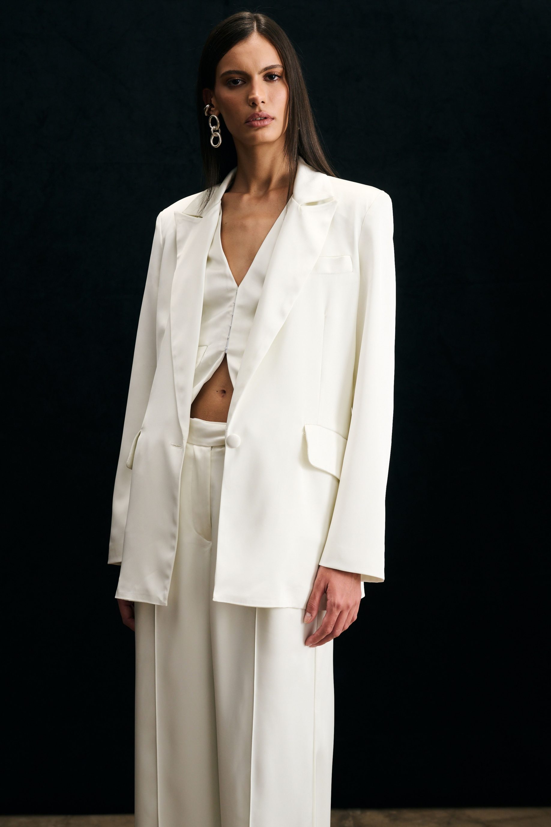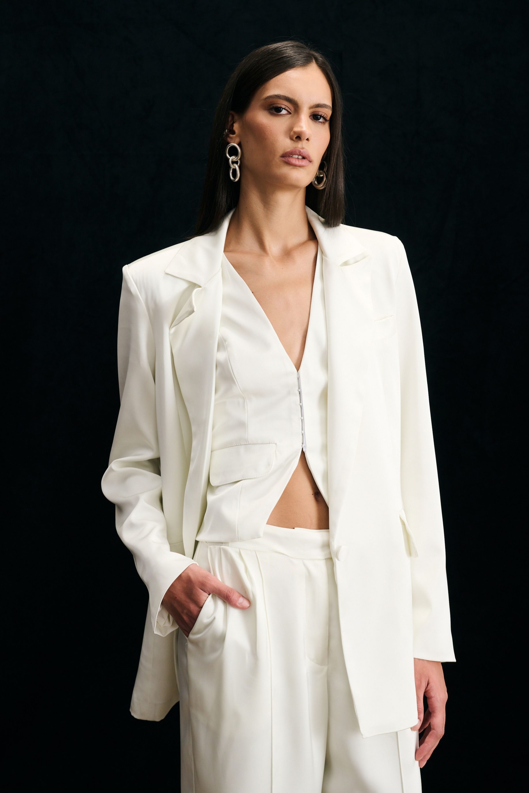 Blazer alongado em cetim encorpado, modelagem reta e oversized. Possui lapela clássica, bolsos laterais, fechamento frontal por botão forrado e acabamento interno de alta qualidade. Uma peça atemporal que une elegância e versatilidade.