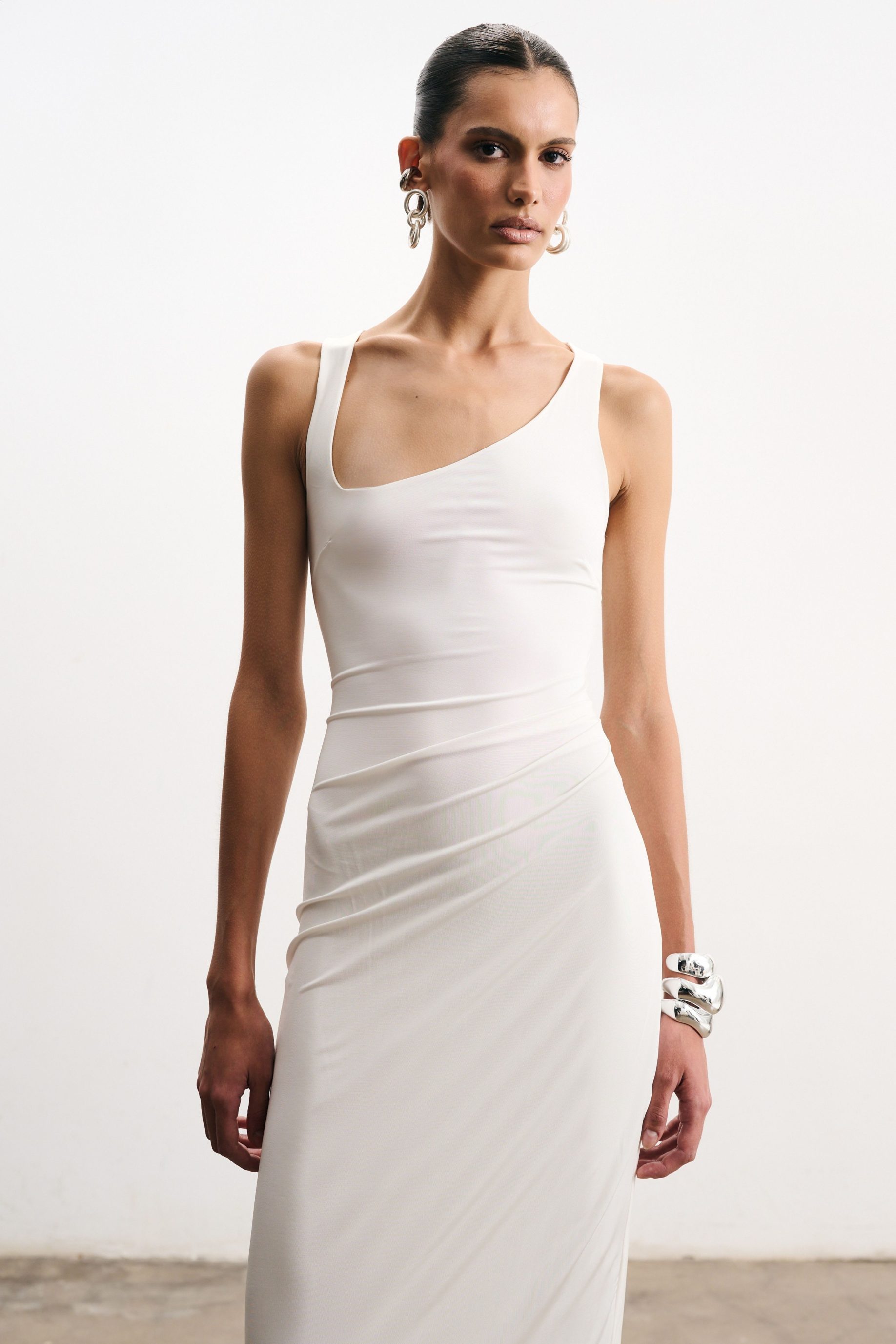 Vestido longo em Jersey de viscose off-white, todo forrado no mesmo tecido. Com decote assimétrico, o modelo realça o colo e alonga a silhueta com sofisticação.
