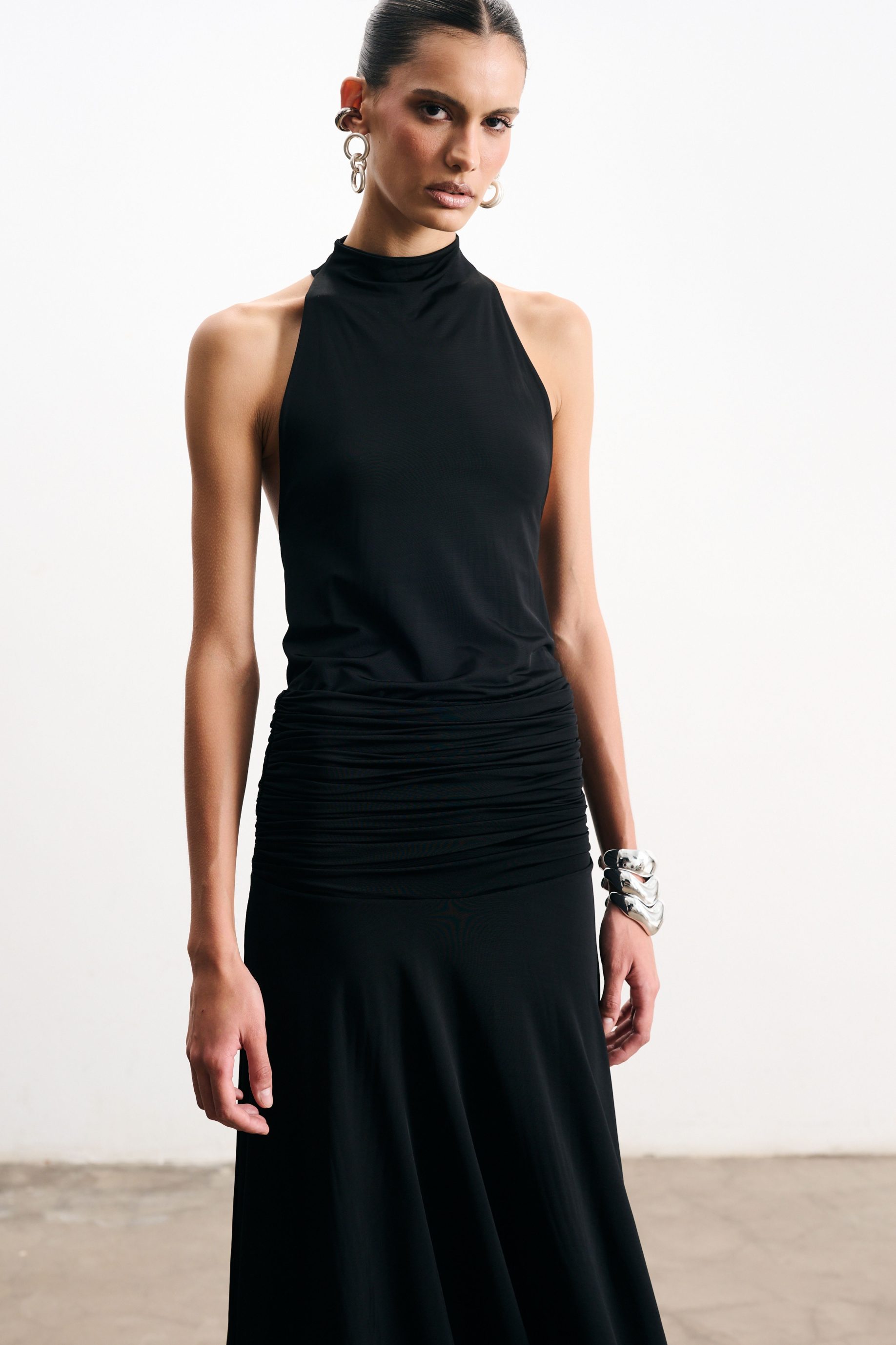 Vestido longo em jersey preto, todo forrado no mesmo tecido. Modelagem fluida com costas abertas e amarração delicada na cintura, valorizando as curvas de forma sutil e feminina.