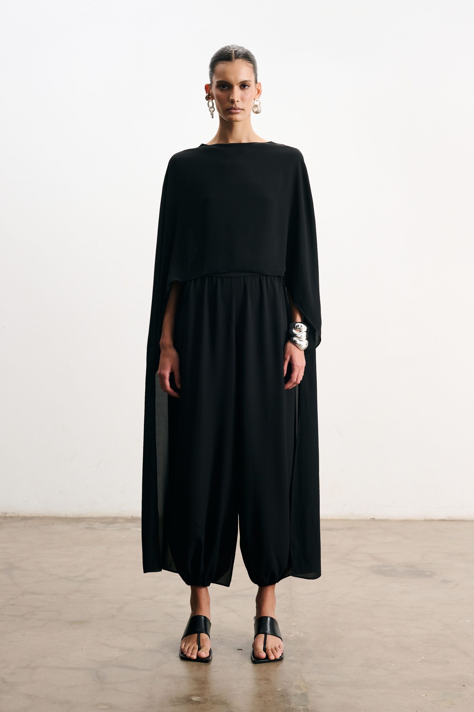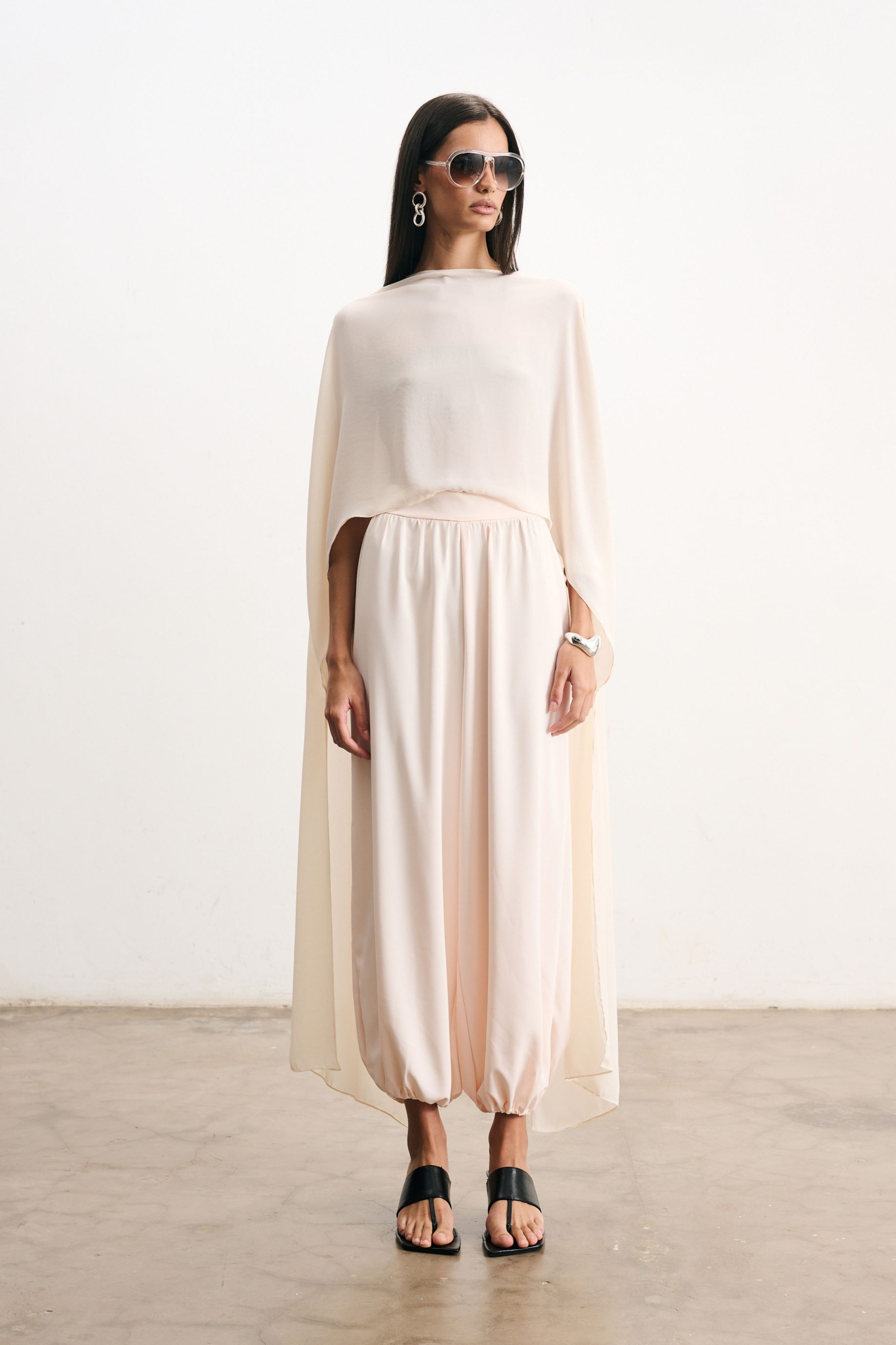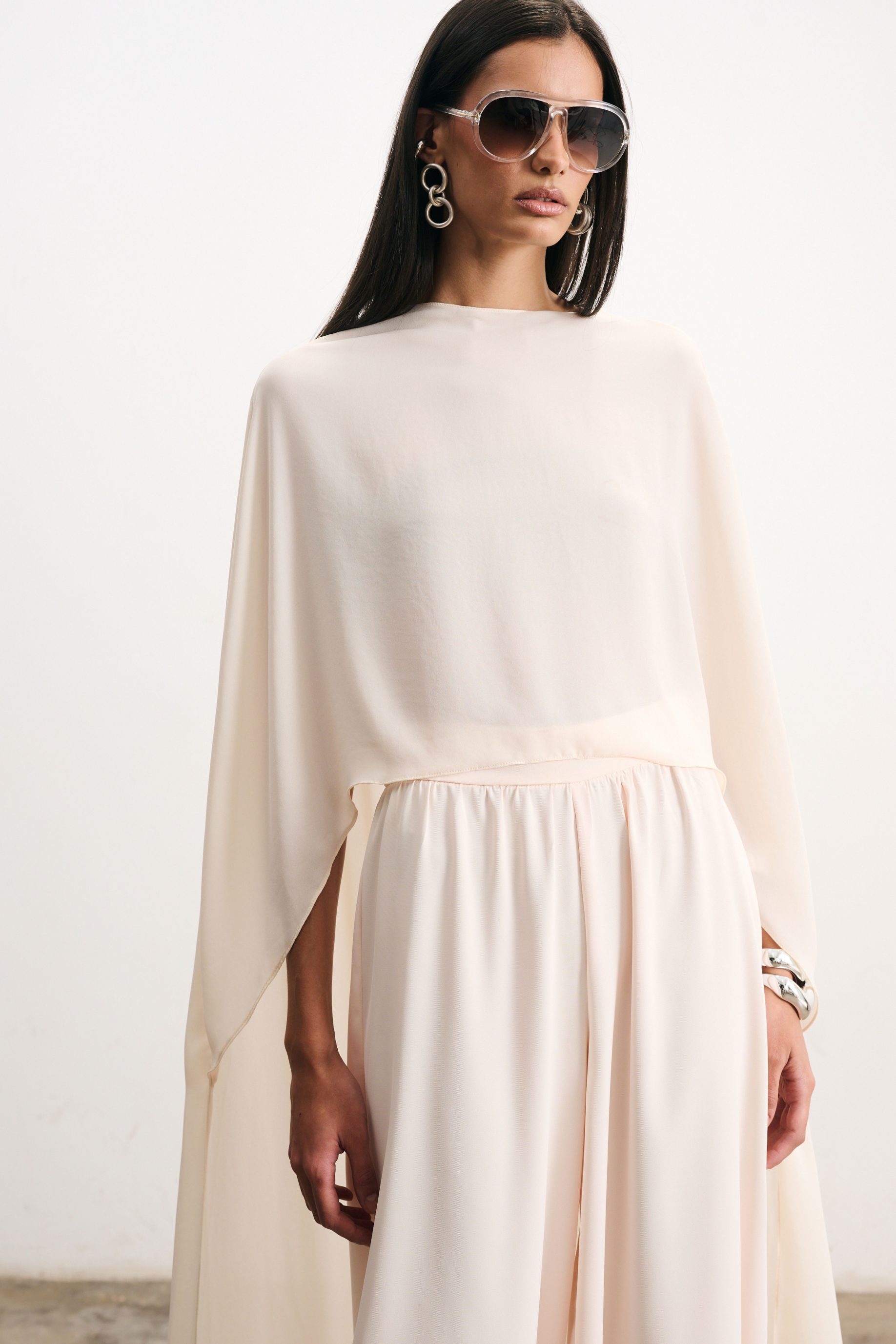 Blusa em crepe fino na cor pérola. Modelagem reta e caimento fluido. Possui mangas amplas que se prolongam formando uma capa delicada nas costas, criando movimento e elegância. O decote fechado equilibra a fluidez da peça, resultando em uma silhueta moderna e atemporal.