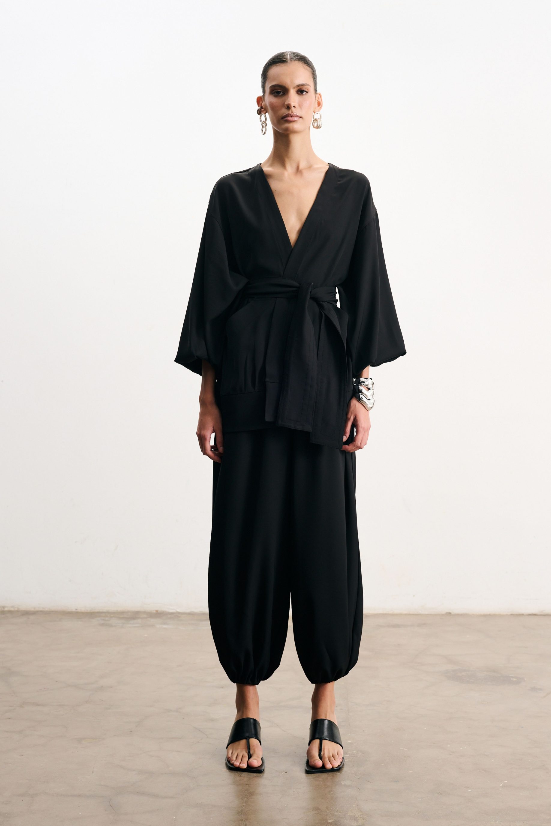 Calça estilo Aladim em crepe fluido com caimento leve e toque acetinado na cor preta. O modelo apresenta cós alto e elástico ajustado nos tornozelos, criando um volume elegante e moderno na silhueta.