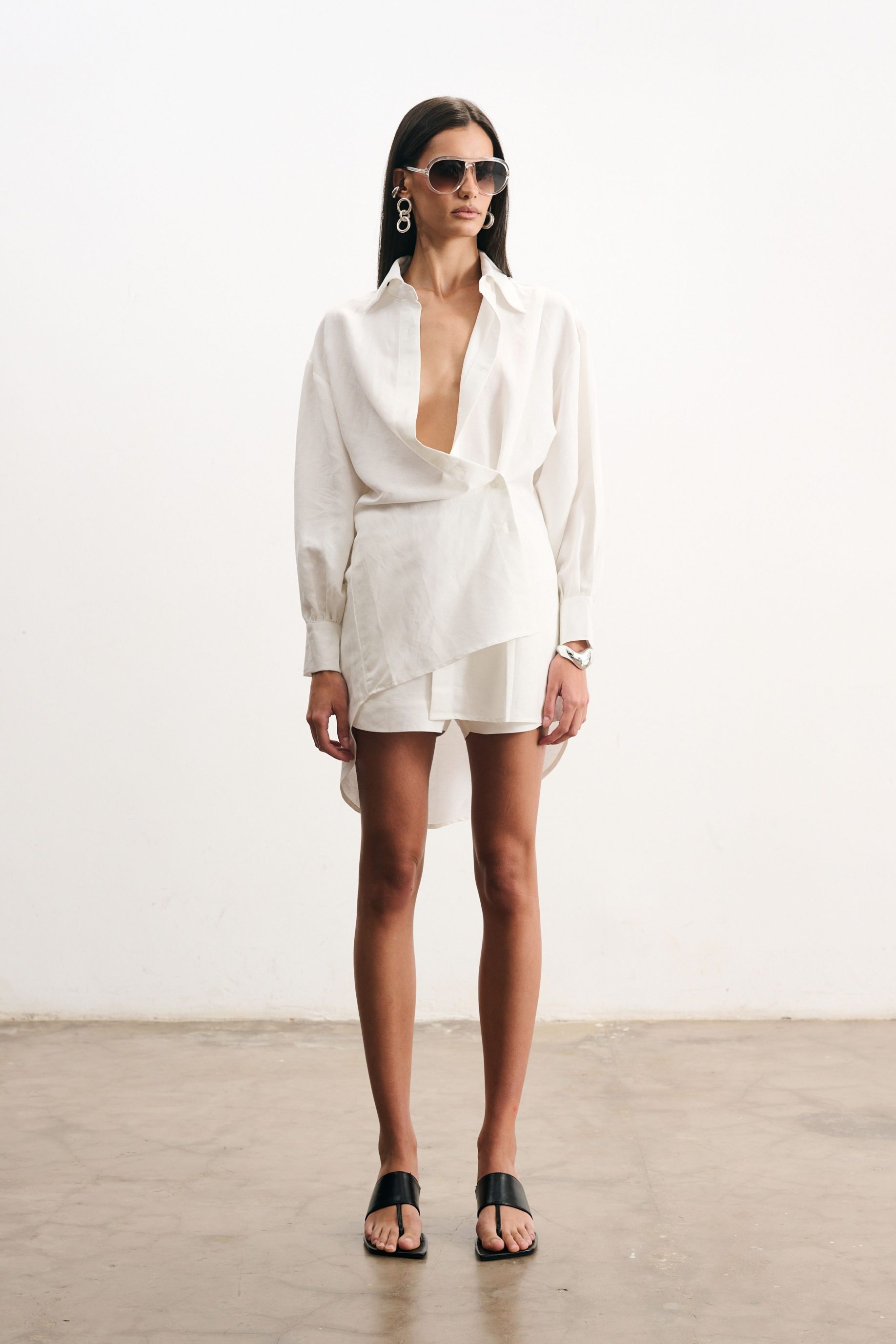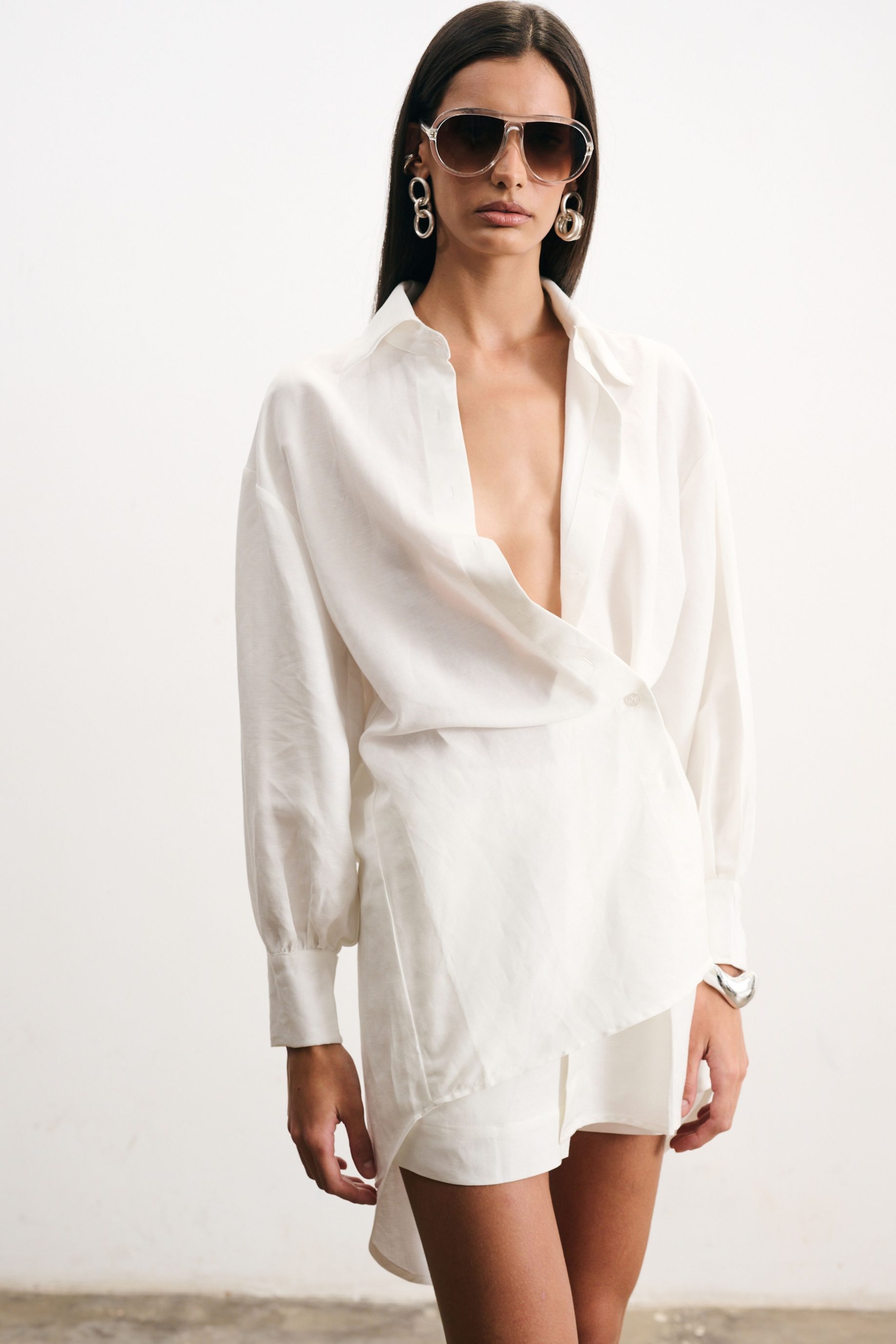 Camisa de linho off-white com modelagem ampla e shape alongado. Possui, além do fechamento tradicional, fechamento transpassado e barra assimétrica, que cria um efeito moderno e despretensioso. As mangas longas com punhos estruturados equilibram a leveza do tecido natural.