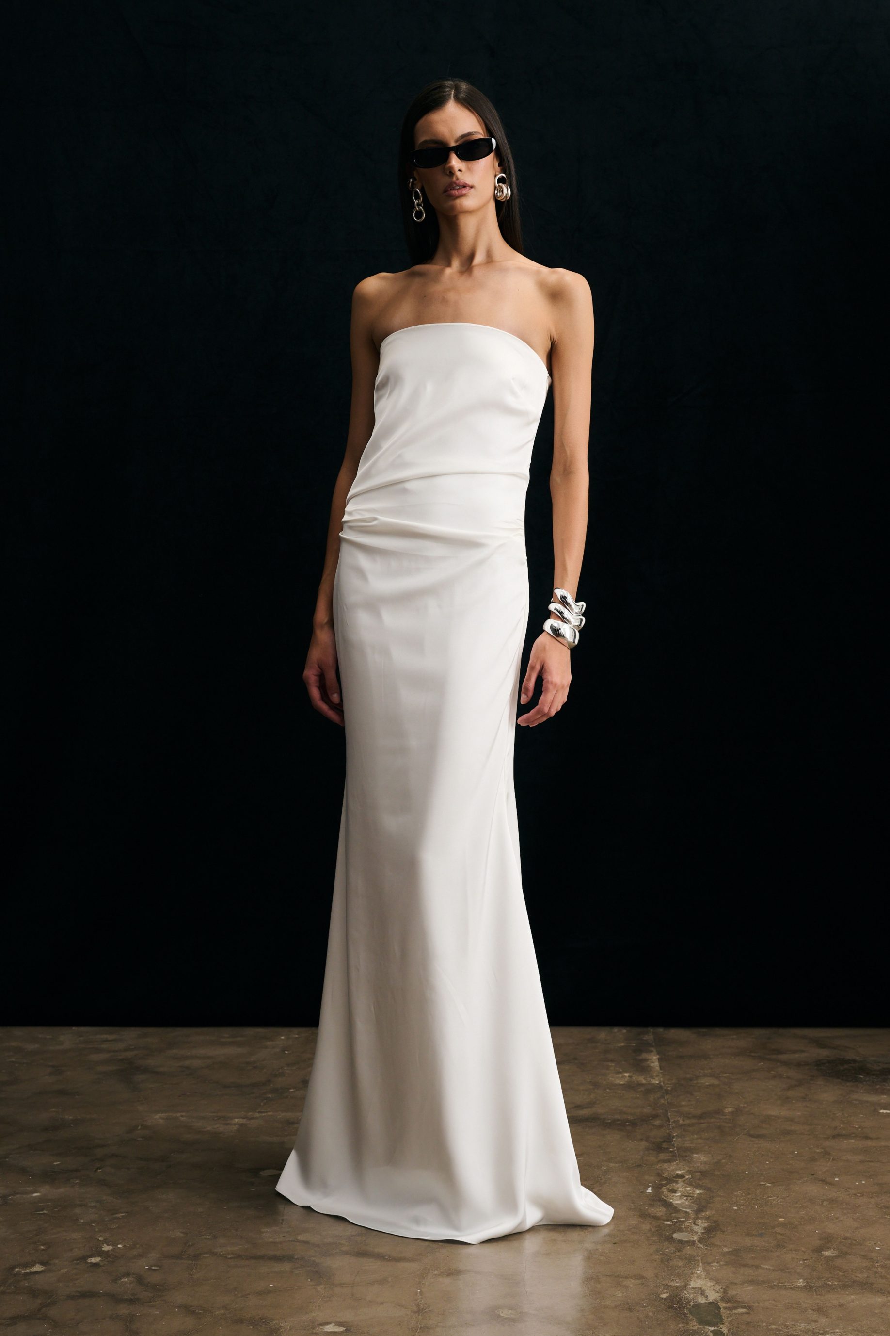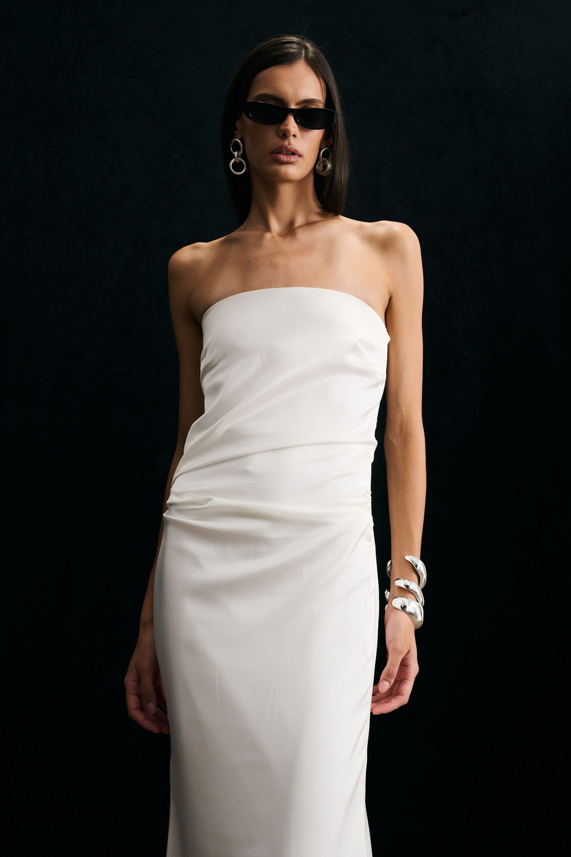 Vestido longo de cetim off white. Decote tomara-que-caia realça o busto e as costas, e drapeado na lateral que modela a silhueta. Possui zíper invisível na lateral.