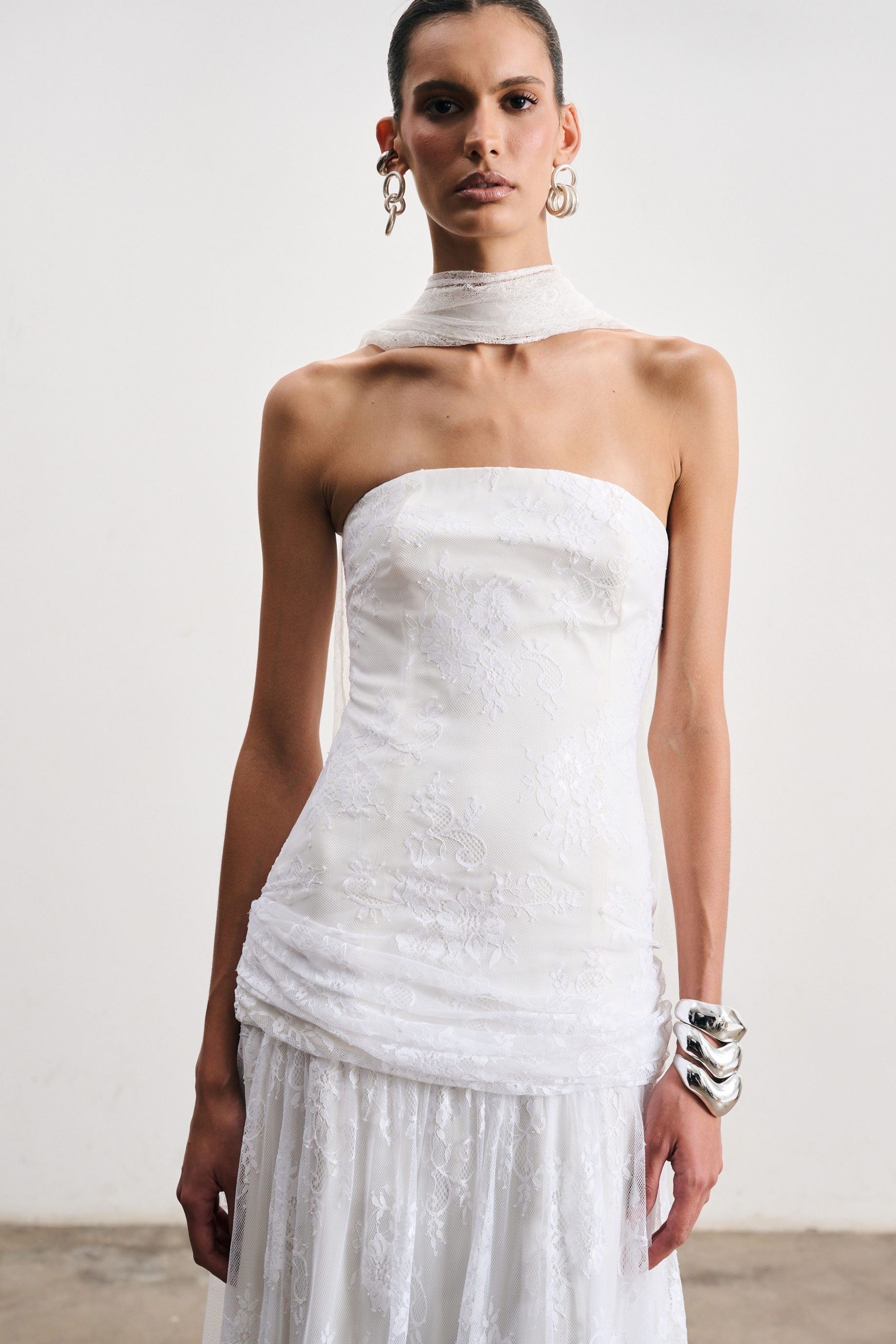 Vestido longo em renda off white, todo forrado, com modelagem tomara-que-caia. O busto ajustado valoriza a silhueta, enquanto a saia fluida em camadas de renda cria movimento e delicadeza. Corpo estruturado com barbatanas. O detalhe drapeado na região do quadril adiciona sofisticação, tornando a peça perfeita para momentos especiais.