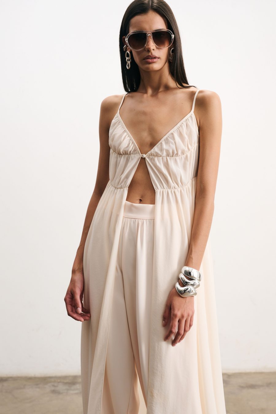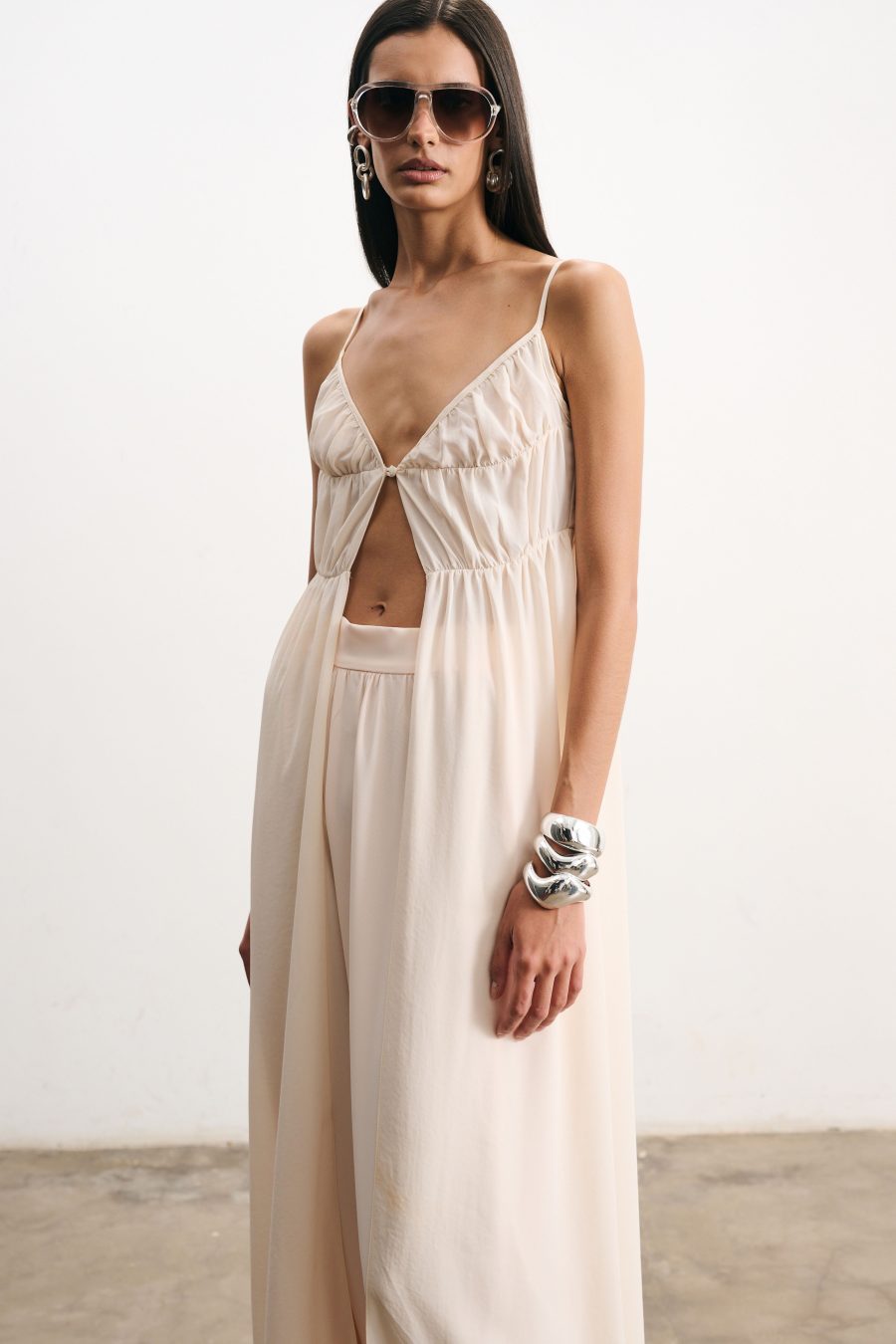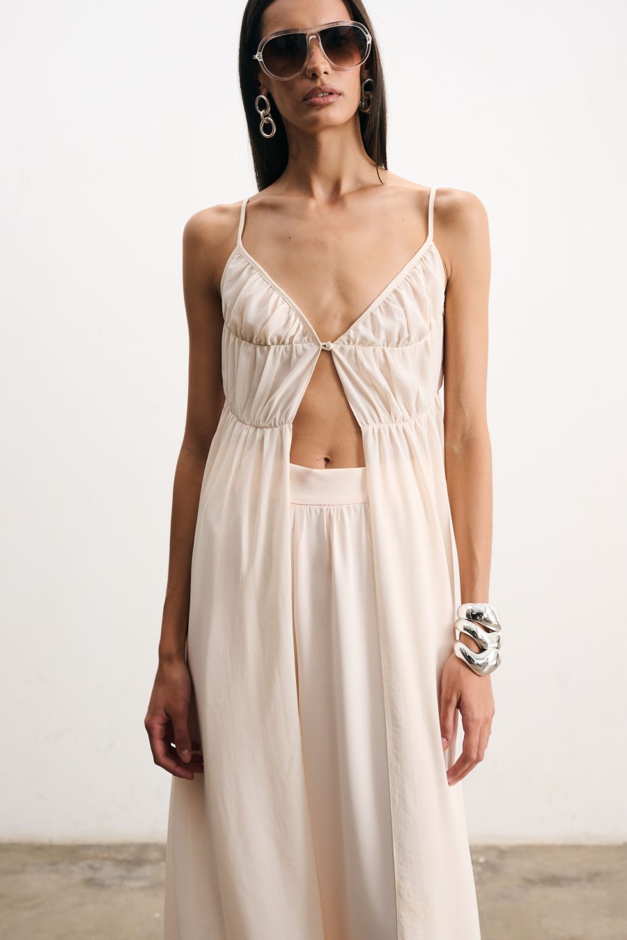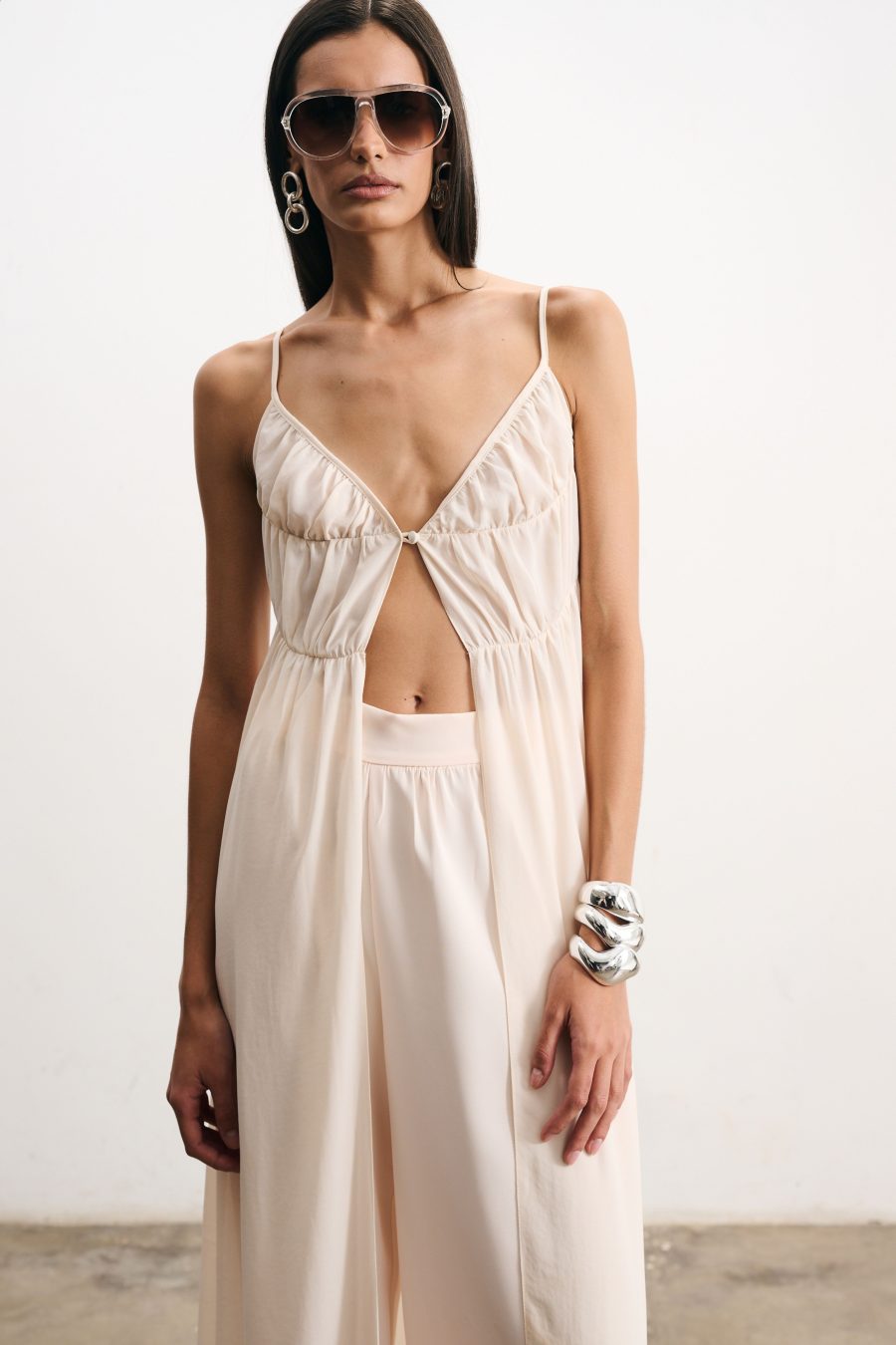 Blusa longa em crepe fino na cor pérola. Alcinhas finas e decote em “V”. O recorte frontal cria um jogo sutil de transparência e movimento, valorizando a silhueta de forma delicada. Possui franzido suave na linha do busto e cintura, caimento solto que confere leveza ao visual.