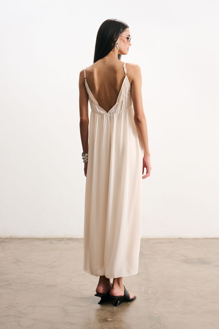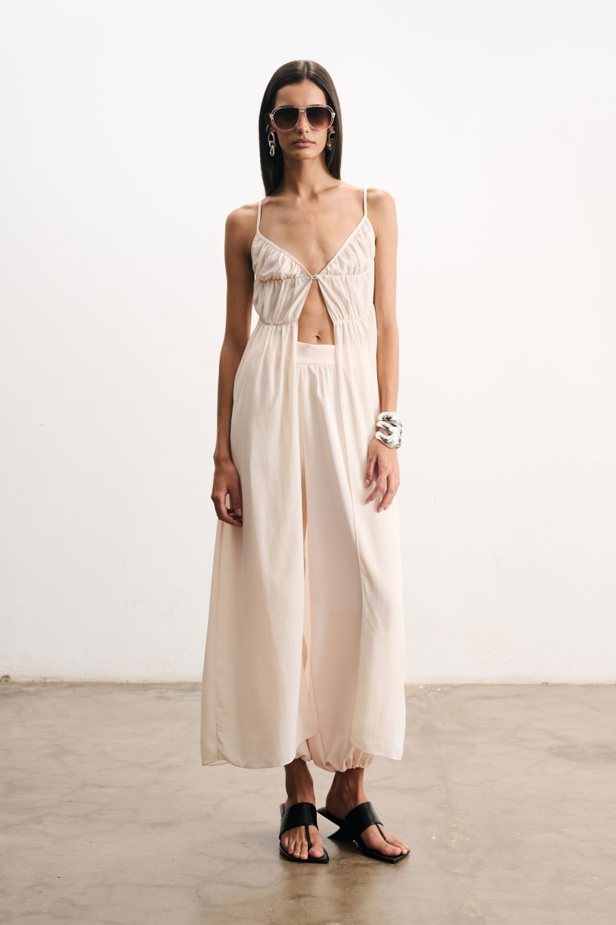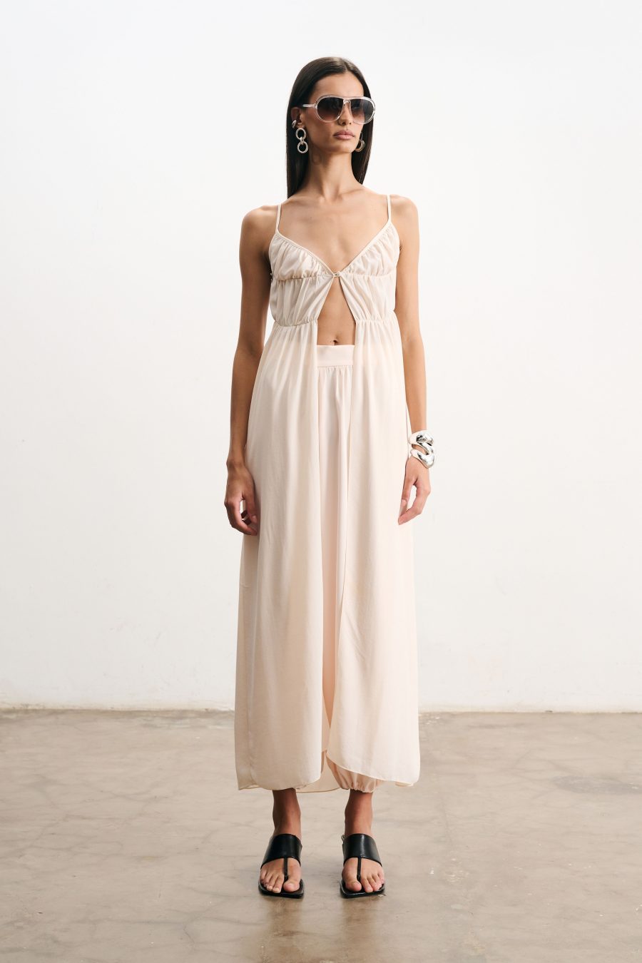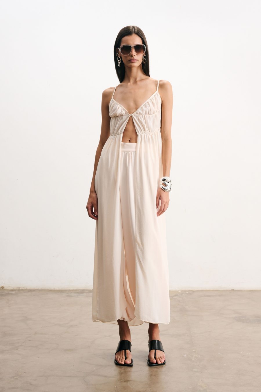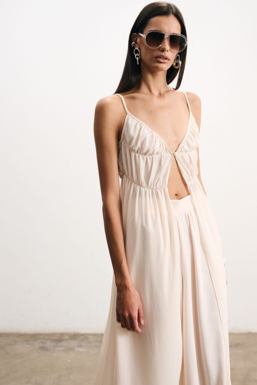 Blusa longa em crepe fino na cor pérola. Alcinhas finas e decote em “V”. O recorte frontal cria um jogo sutil de transparência e movimento, valorizando a silhueta de forma delicada. Possui franzido suave na linha do busto e cintura, caimento solto que confere leveza ao visual.