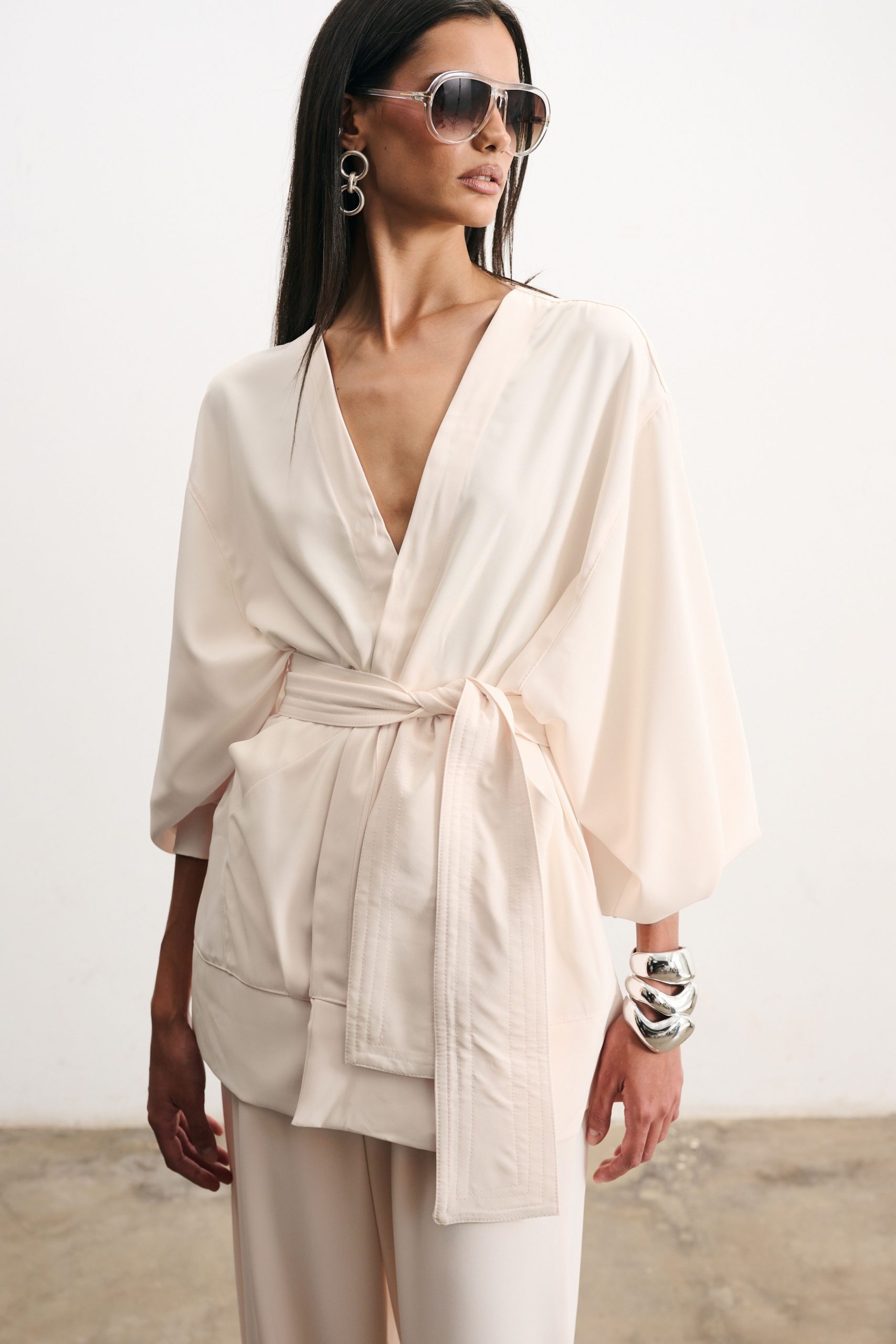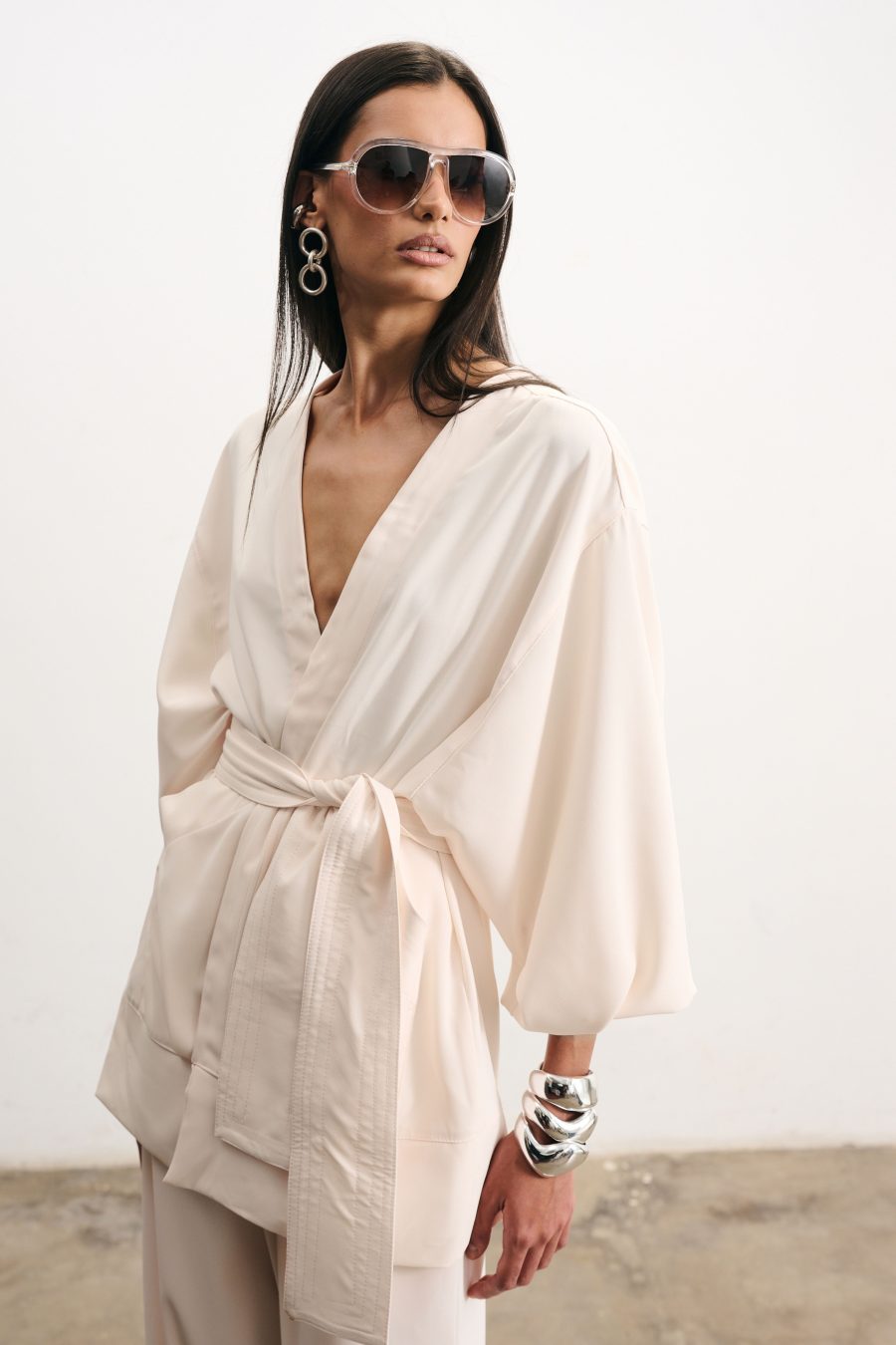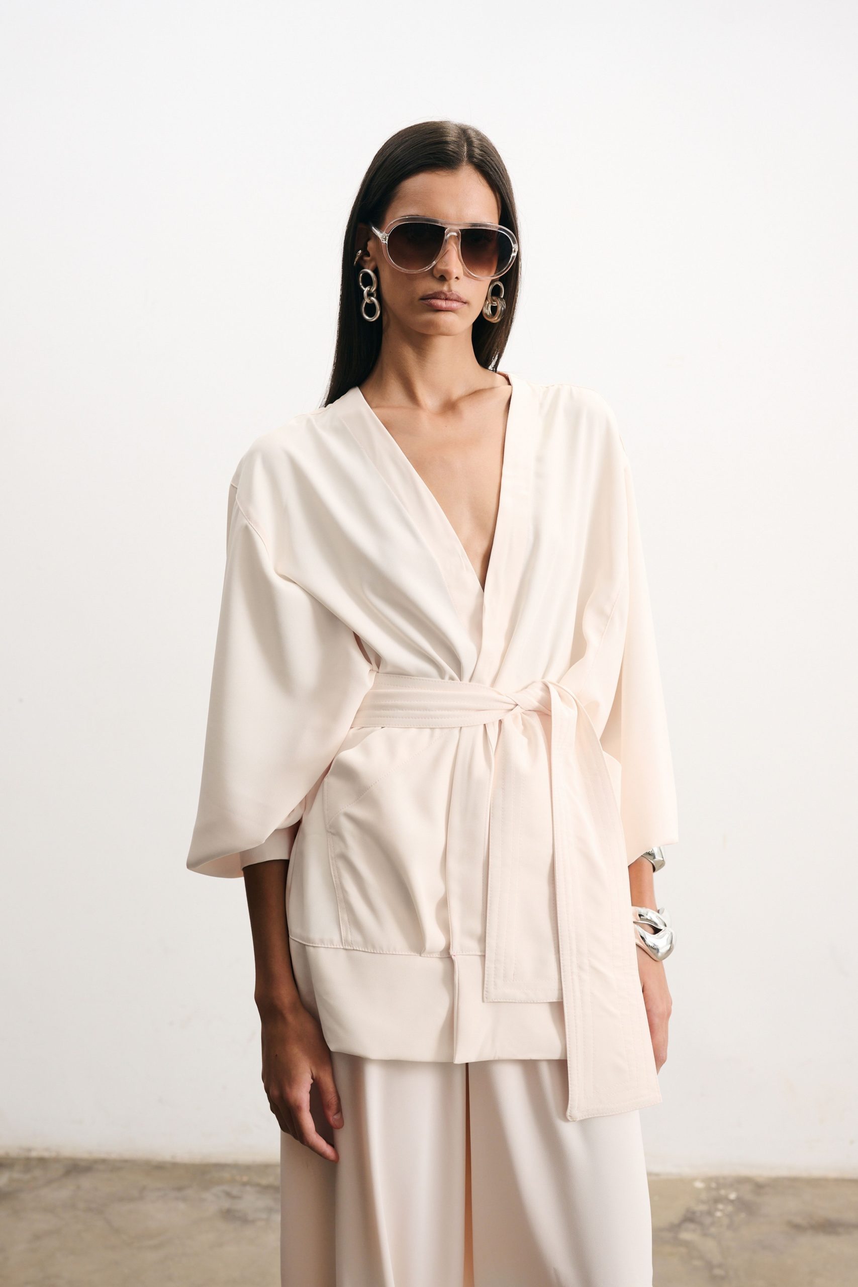 Jaqueta Kimono em crepe pérola. Possui modelagem ampla, com manga comprida e bufante, com bolso embutido com pregas. Acompanha faixa para amarração.