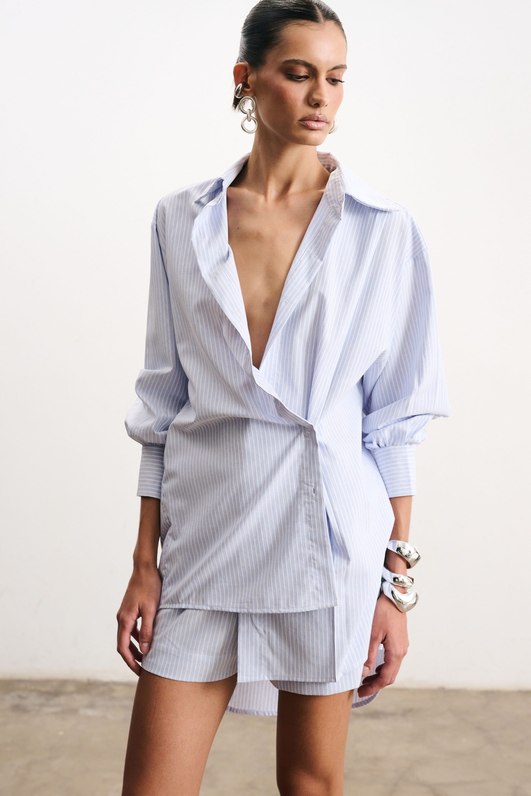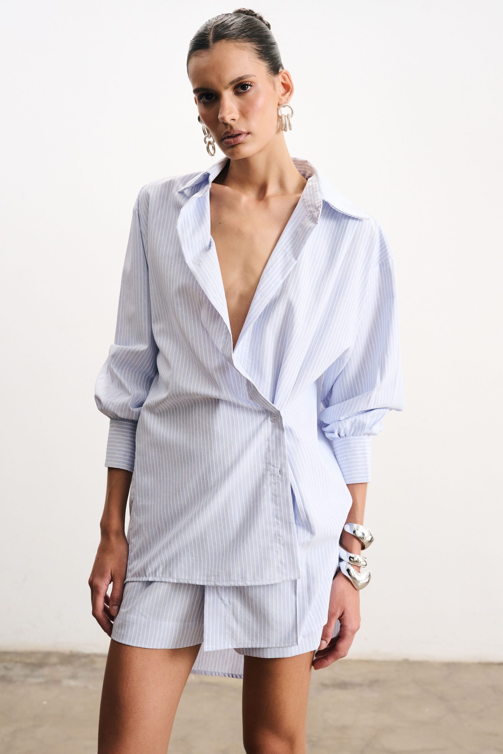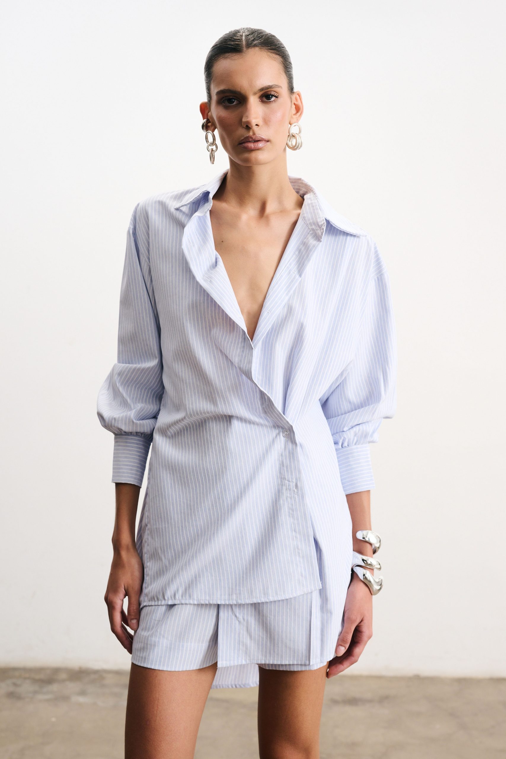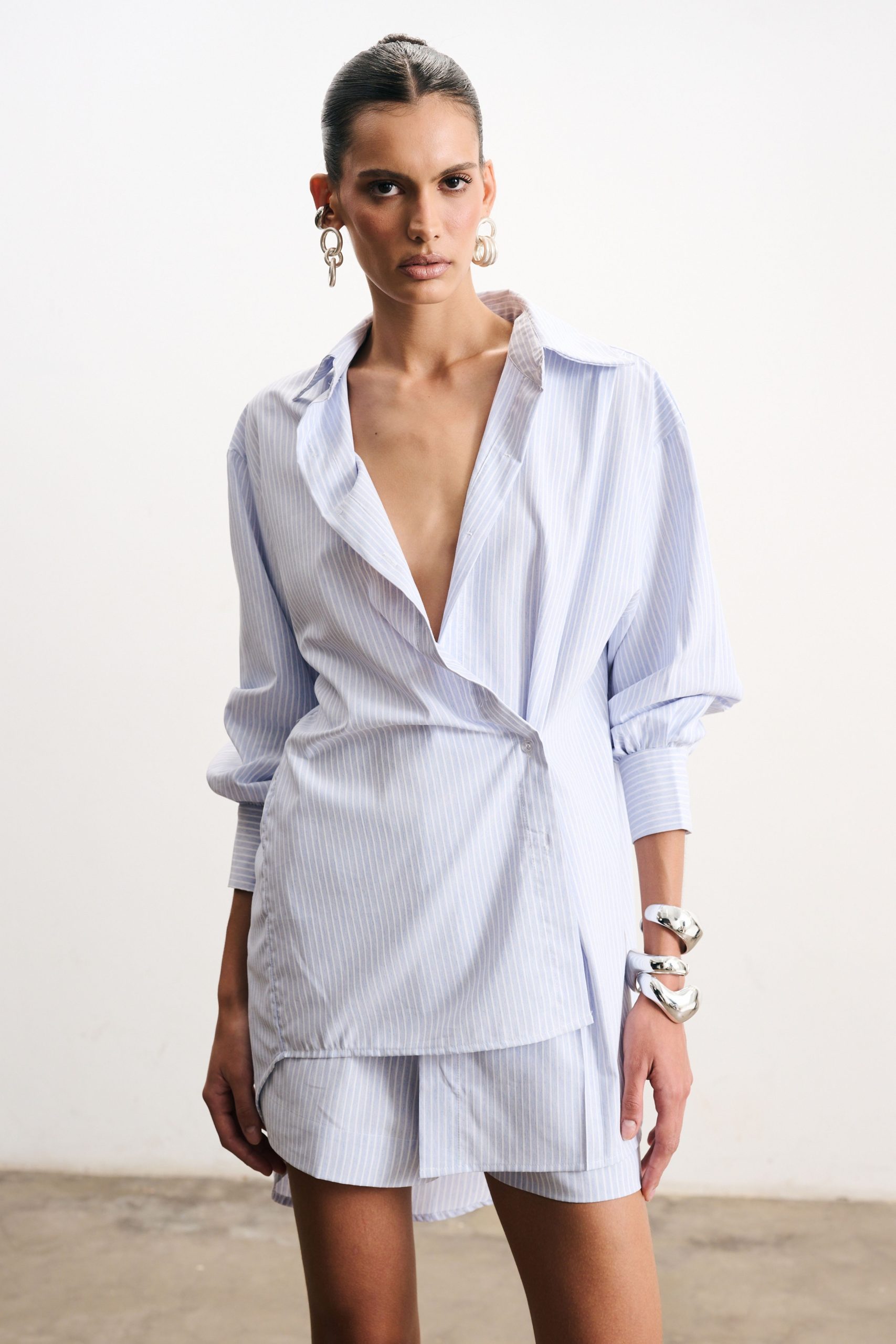 Camisa de linho listrado com modelagem ampla e shape alongado. Possui, além do fechamento tradicional, fechamento transpassado e barra assimétrica, que cria um efeito moderno e despretensioso. As mangas longas com punhos estruturados equilibram a leveza do tecido natural.