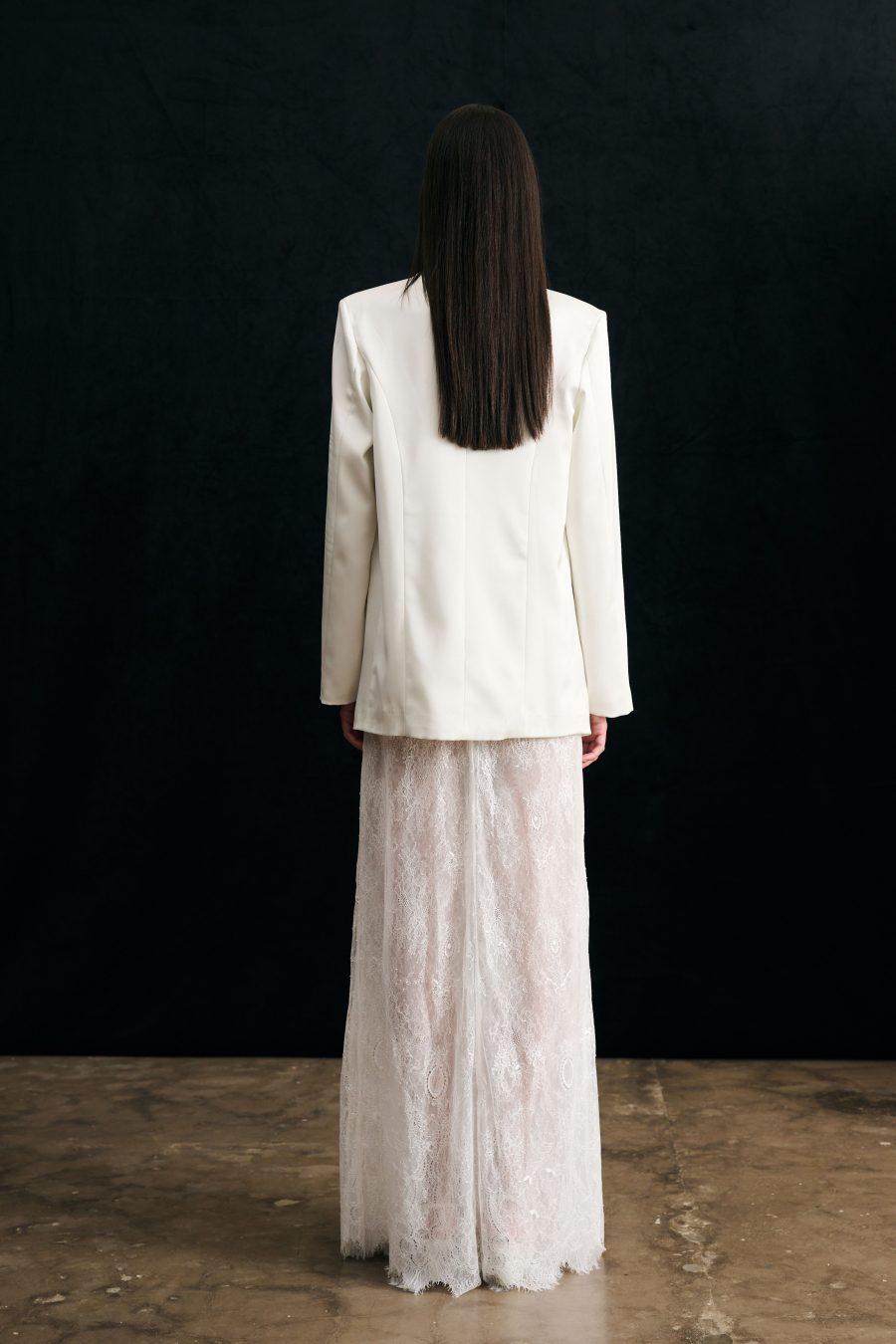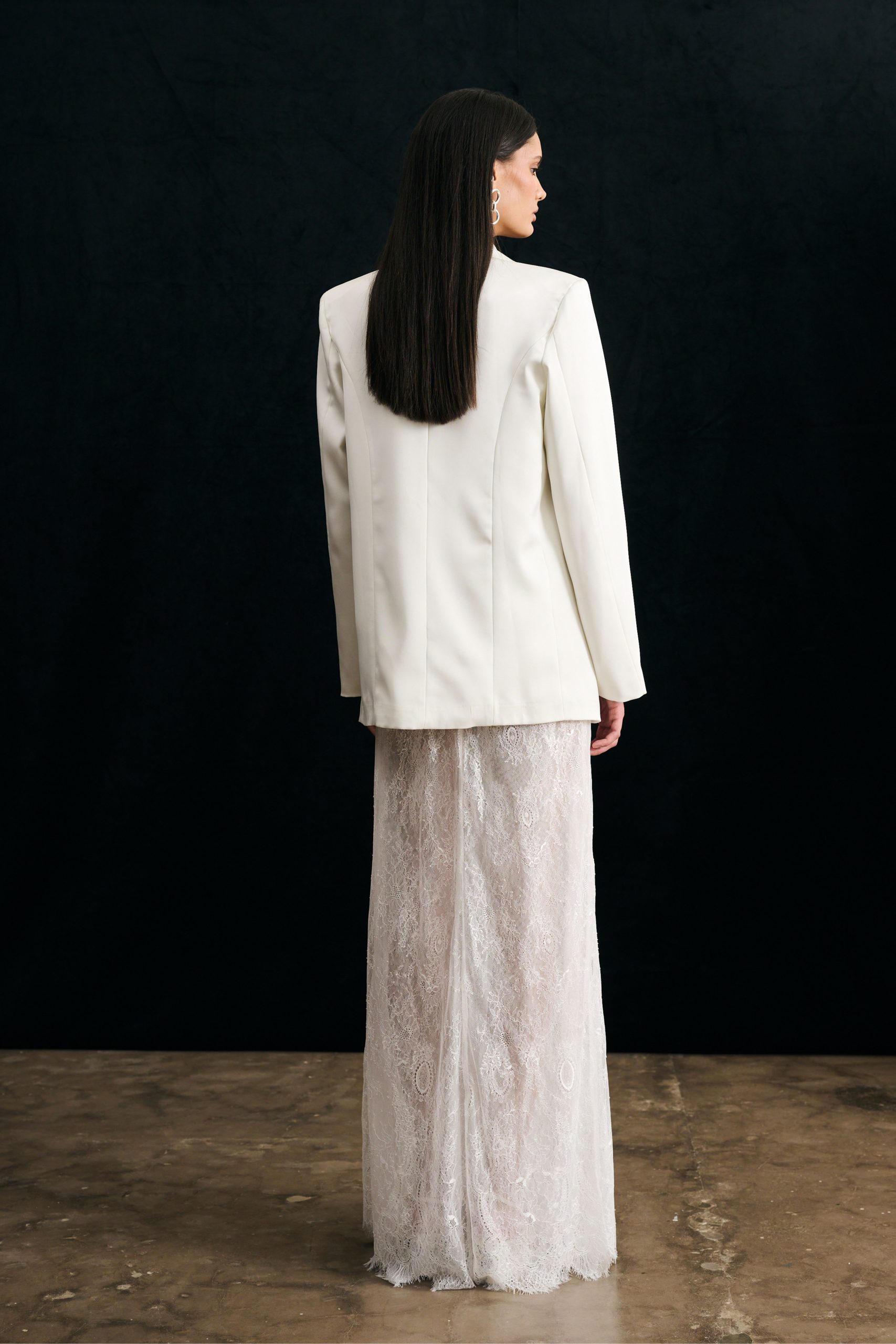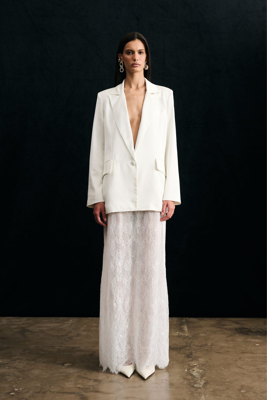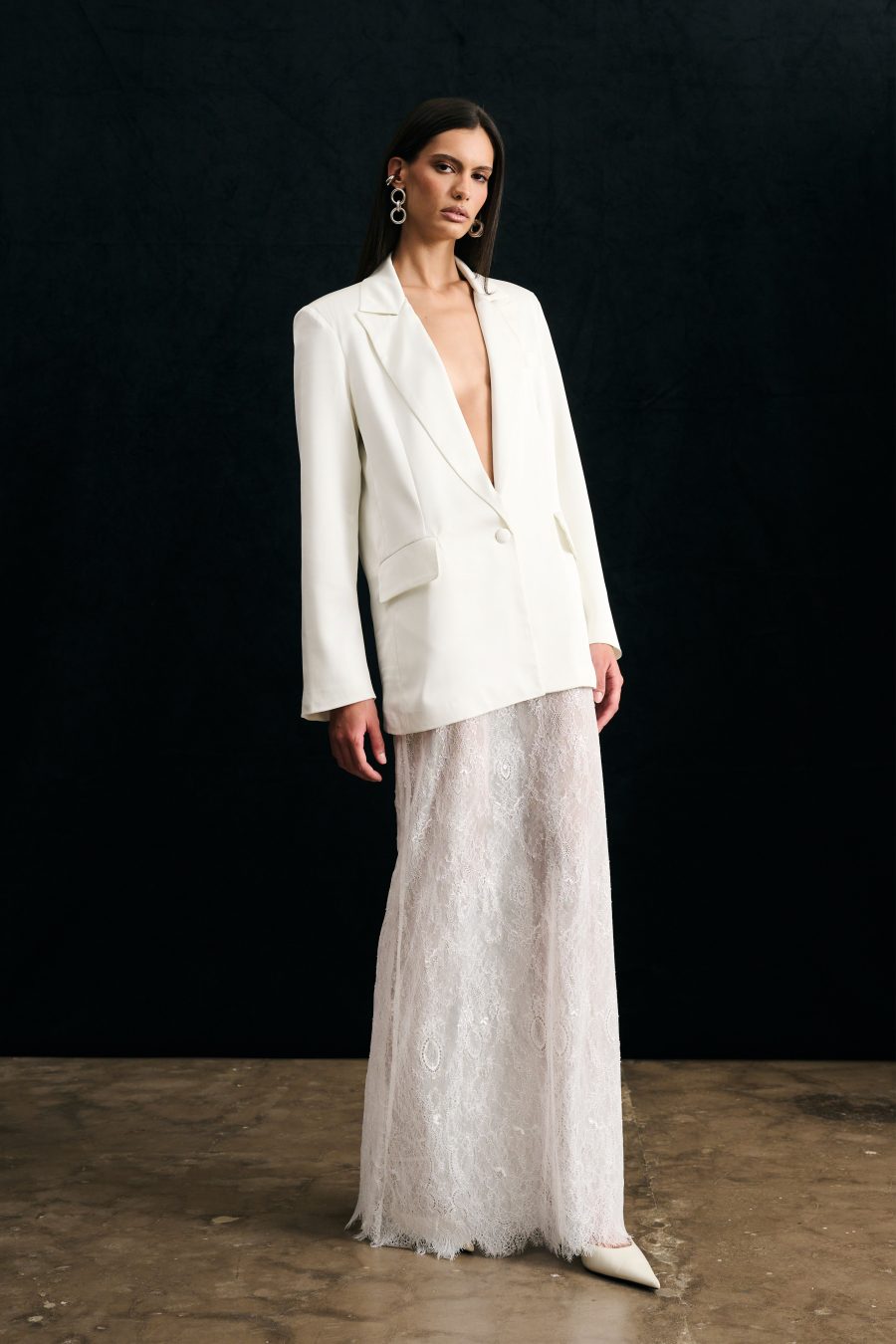 Saia longa de renda chantilly, toda dupla, modelagem levemente sereia e cintura baixa. Modela o corpo com delicadeza e personalidade.