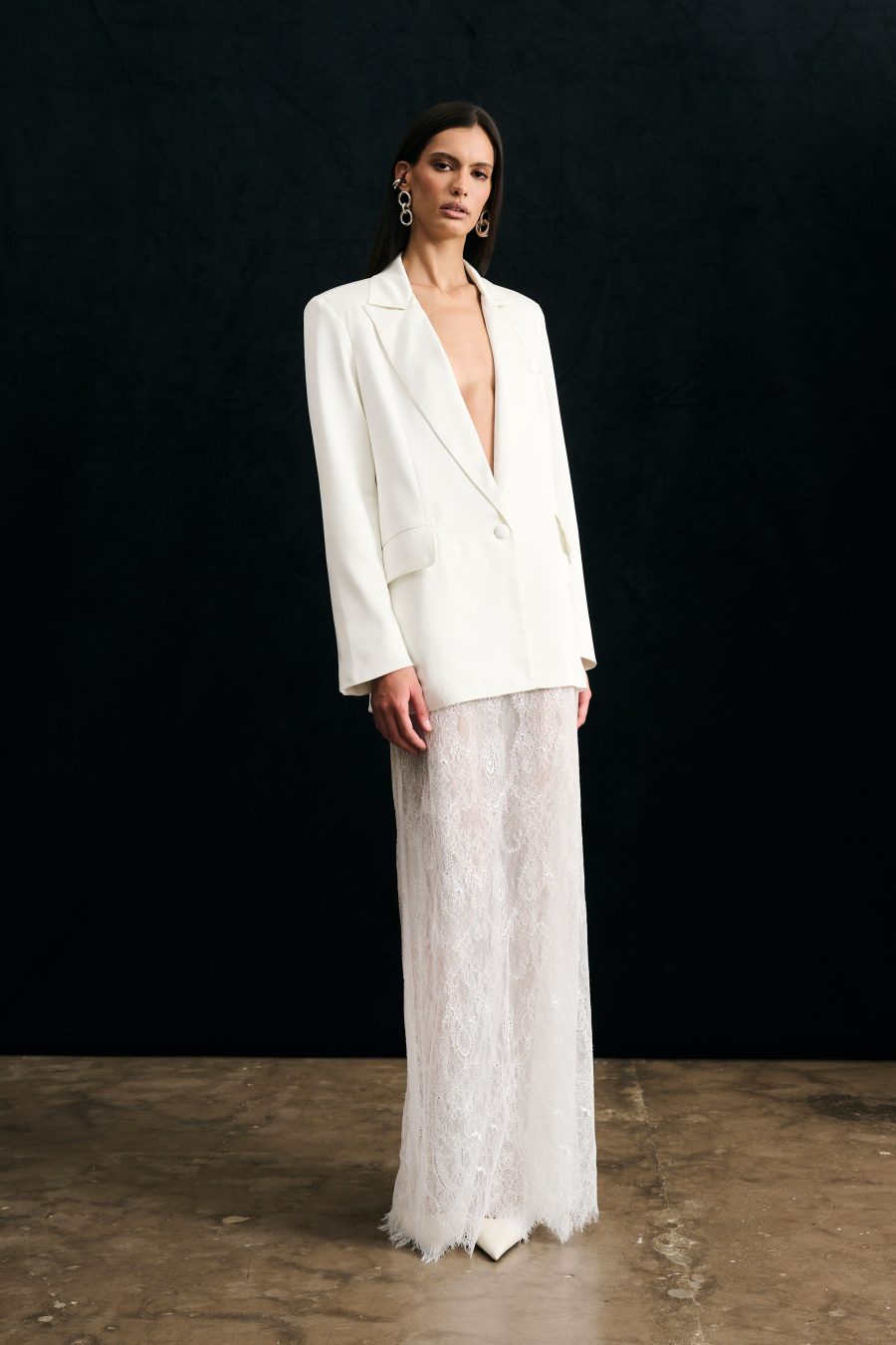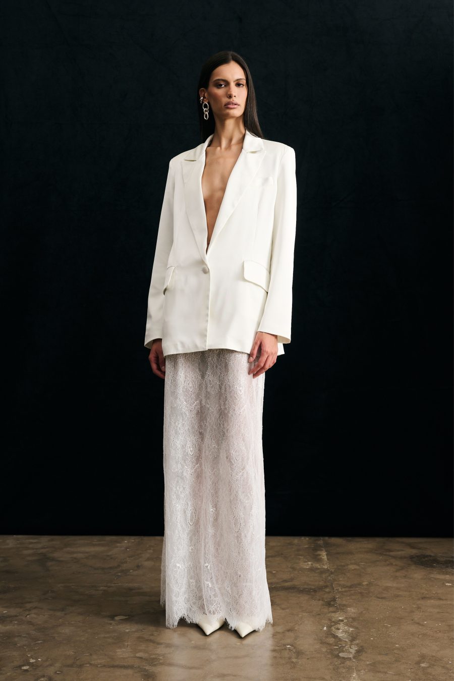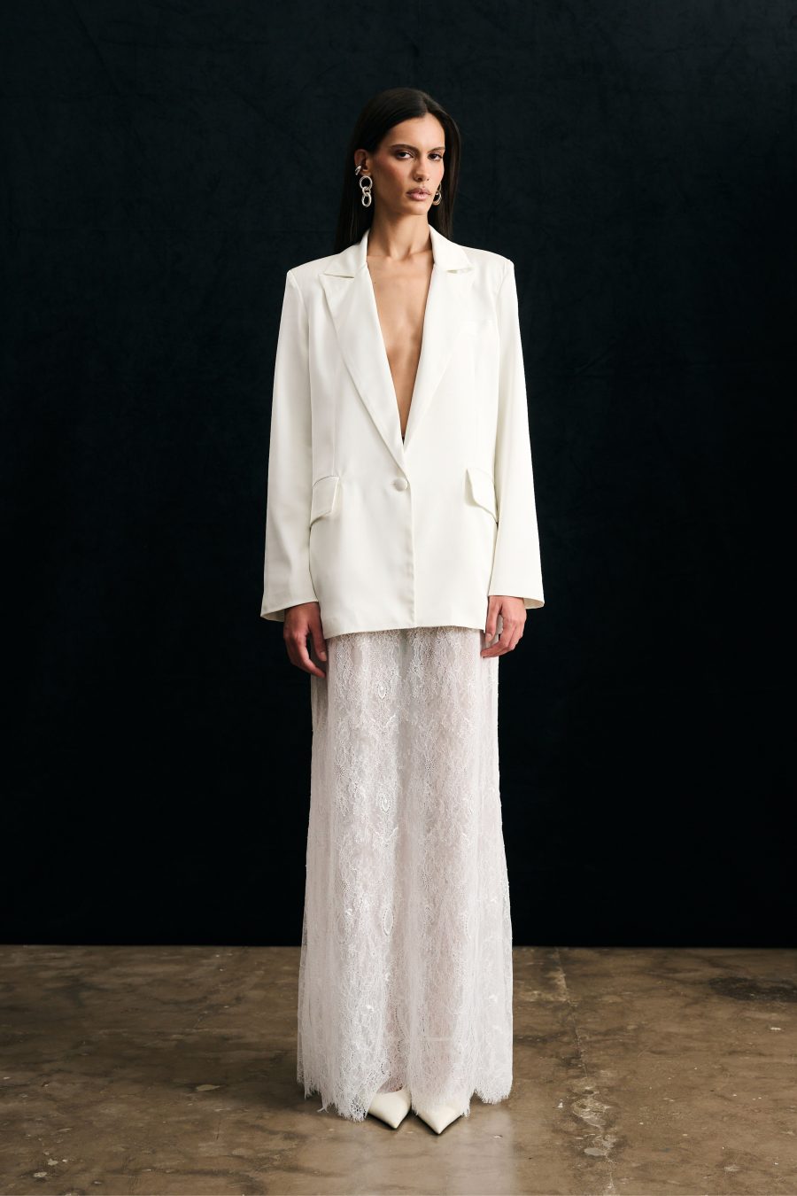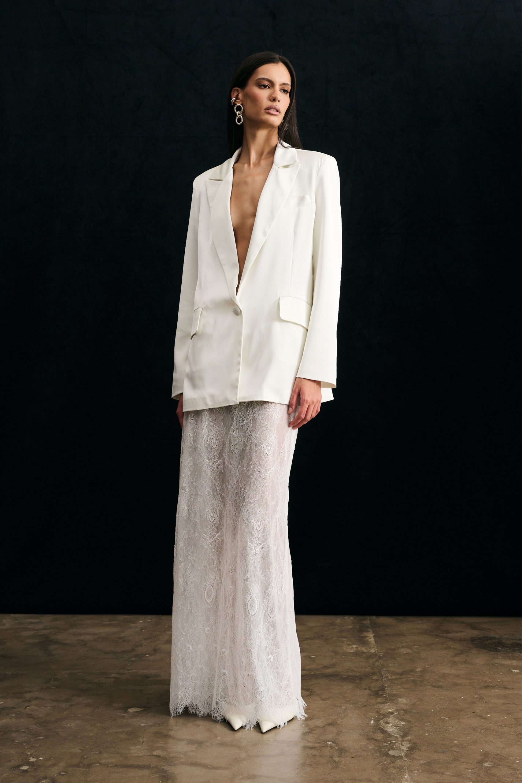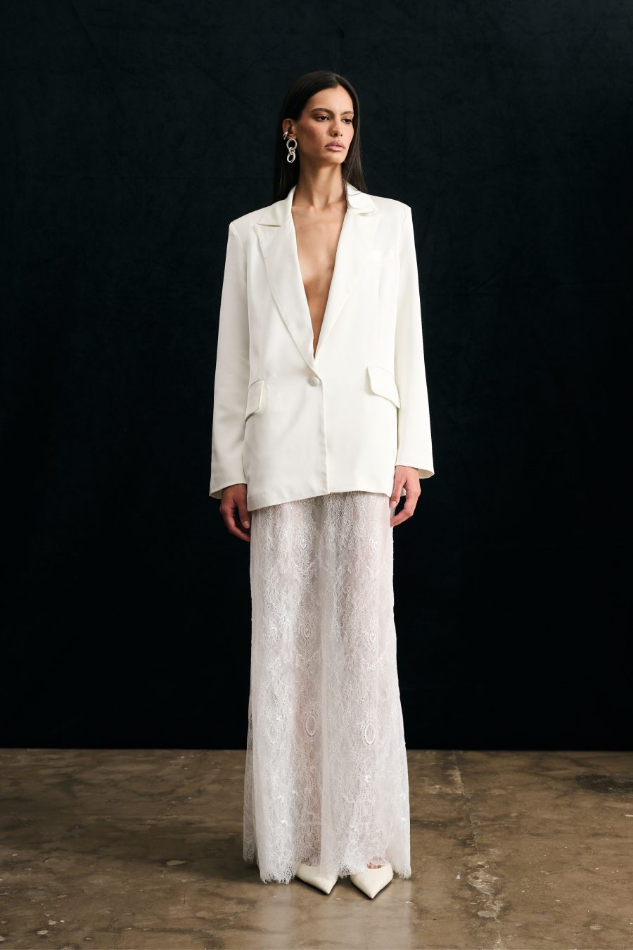 Saia longa de renda chantilly, toda dupla, modelagem levemente sereia e cintura baixa. Modela o corpo com delicadeza e personalidade.