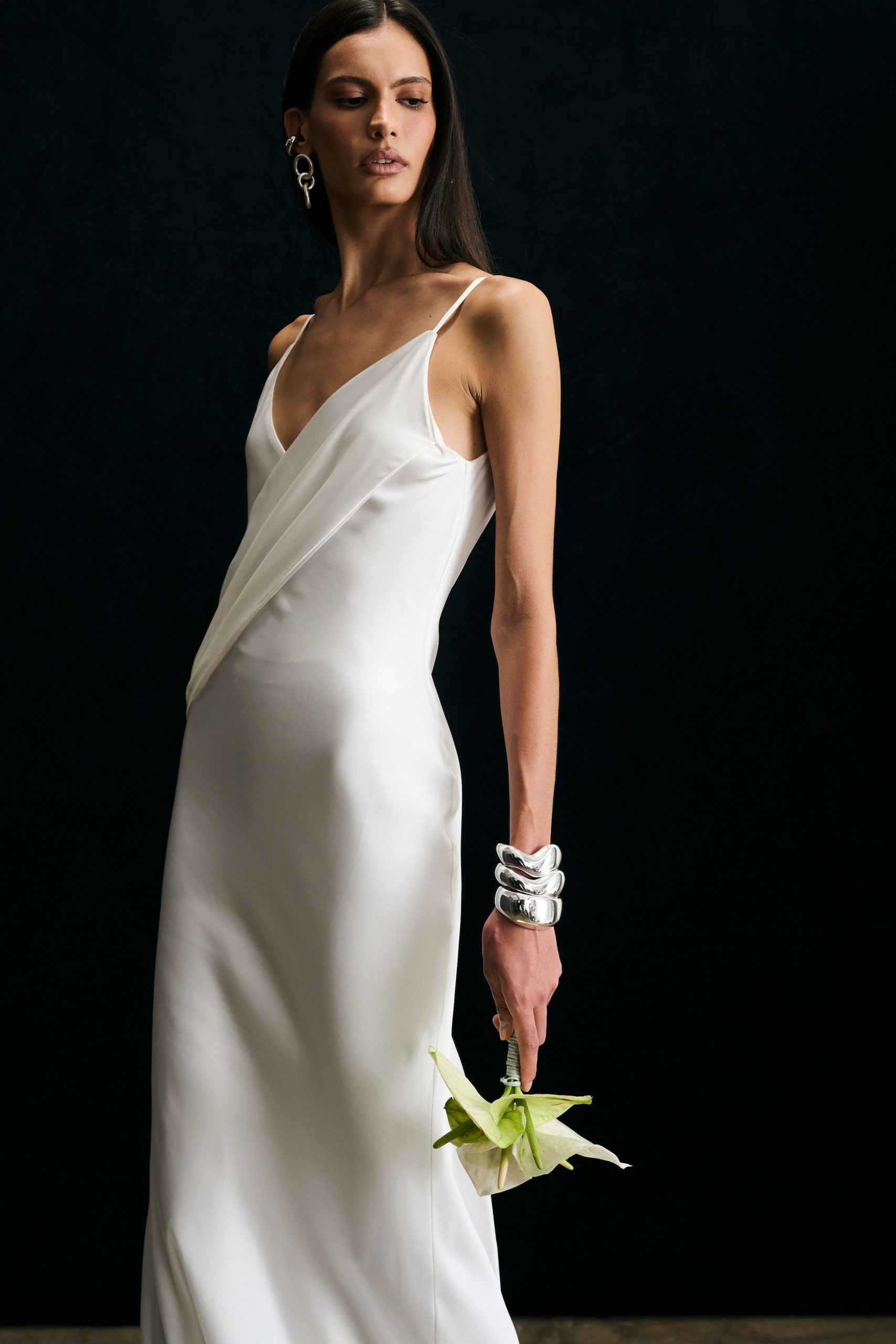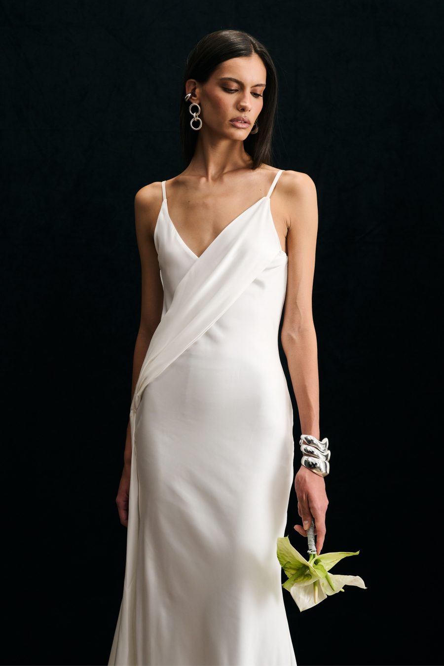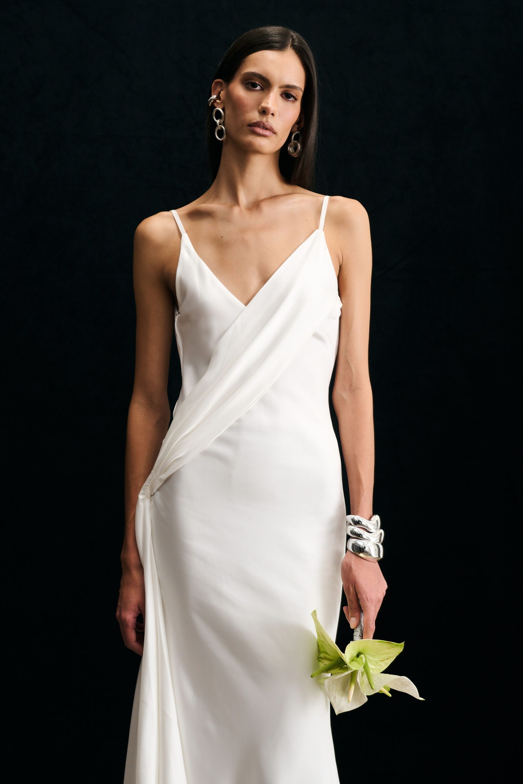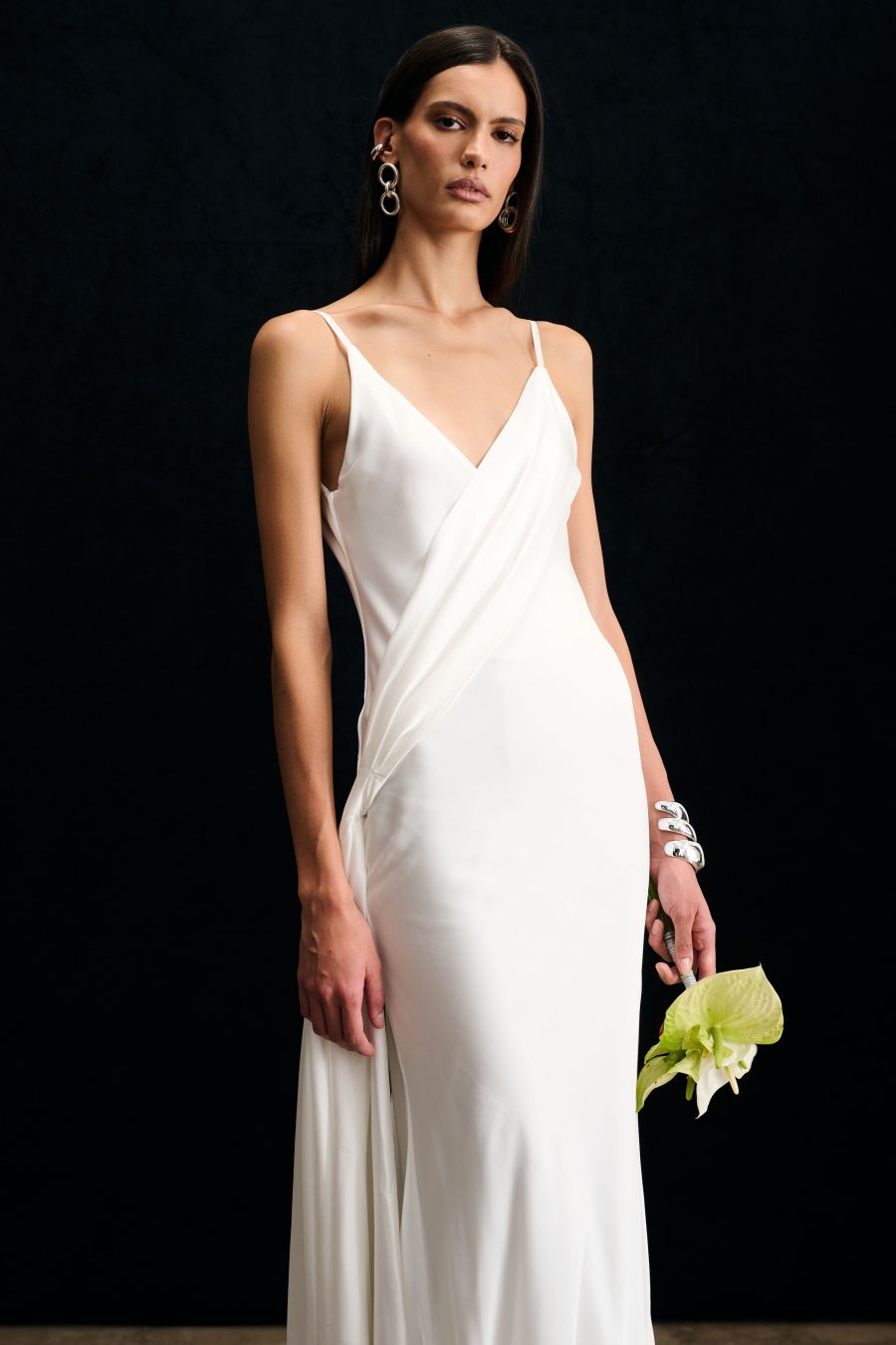 Vestido longo em cetim off white com alças finas e decote em V. A modelagem traz sobreposição transpassada na parte frontal, criando um efeito delicado de drapeado que valoriza a silhueta. A peça conta ainda com cauda elegante e caimento fluido, ideal para ocasiões sofisticadas.