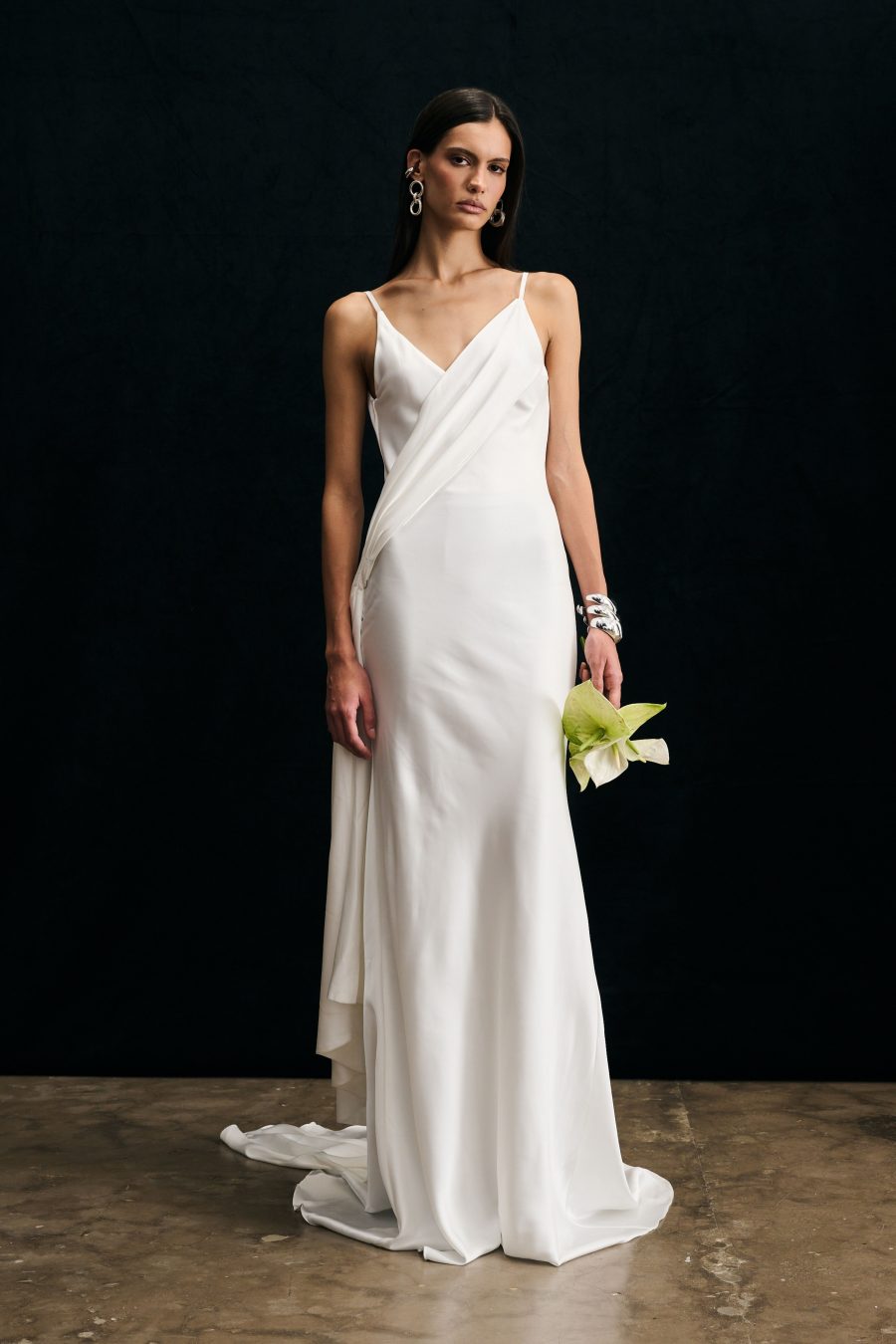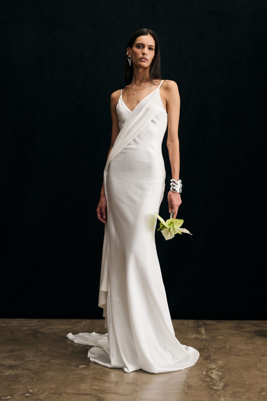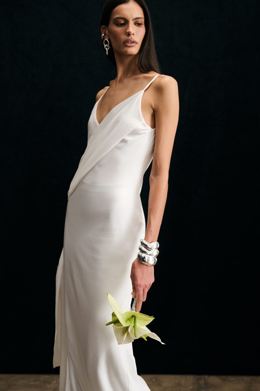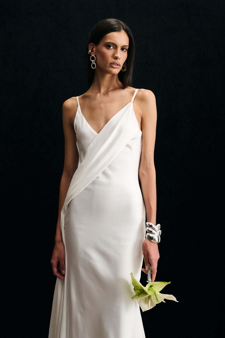 Vestido longo em cetim off white com alças finas e decote em V. A modelagem traz sobreposição transpassada na parte frontal, criando um efeito delicado de drapeado que valoriza a silhueta. A peça conta ainda com cauda elegante e caimento fluido, ideal para ocasiões sofisticadas.