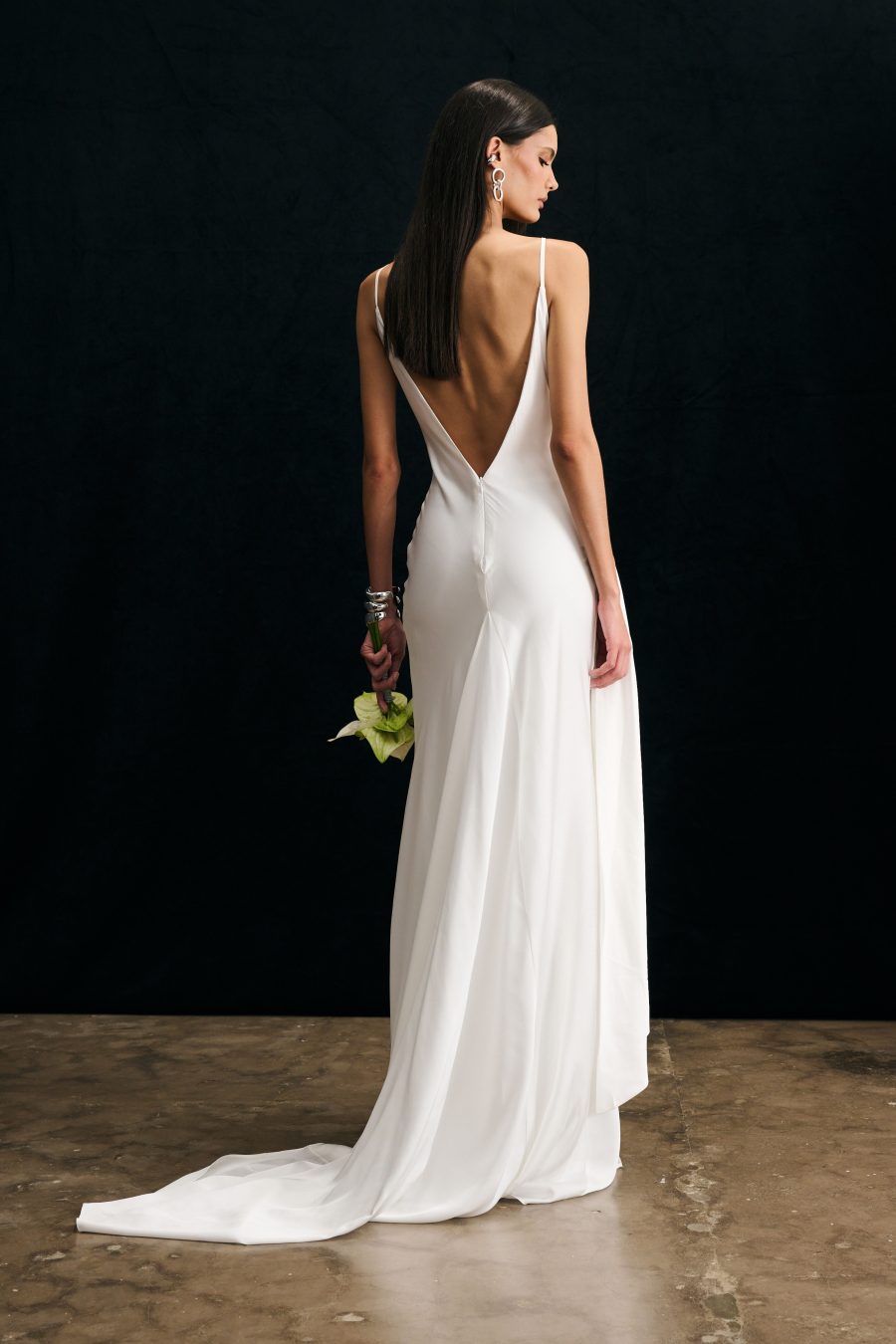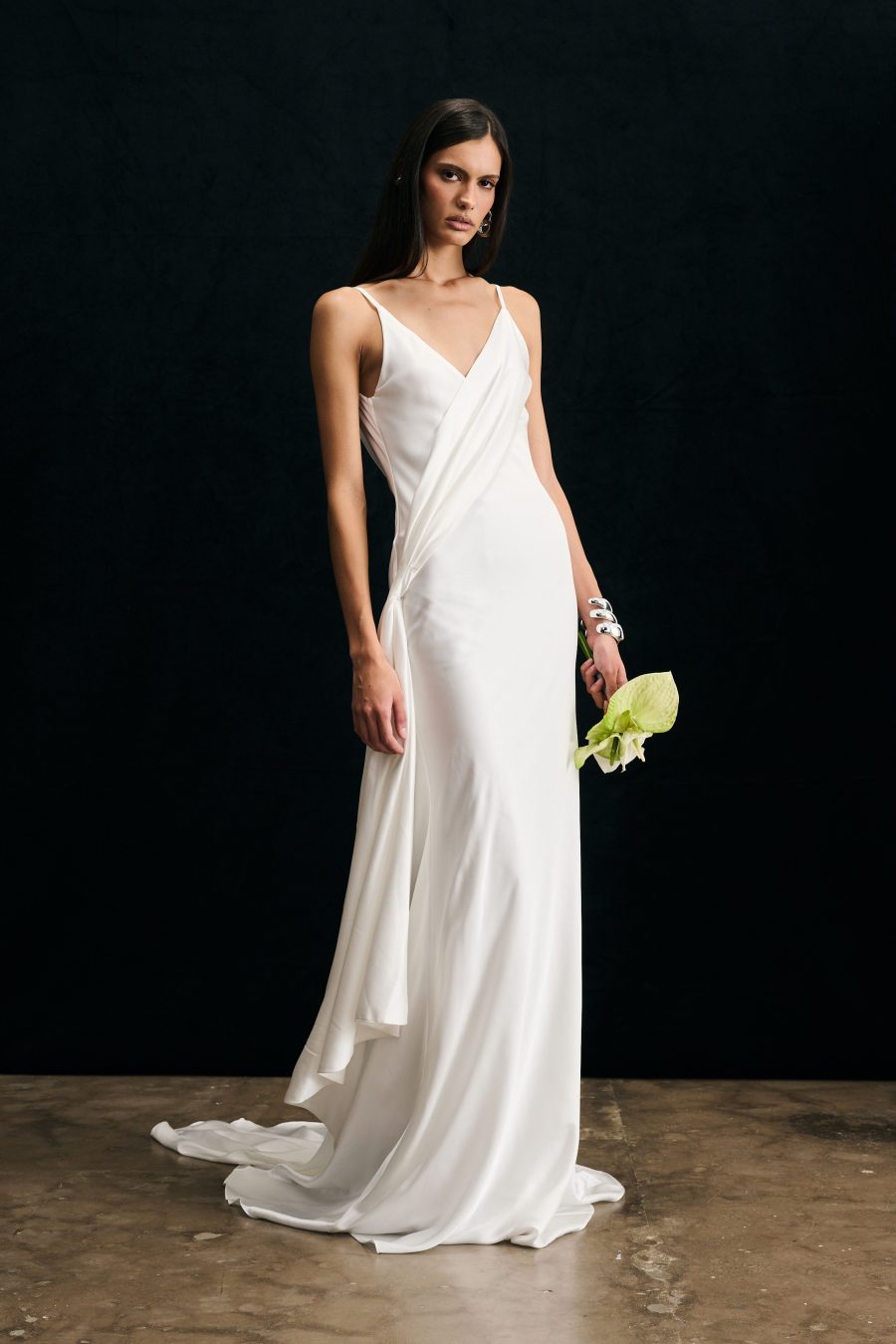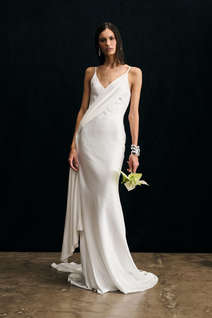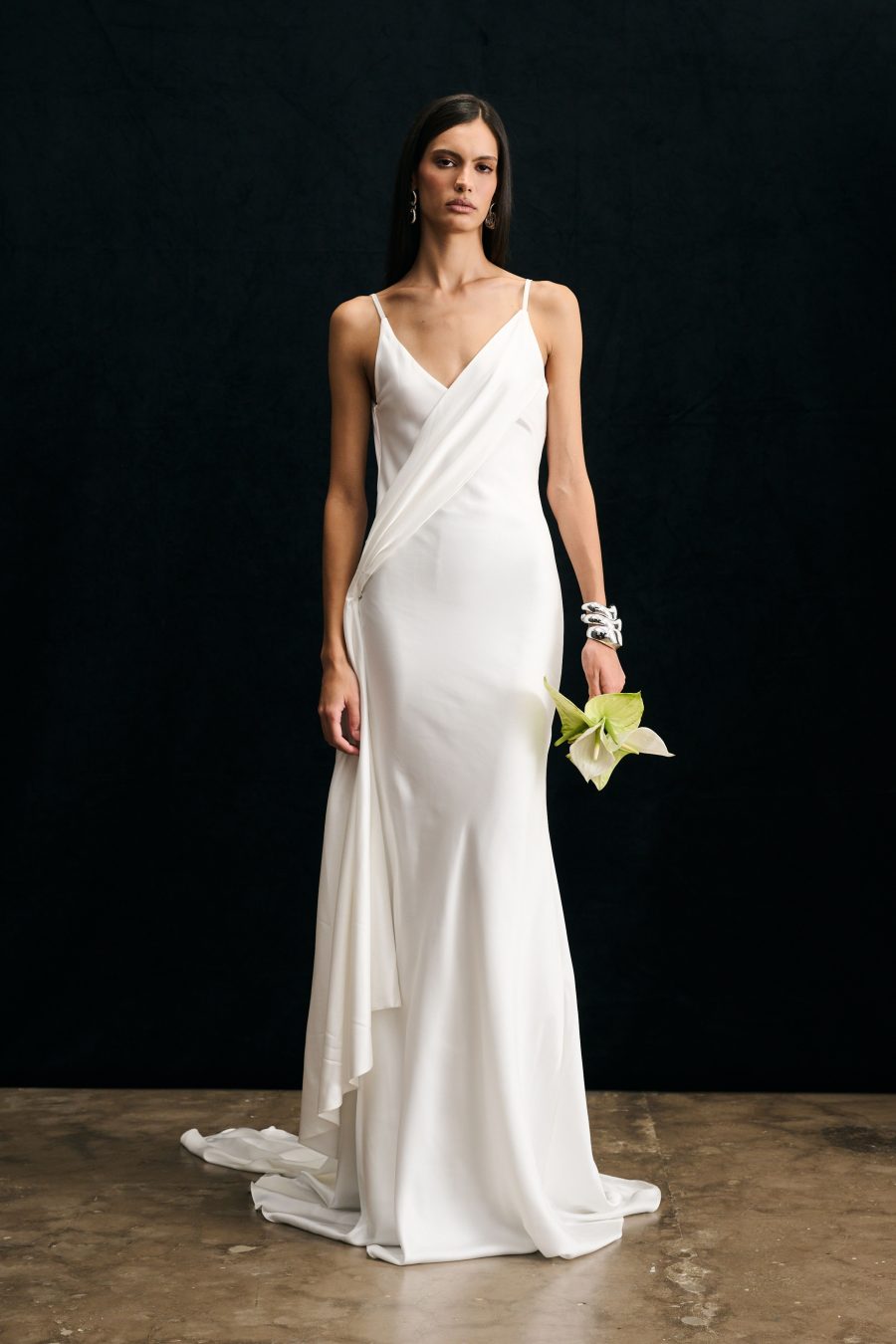 Vestido longo em cetim off white com alças finas e decote em V. A modelagem traz sobreposição transpassada na parte frontal, criando um efeito delicado de drapeado que valoriza a silhueta. A peça conta ainda com cauda elegante e caimento fluido, ideal para ocasiões sofisticadas.