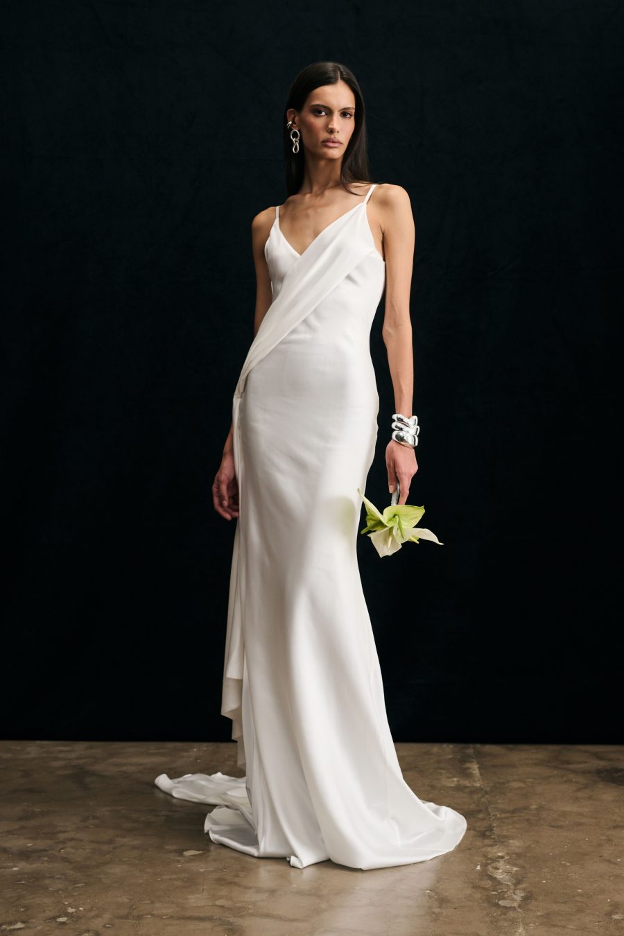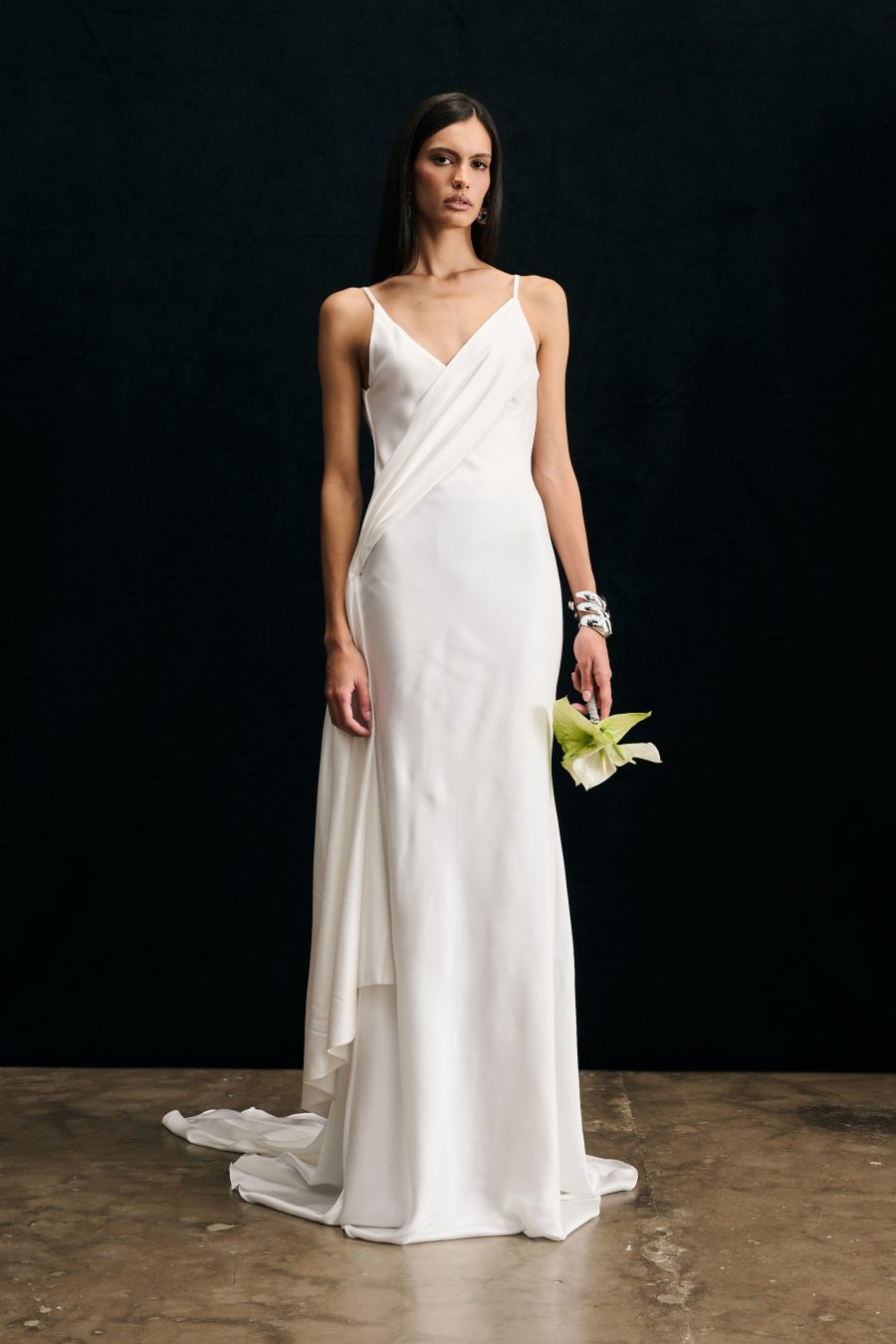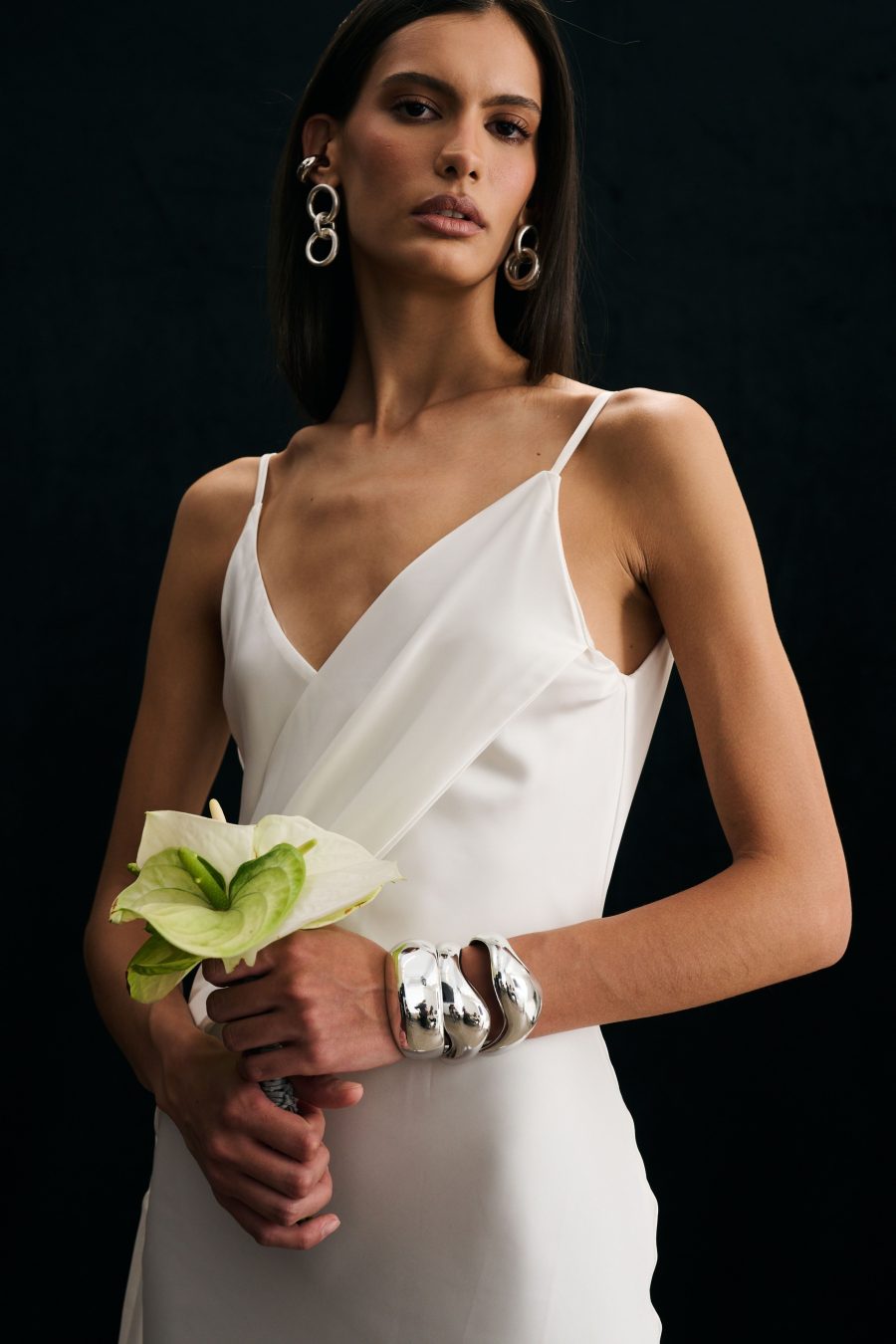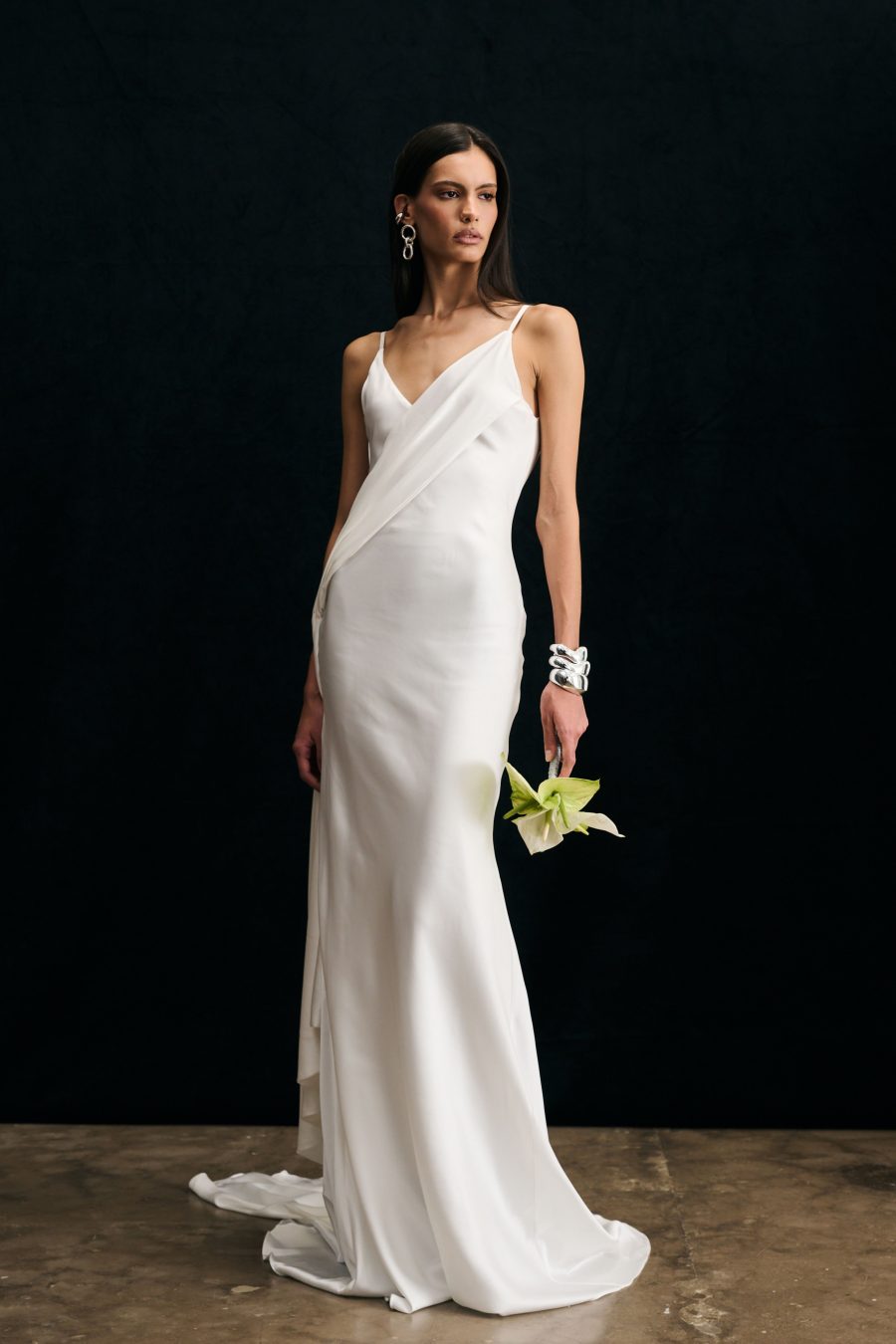 Vestido longo em cetim off white com alças finas e decote em V. A modelagem traz sobreposição transpassada na parte frontal, criando um efeito delicado de drapeado que valoriza a silhueta. A peça conta ainda com cauda elegante e caimento fluido, ideal para ocasiões sofisticadas.