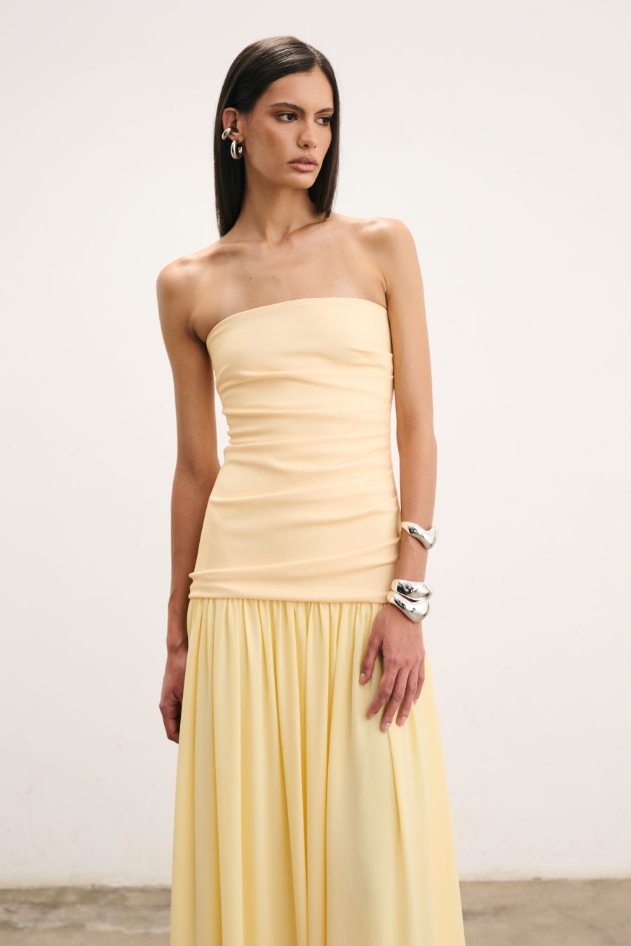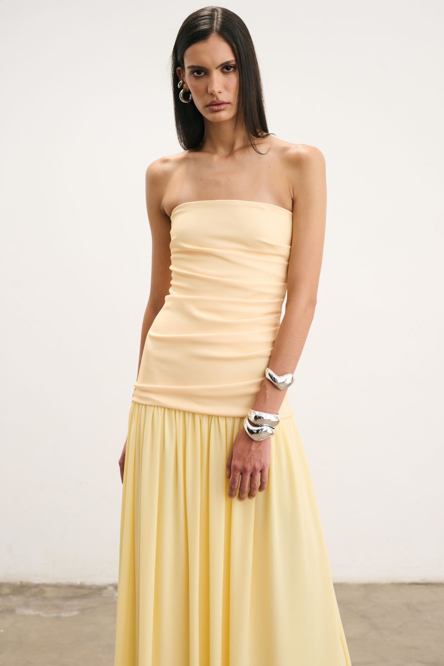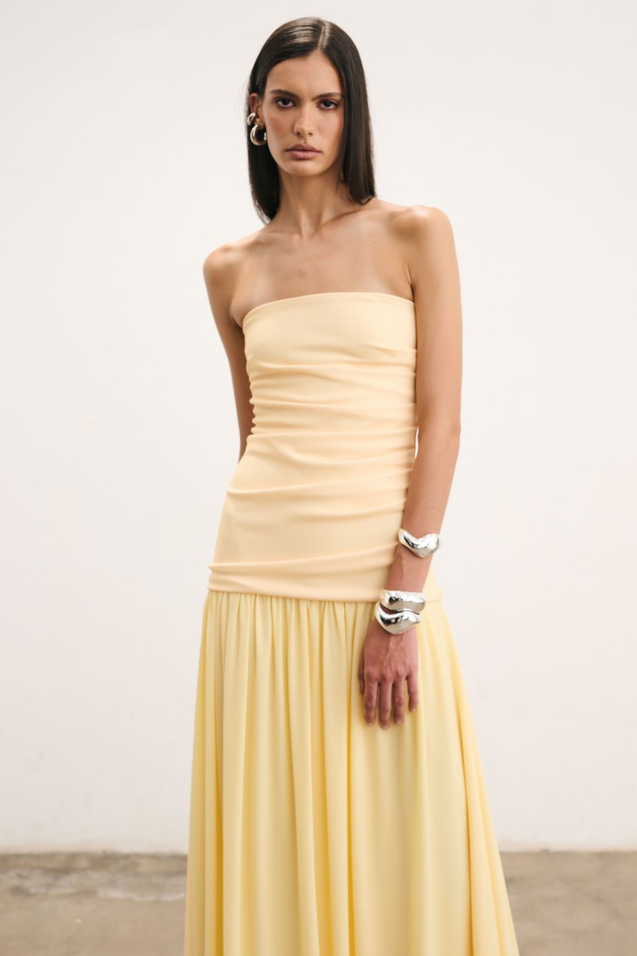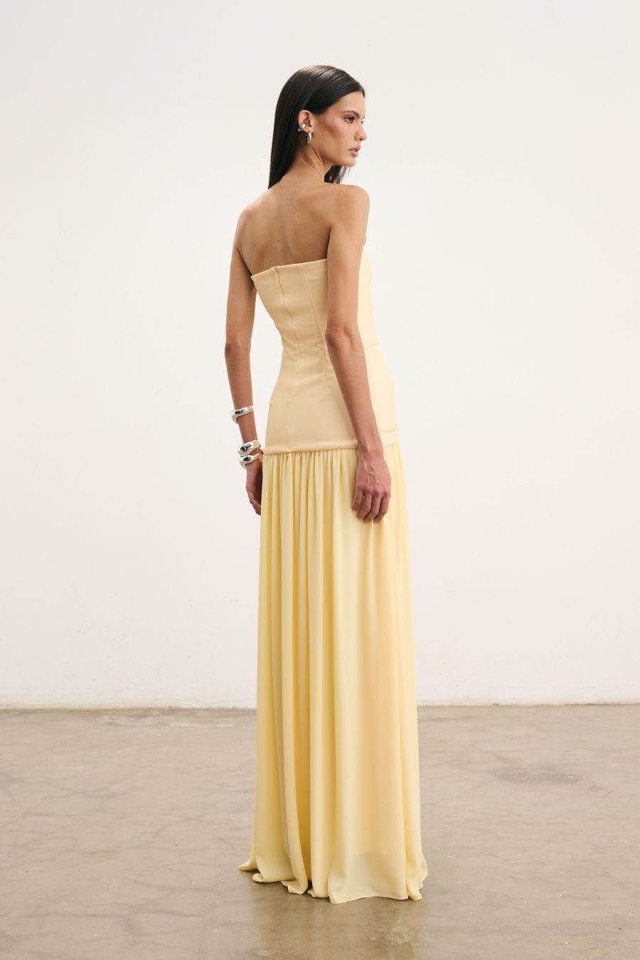 Vestido tomara que caia butter. corpo da peça feito de malha que ajusta perfeitamente ao corpo, e saia de musseline que traz leveza a peça. Drapeado nas laterais do corpo que modela a silhueta e que, juntamente com a saia fluida, cria um visual único.