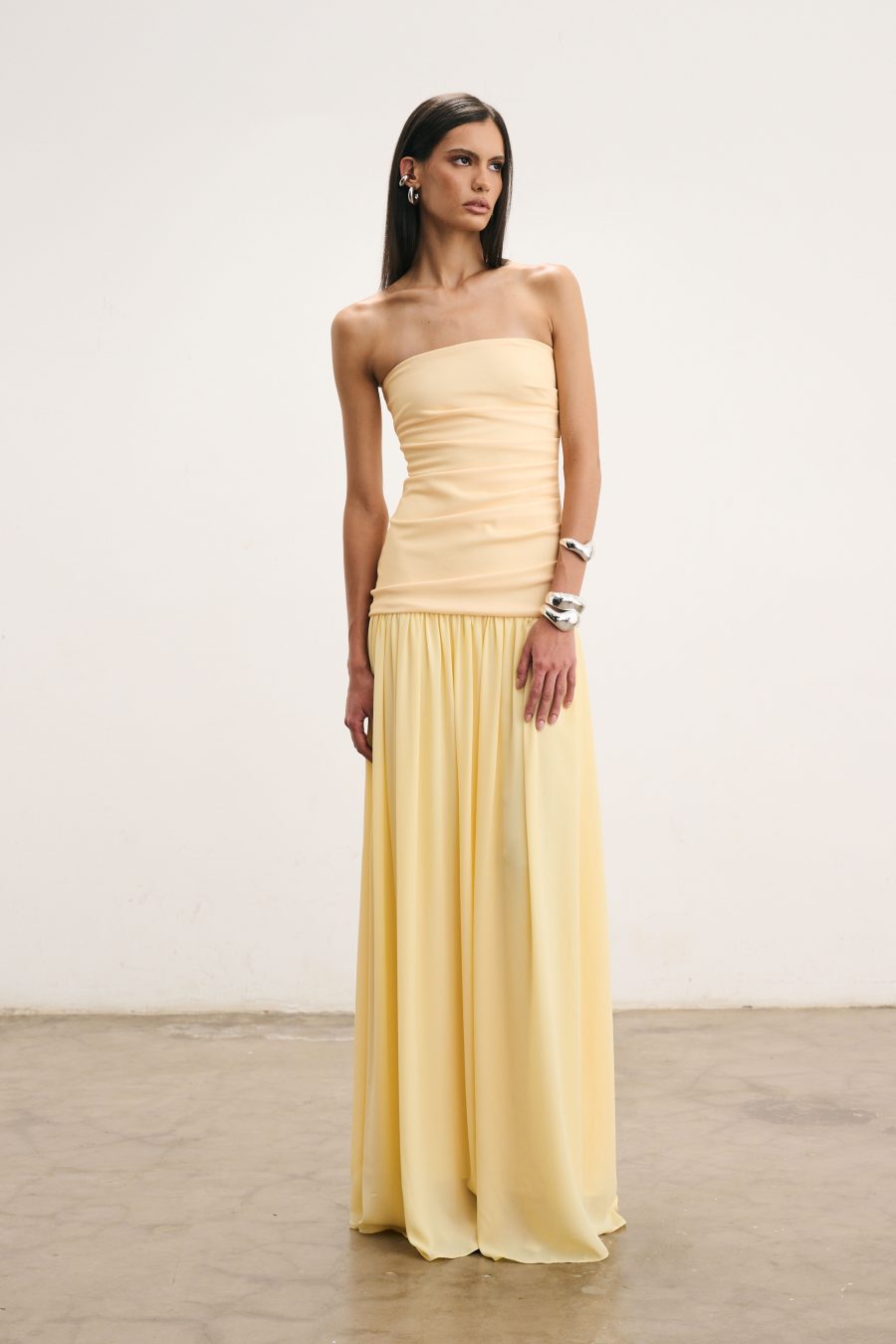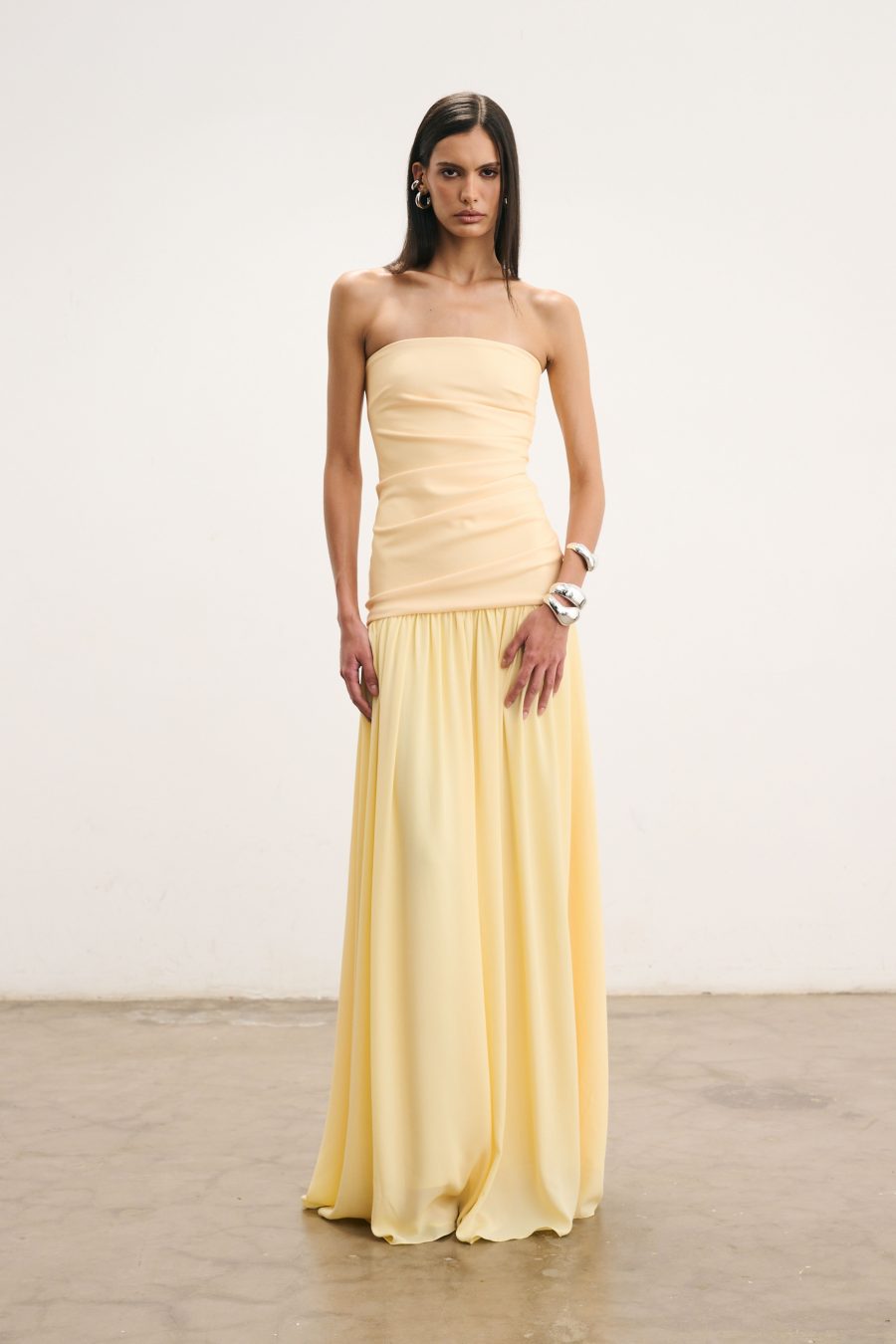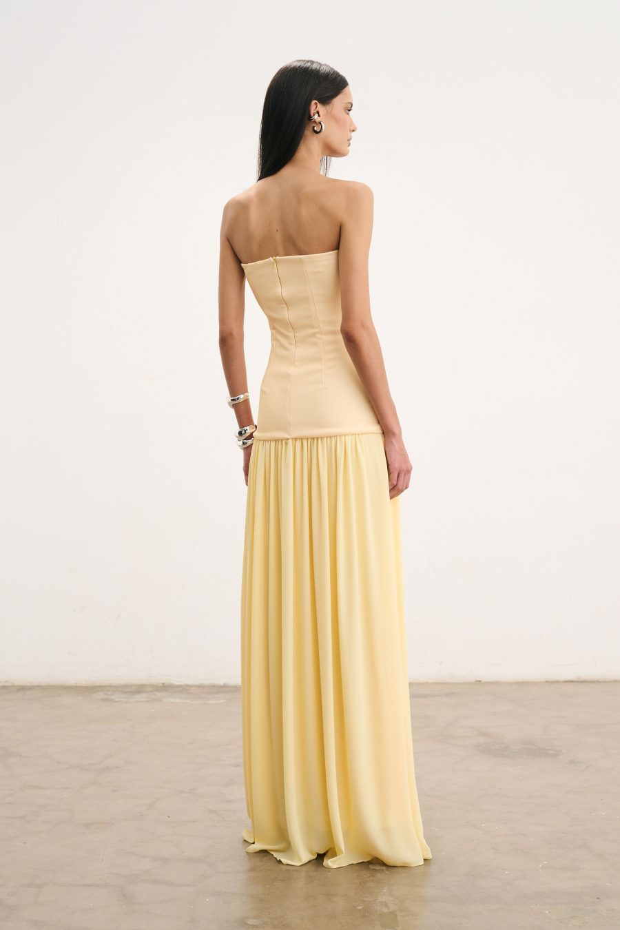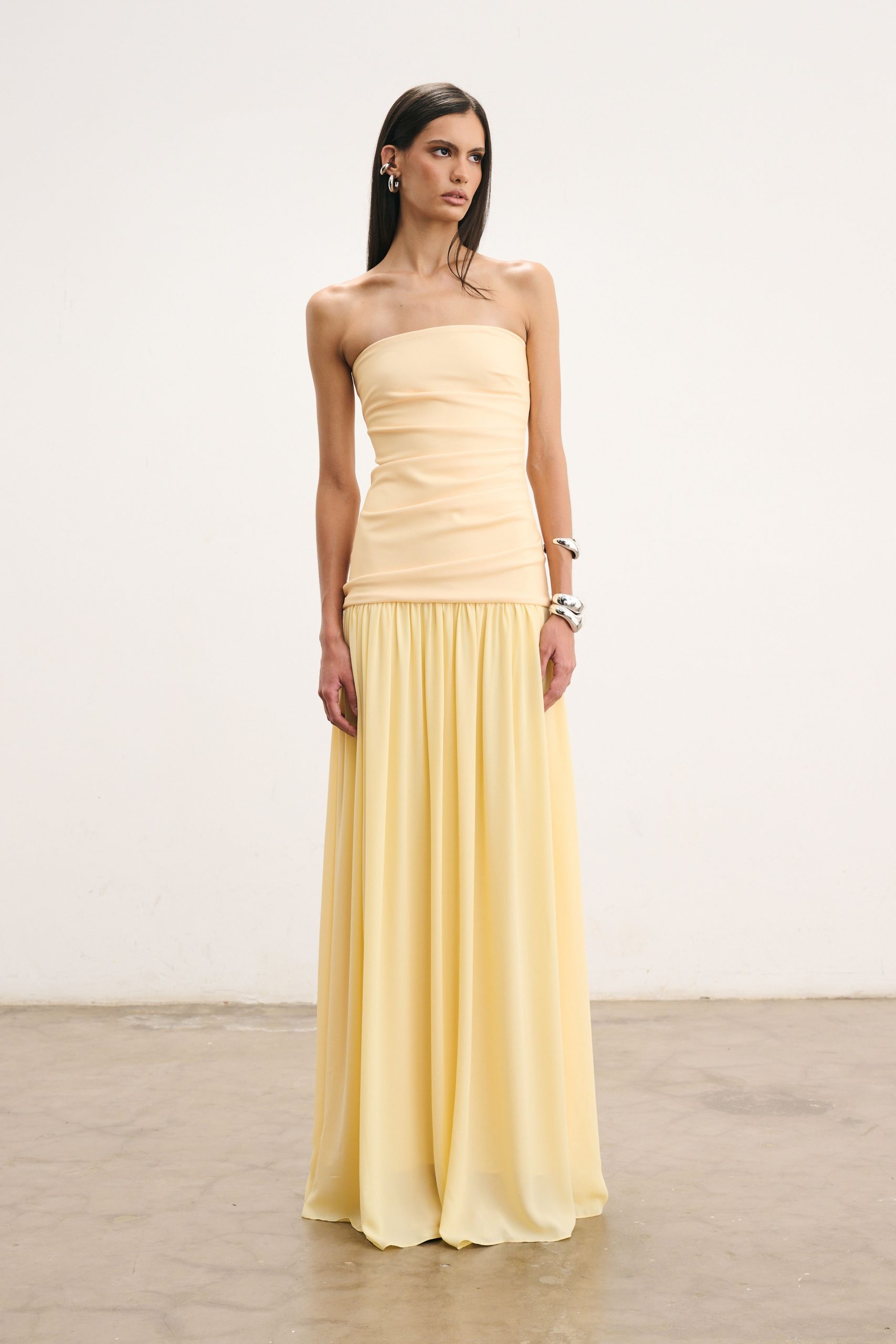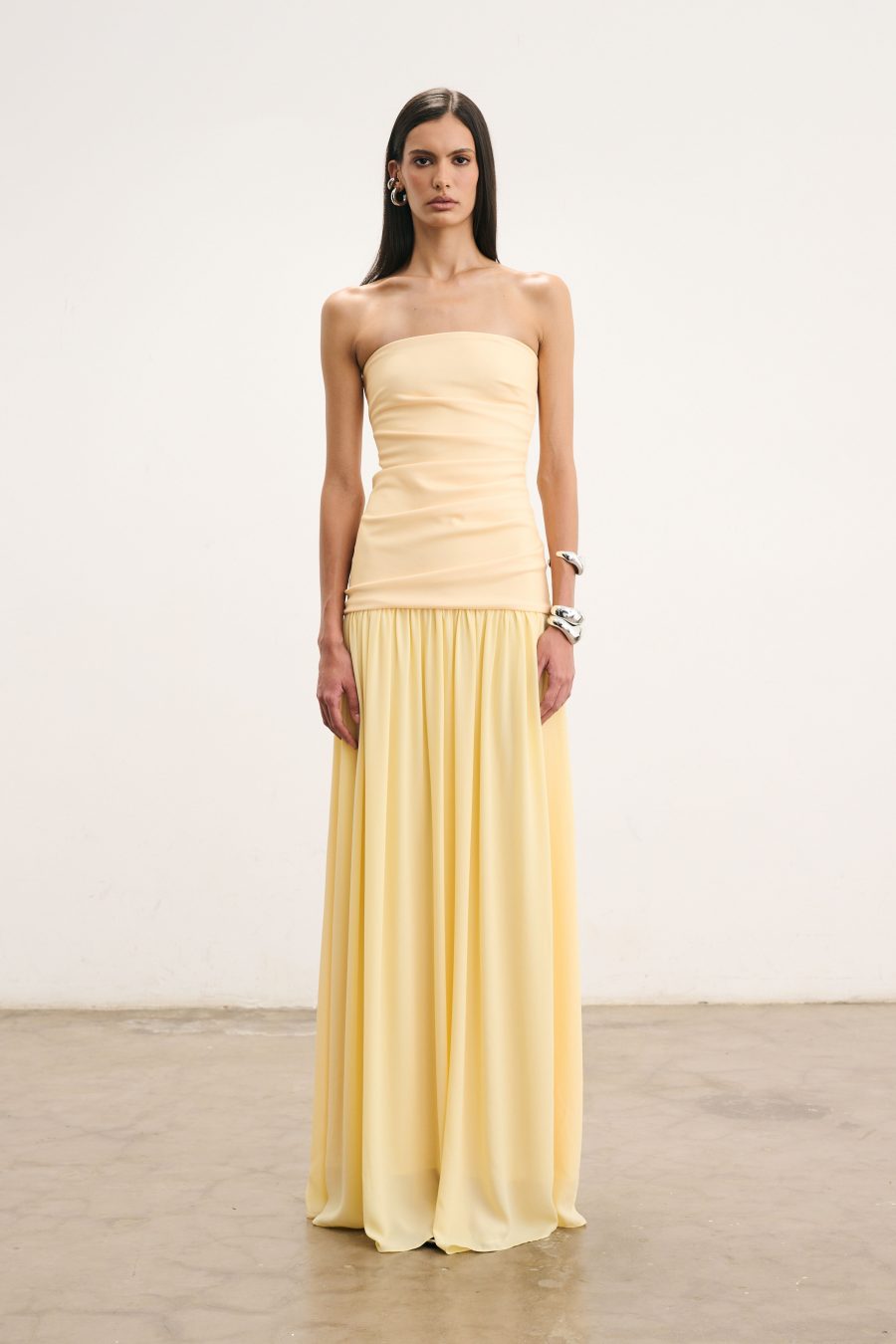 Vestido tomara que caia butter. corpo da peça feito de malha que ajusta perfeitamente ao corpo, e saia de musseline que traz leveza a peça. Drapeado nas laterais do corpo que modela a silhueta e que, juntamente com a saia fluida, cria um visual único.