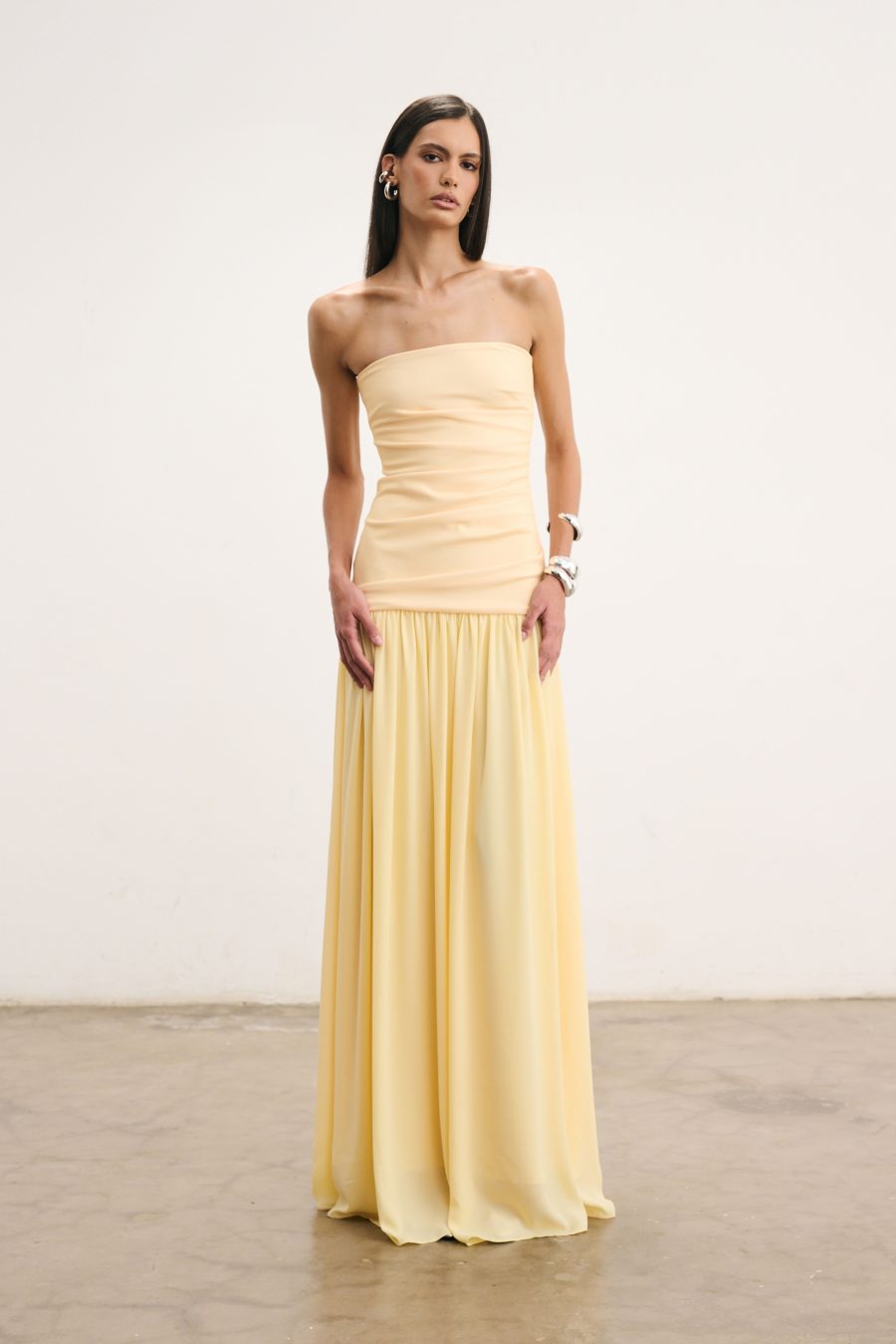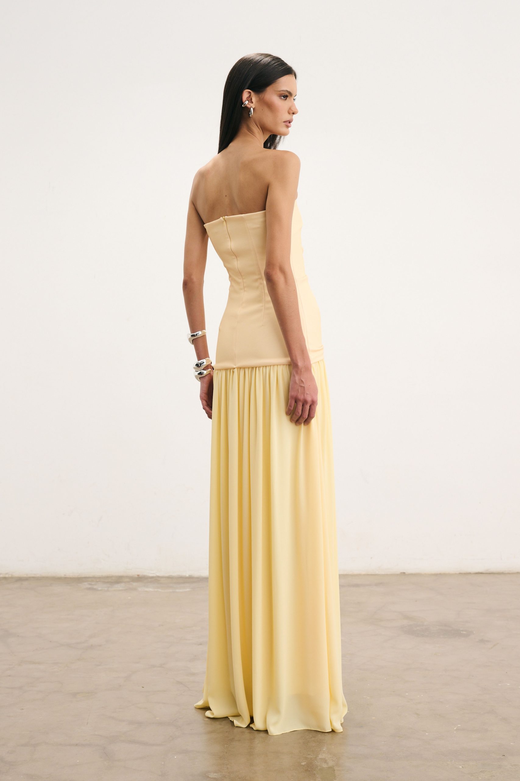 Vestido longo de cetim amarelo claro. Decote tomara-que-caia realça o busto e as costas, e drapeado na lateral que modela a silhueta. Possui zíper invisível na lateral.