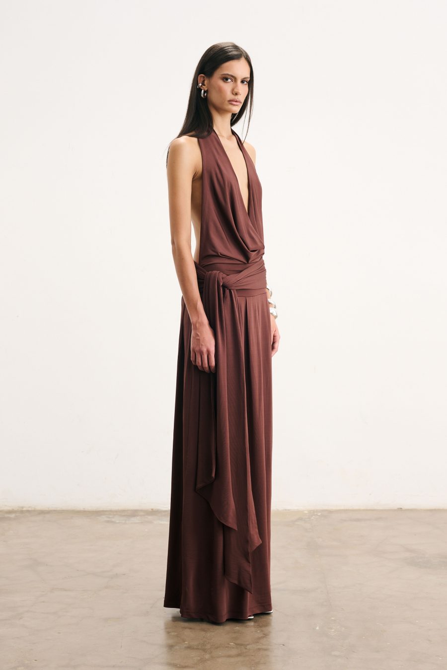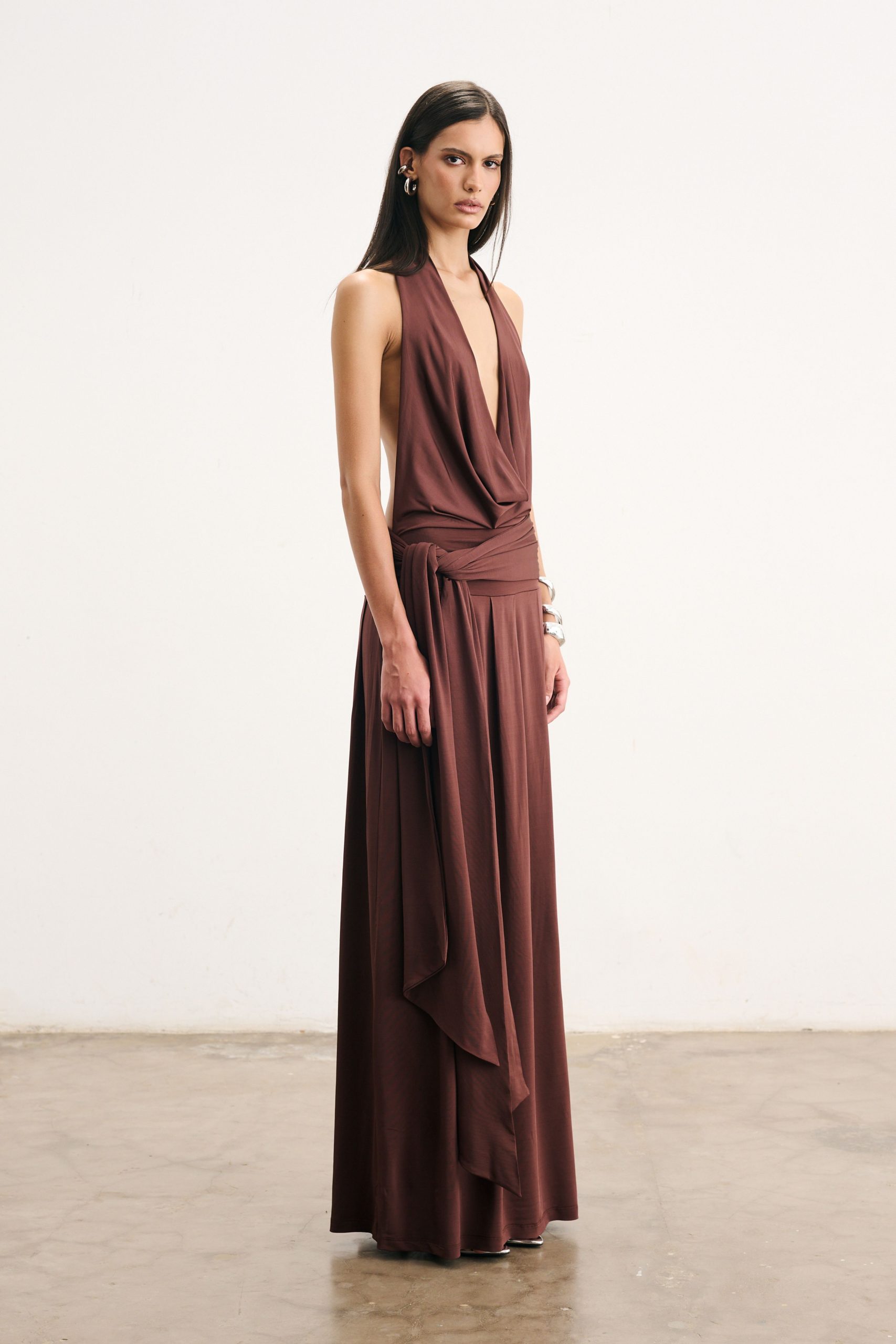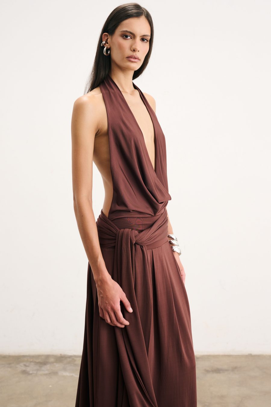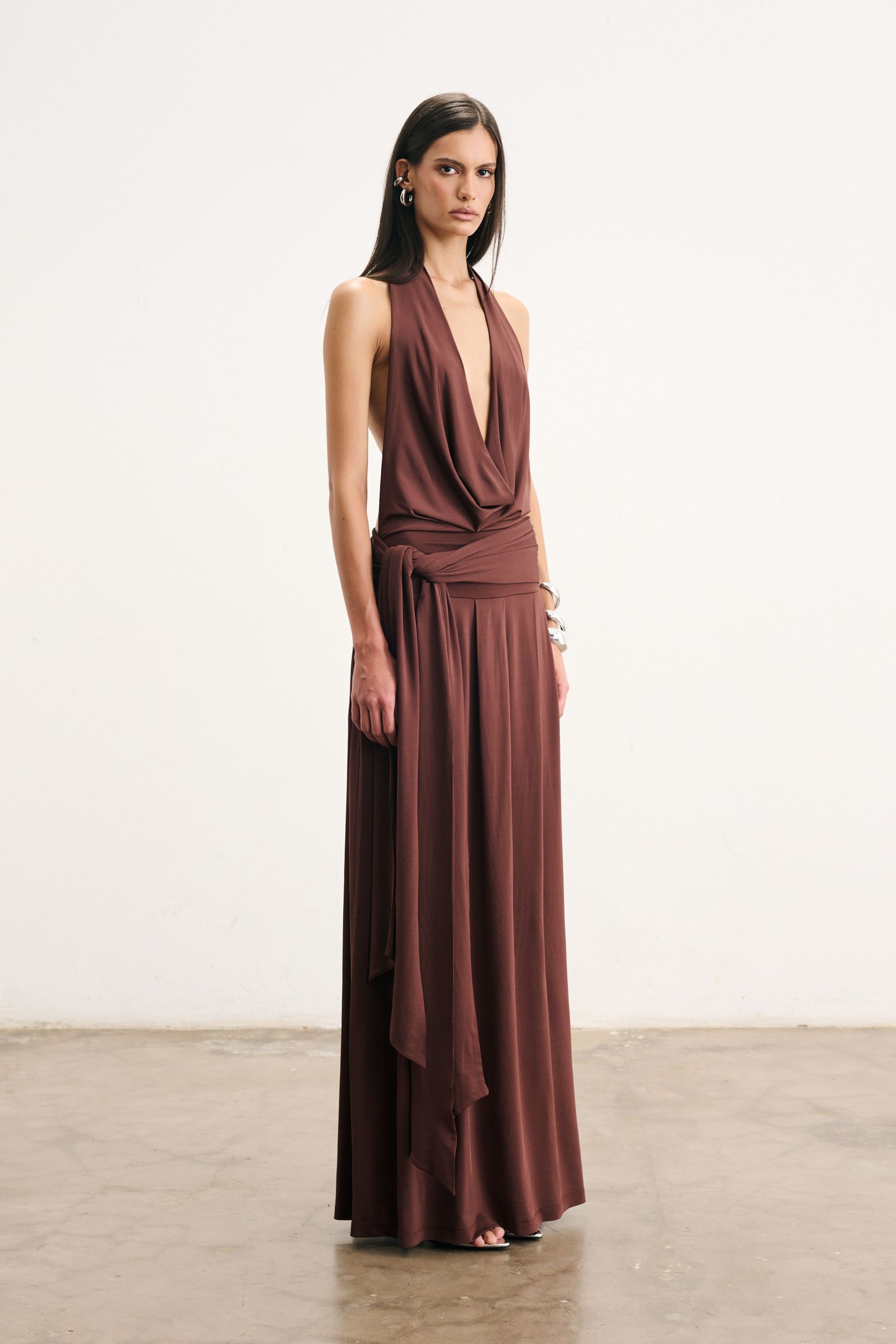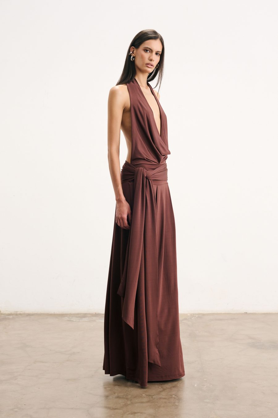 Vestido em Jersey de viscose, marrom, com decote profundo em “V” e amarração frontal que realça a cintura com elegância. A modelagem soltinha e o tecido leve proporcionam movimento, enquanto as costas abertas e o caimento suave trazem um toque de sensualidade sofisticada. Ideal para eventos noturnos ou ocasiões especiais que pedem um visual marcante e moderno.