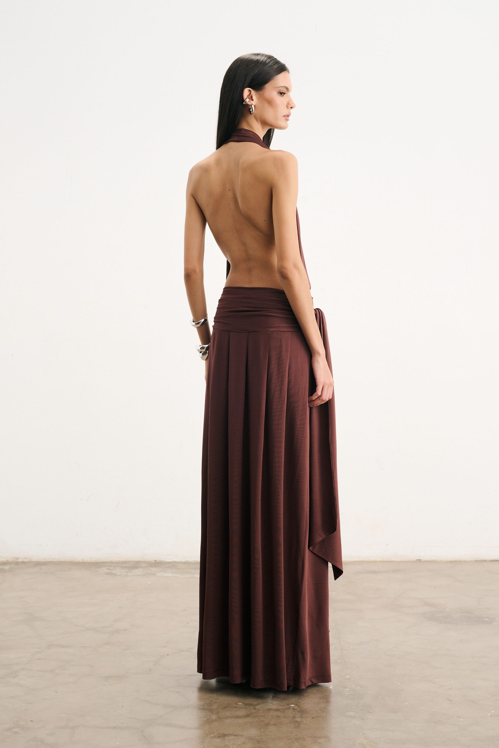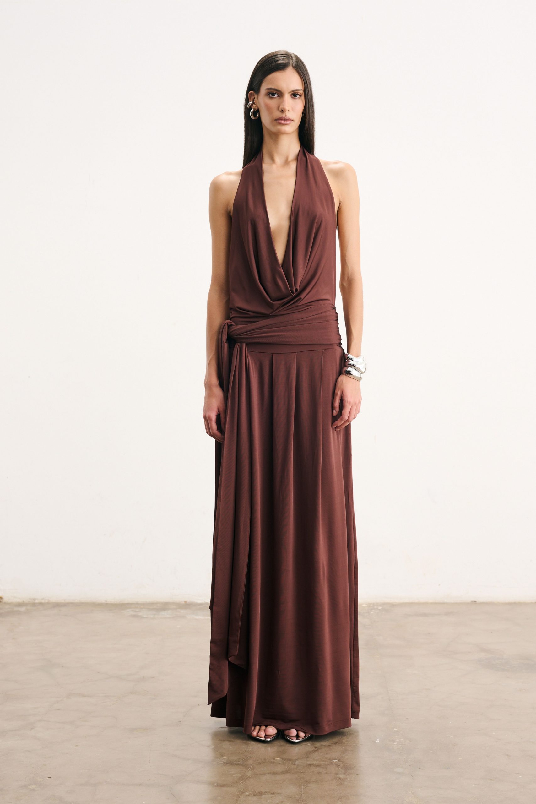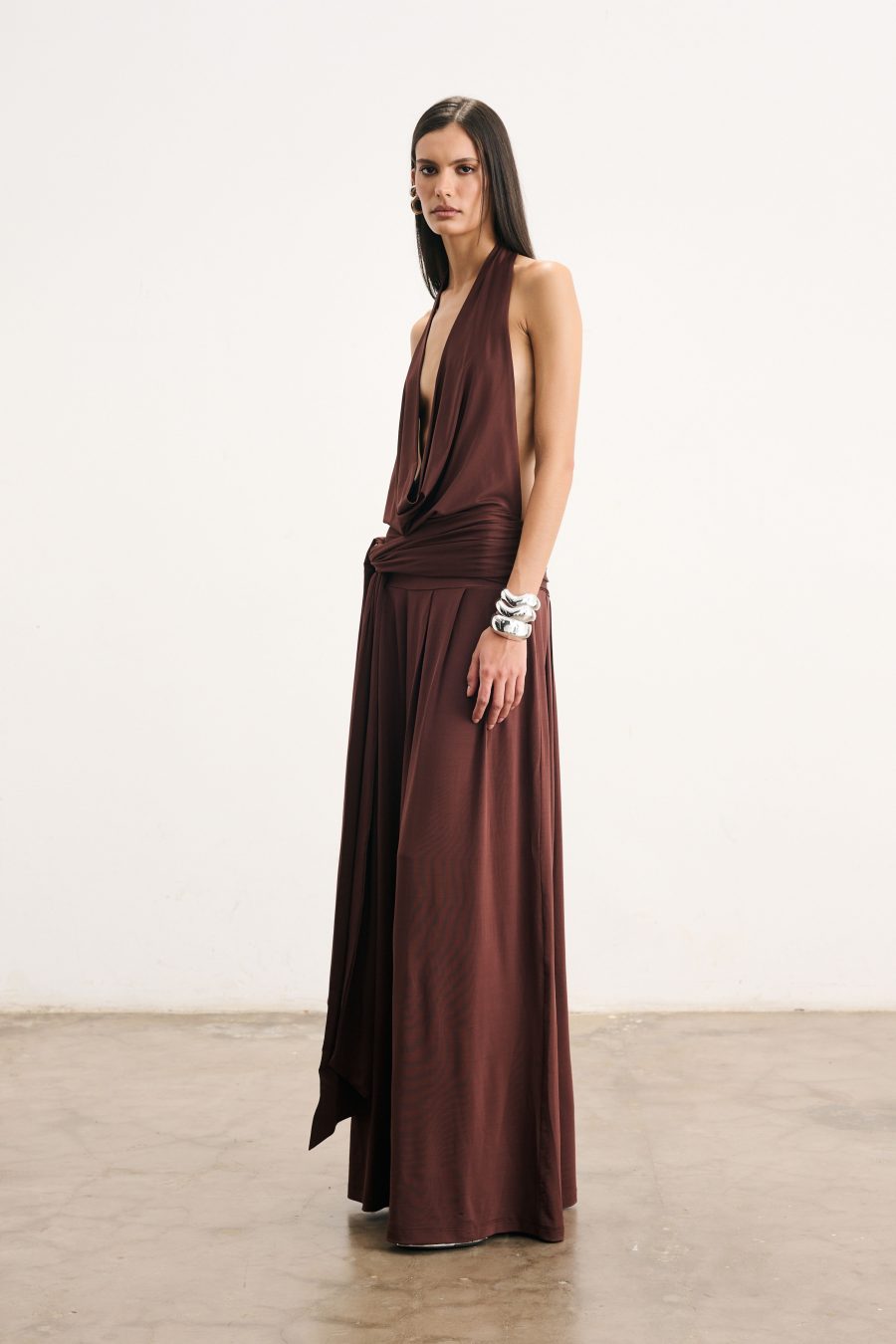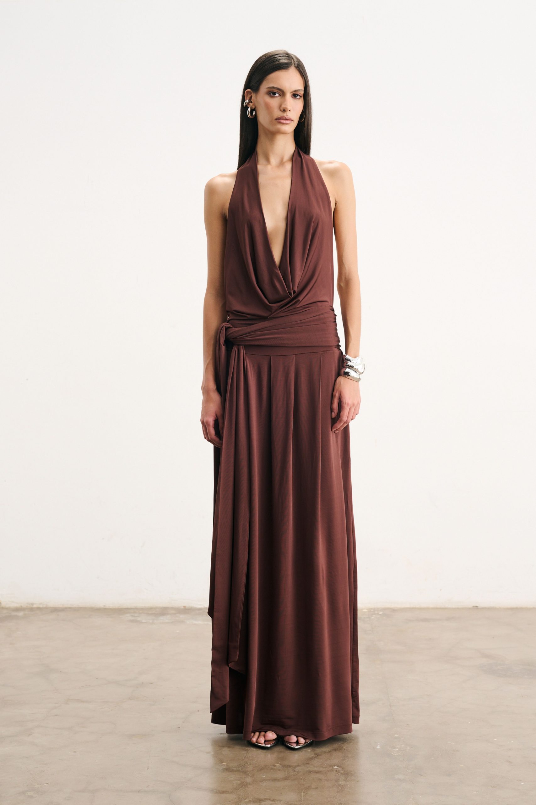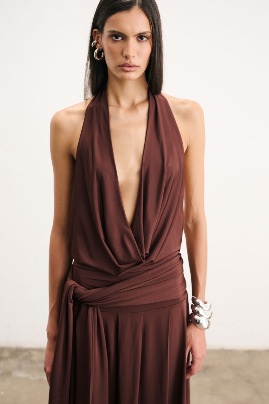 Vestido em Jersey de viscose, marrom, com decote profundo em “V” e amarração frontal que realça a cintura com elegância. A modelagem soltinha e o tecido leve proporcionam movimento, enquanto as costas abertas e o caimento suave trazem um toque de sensualidade sofisticada. Ideal para eventos noturnos ou ocasiões especiais que pedem um visual marcante e moderno.