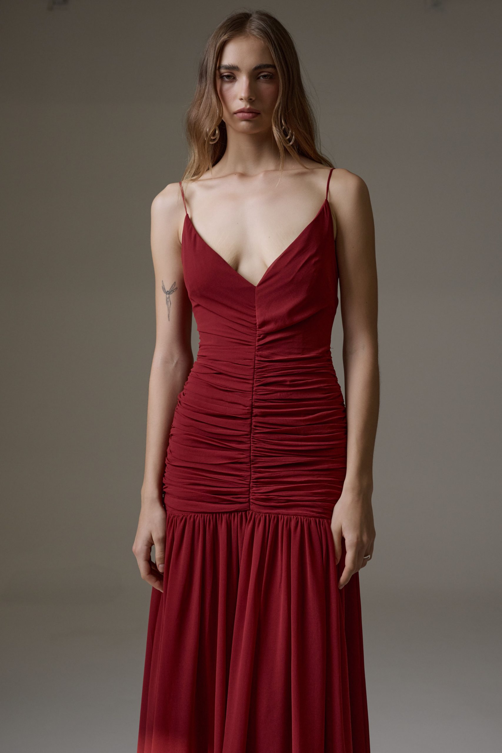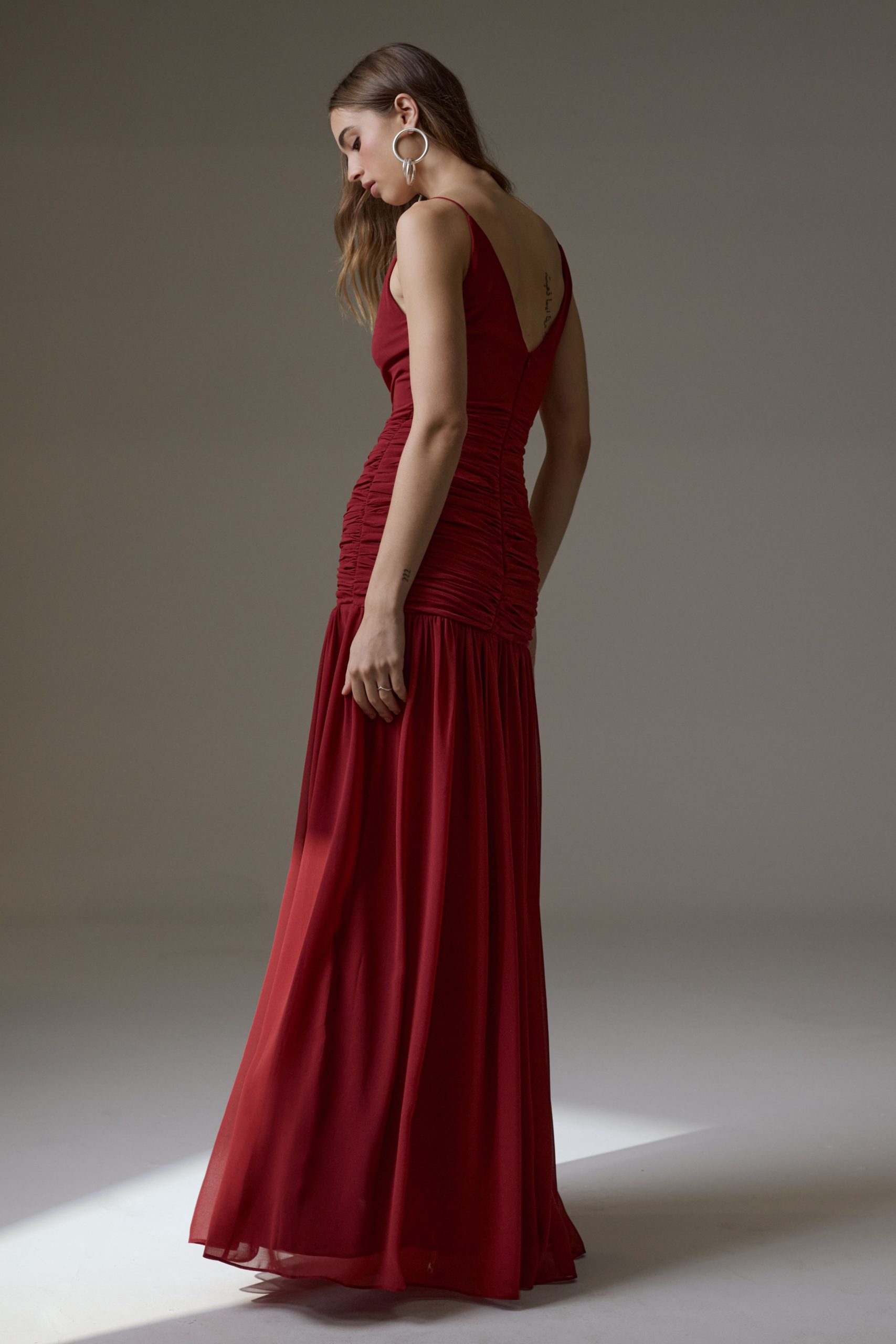 Vestido longo em crepe, todo duplo. Modelo com decote em V com a parte superior toda drapeada frente e costas. Saia com caimento reto fluído. Possui fechamento de zíper invisível nas costas.