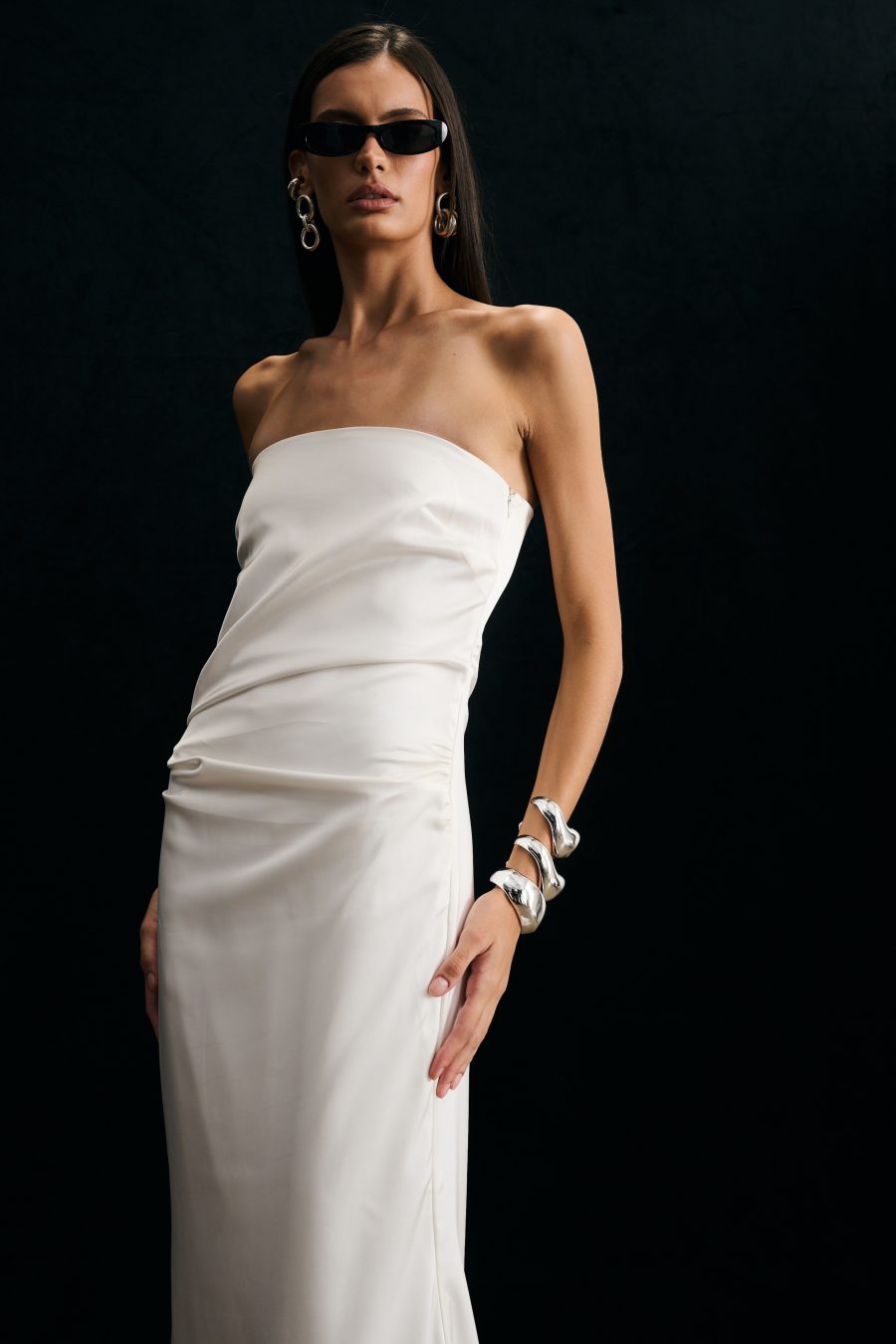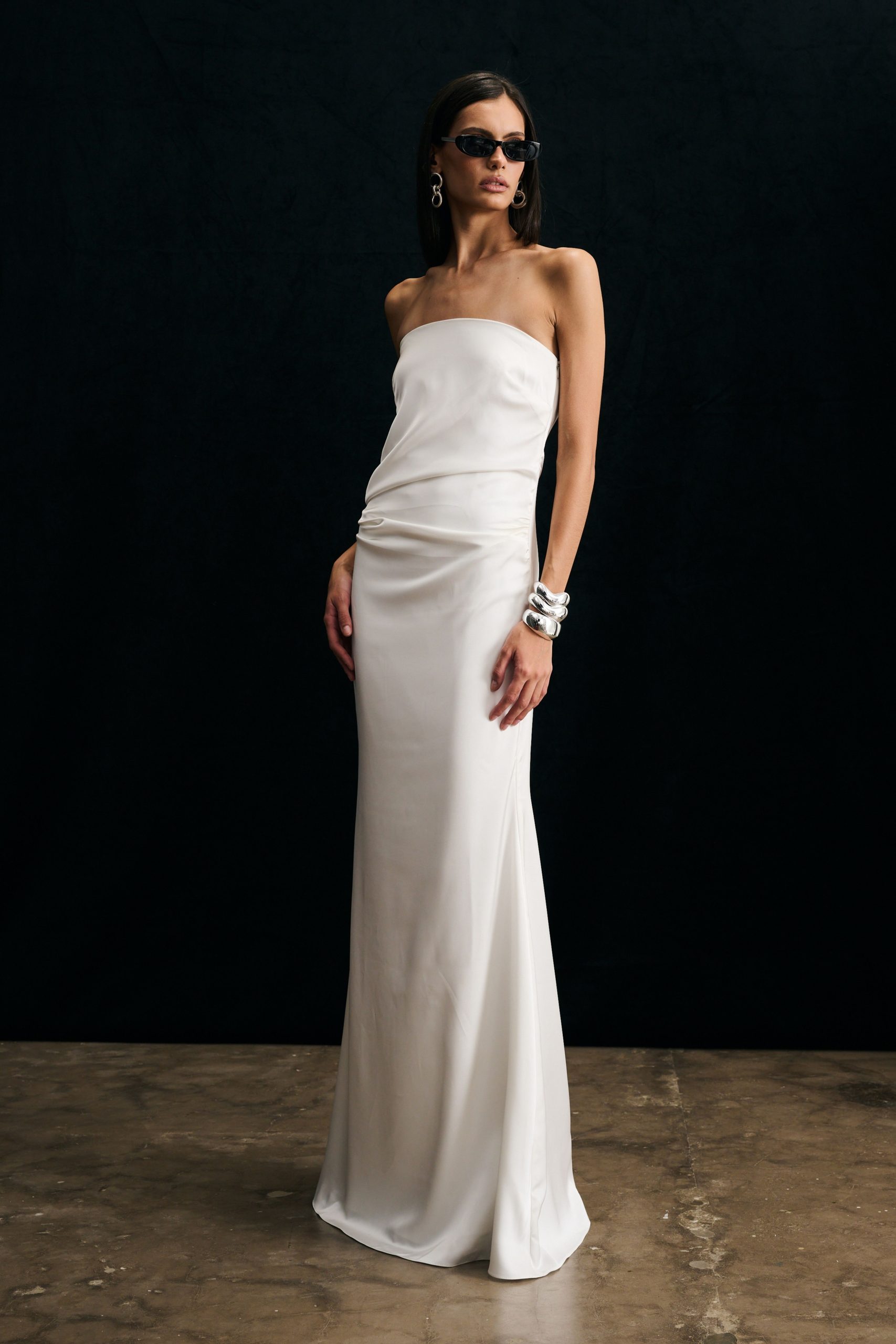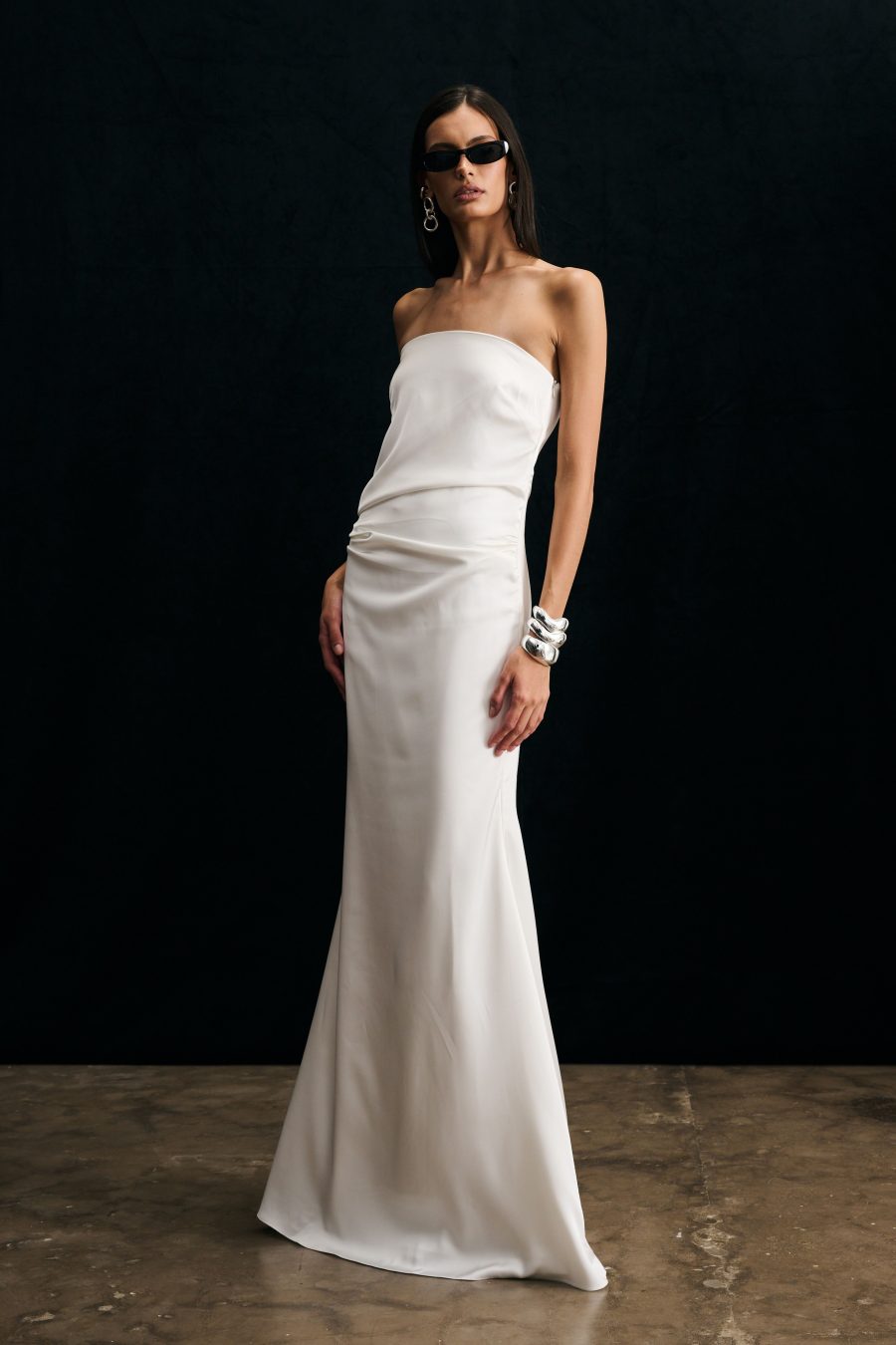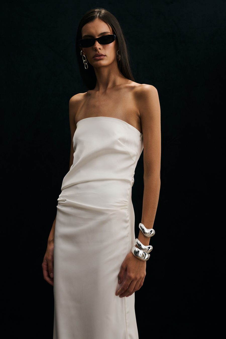 Vestido longo de cetim off white. Decote tomara-que-caia realça o busto e as costas, e drapeado na lateral que modela a silhueta. Possui zíper invisível na lateral.
