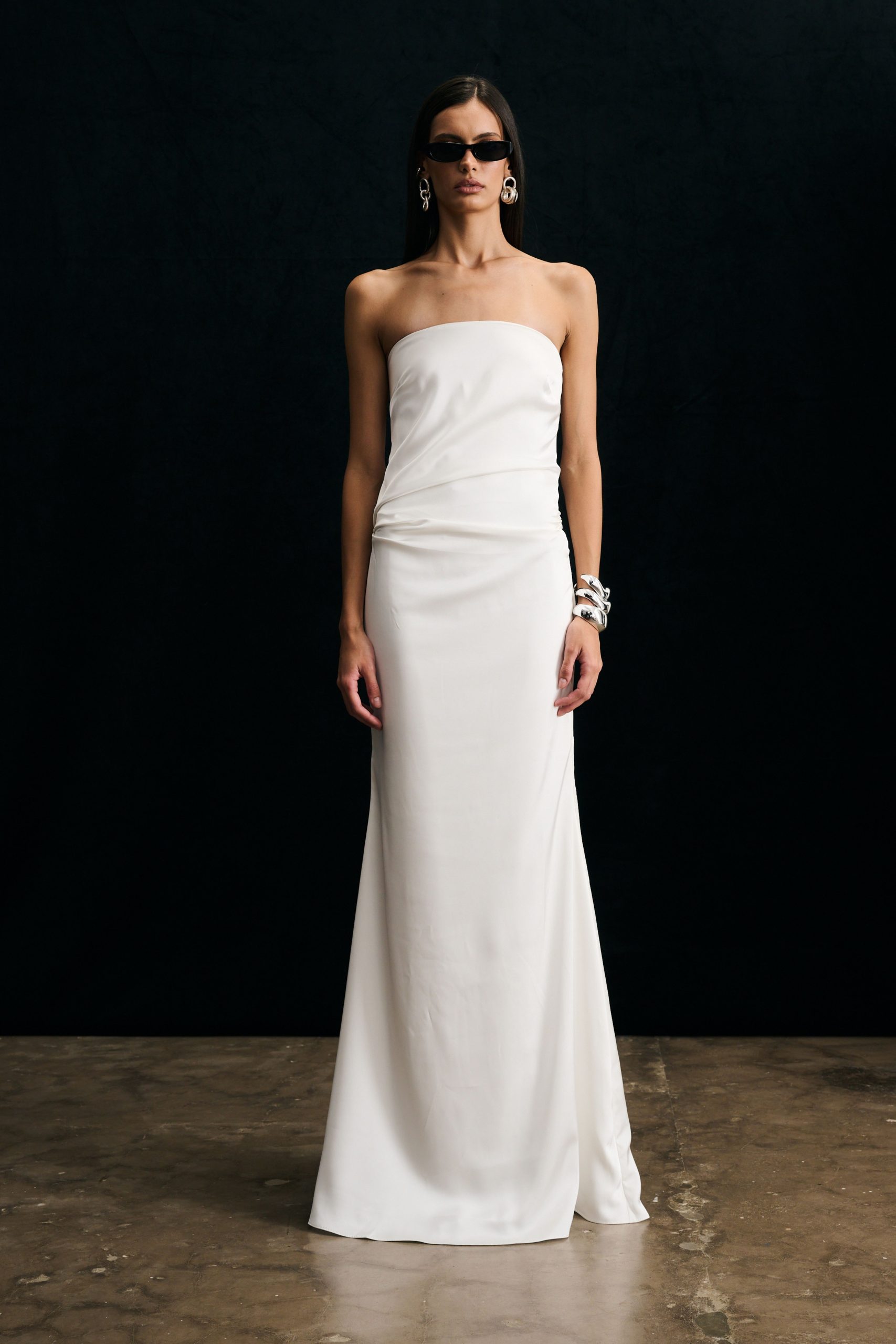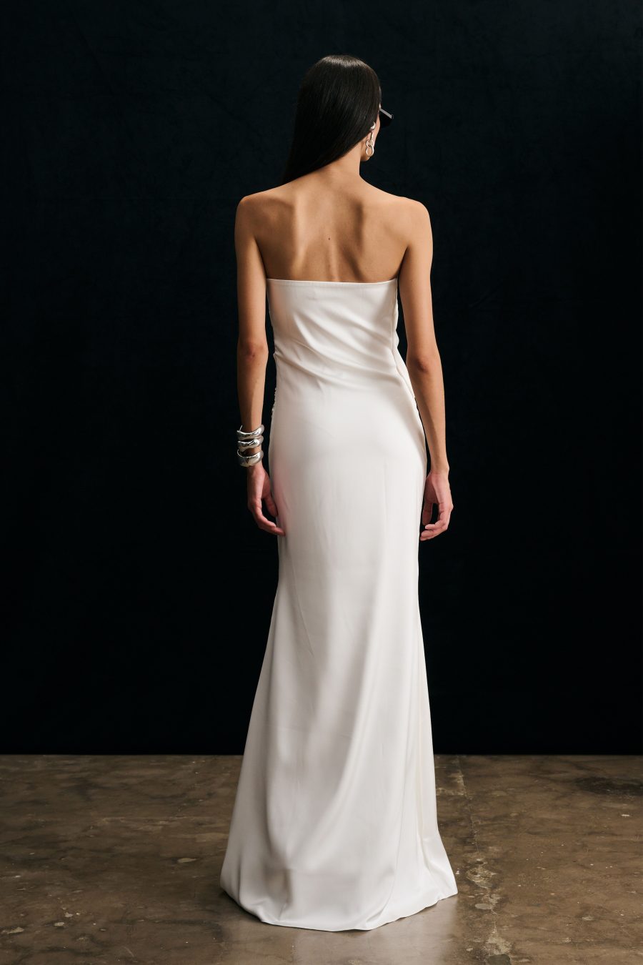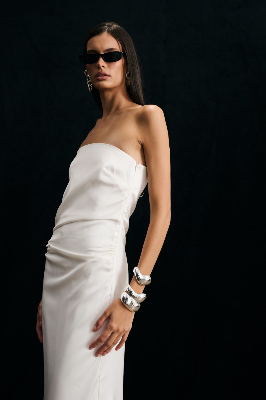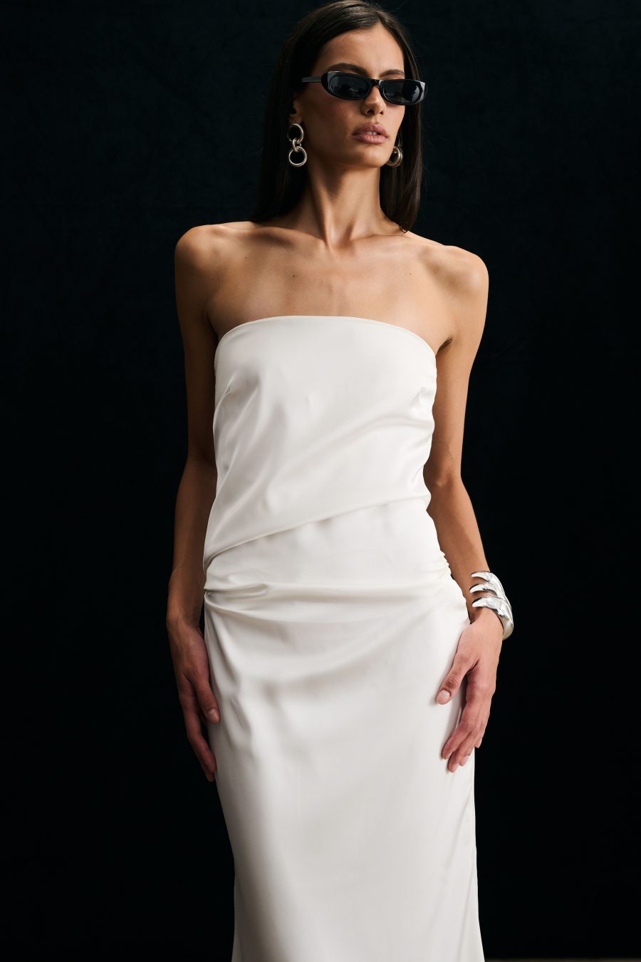 Vestido longo de cetim off white. Decote tomara-que-caia realça o busto e as costas, e drapeado na lateral que modela a silhueta. Possui zíper invisível na lateral.