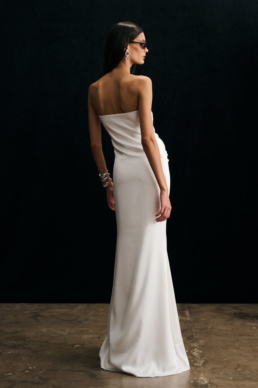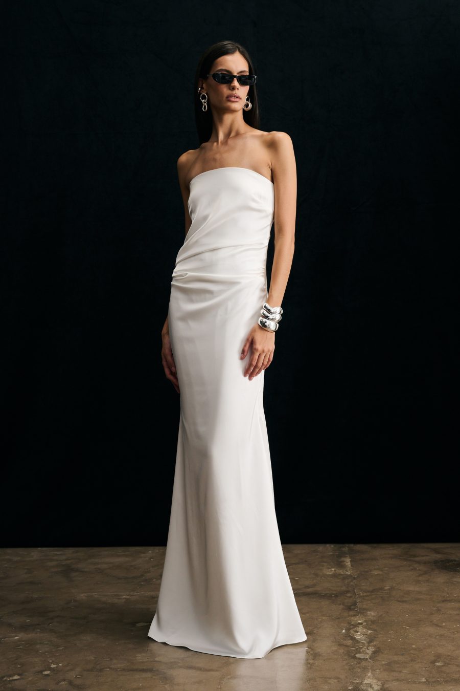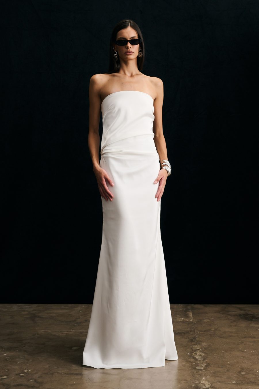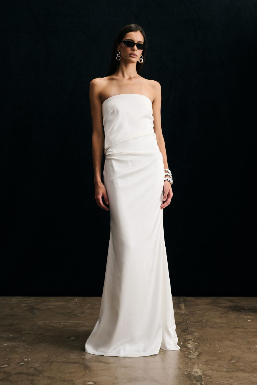 Vestido longo de cetim off white. Decote tomara-que-caia realça o busto e as costas, e drapeado na lateral que modela a silhueta. Possui zíper invisível na lateral.