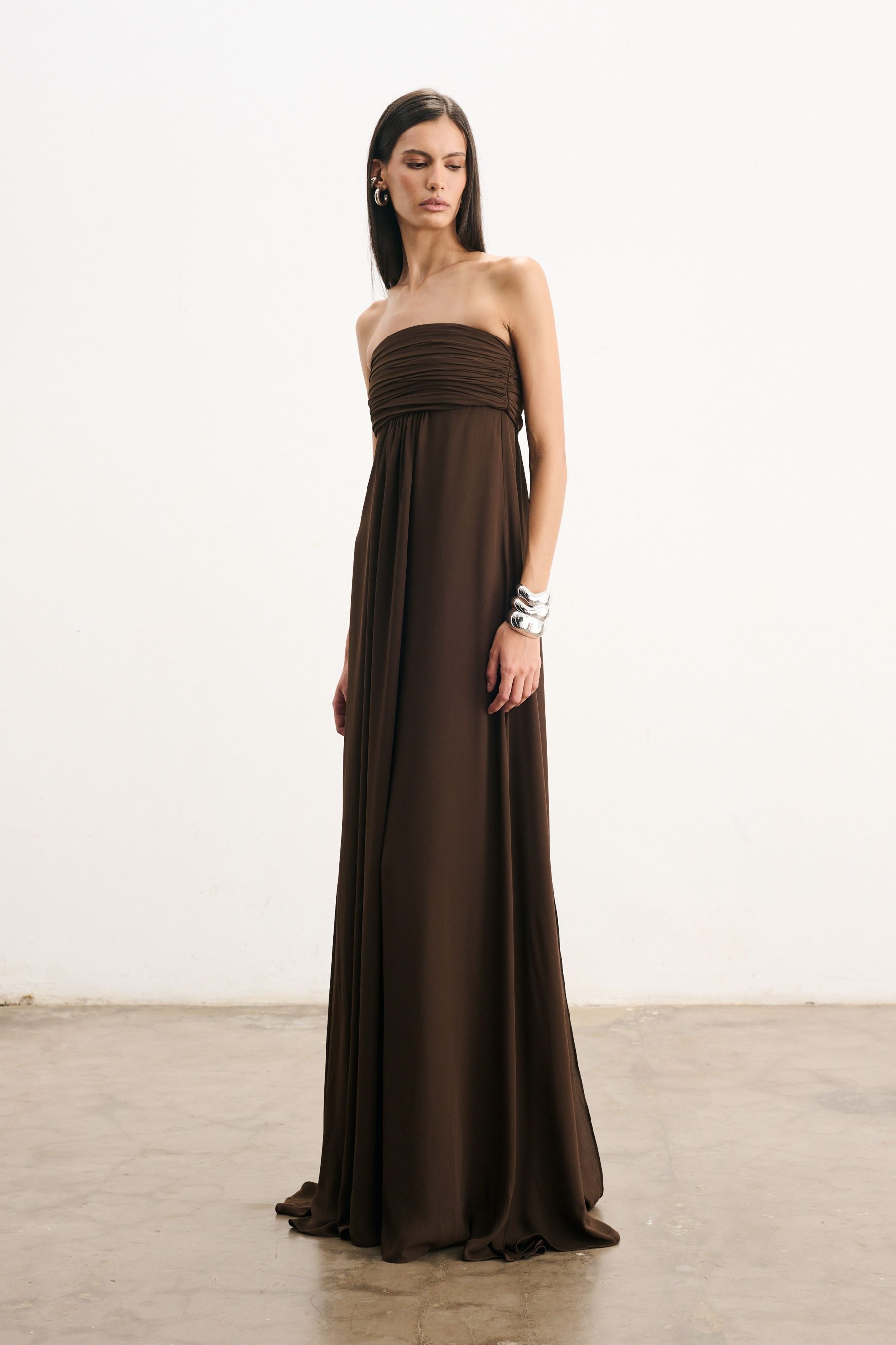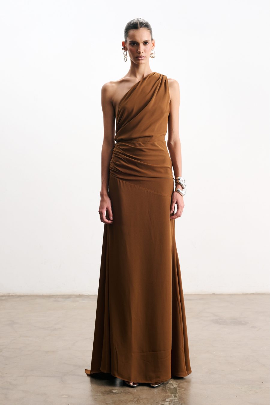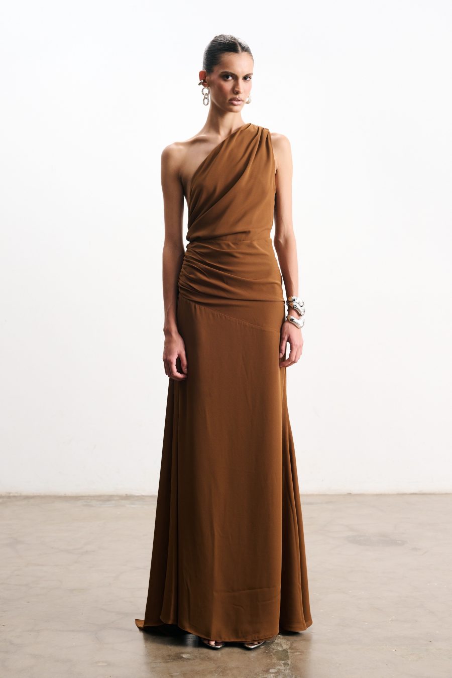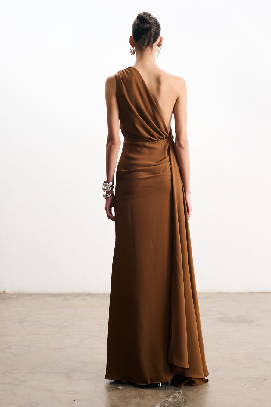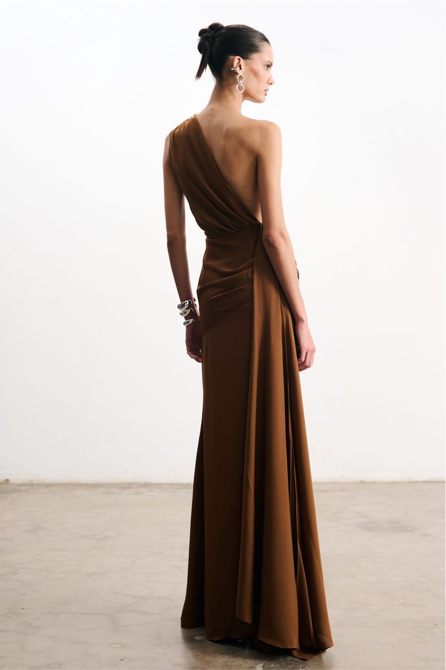 Vestido em musseline marrom, com alça única e decote de um ombro só. O detalhe drapeado na lateral valoriza a silhueta e adiciona movimento ao caimento, enquanto as costas abertas trazem sensualidade com sofisticação. Amarração lateral que cria uma cauda fluida e traz ainda mais presença à peça.