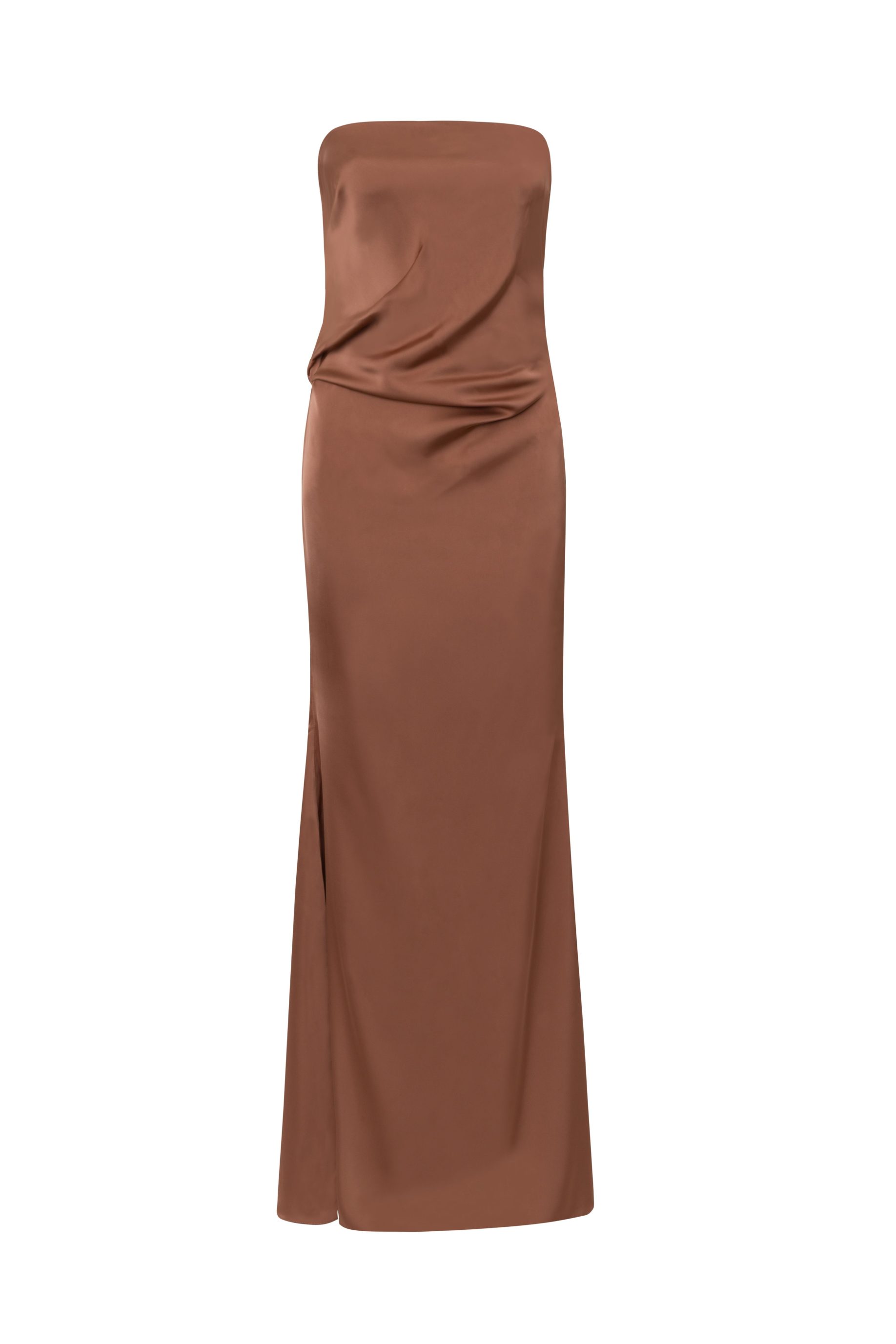 R$1.398,00 6 x R$233,00Vestido longo de musseline na cor marrom, com forro embutido de crepe, e modelagem ampla. Possui decote tomara que caia com detalhes de pregas. Fechamento nas costas com zíper invisível e cauda