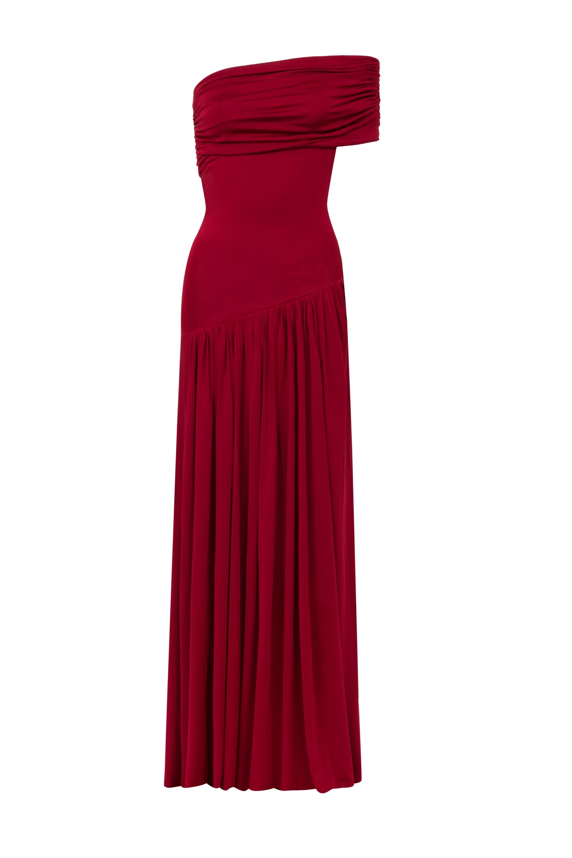 Vestido longo em Jersey de viscose off-white, todo forrado no mesmo tecido. Com decote assimétrico, o modelo realça o colo e alonga a silhueta com sofisticação.